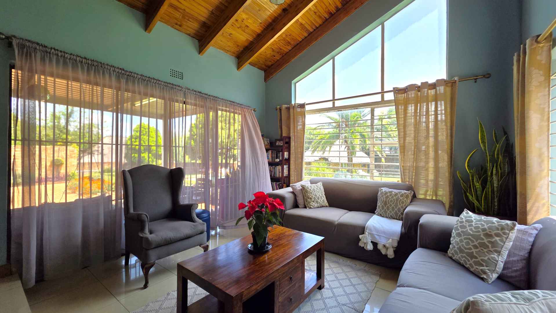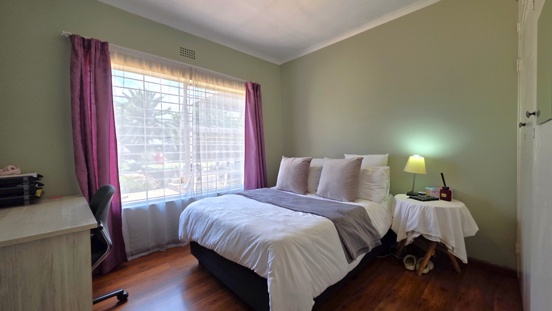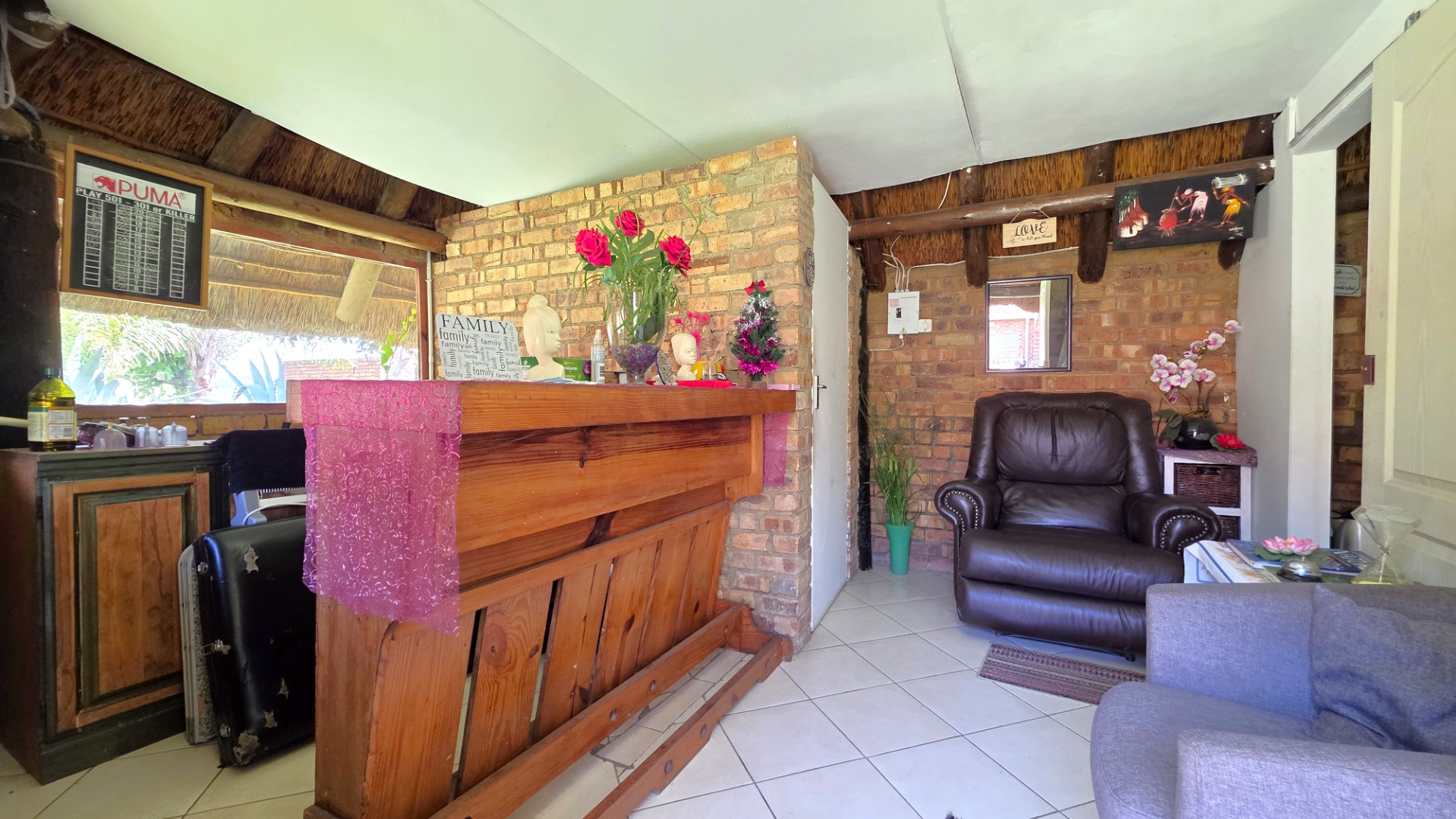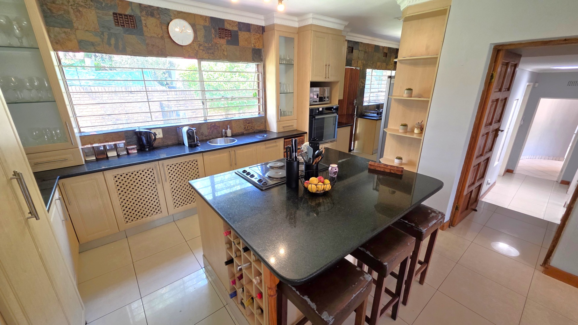 Sliding doors lead from the open-plan area to a covered patio overlooking a lush garden and sparkling swimming pool—perfect for relaxed weekends and hosting guests. The outdoor space is further enhanced by an enclosed entertainment lapa, creating an inviting entertainment area for all seasons. The lapa is currently utilized as a cottage, using dry-walling to create a bedroom with separate small living space, and separate toilet with basin.