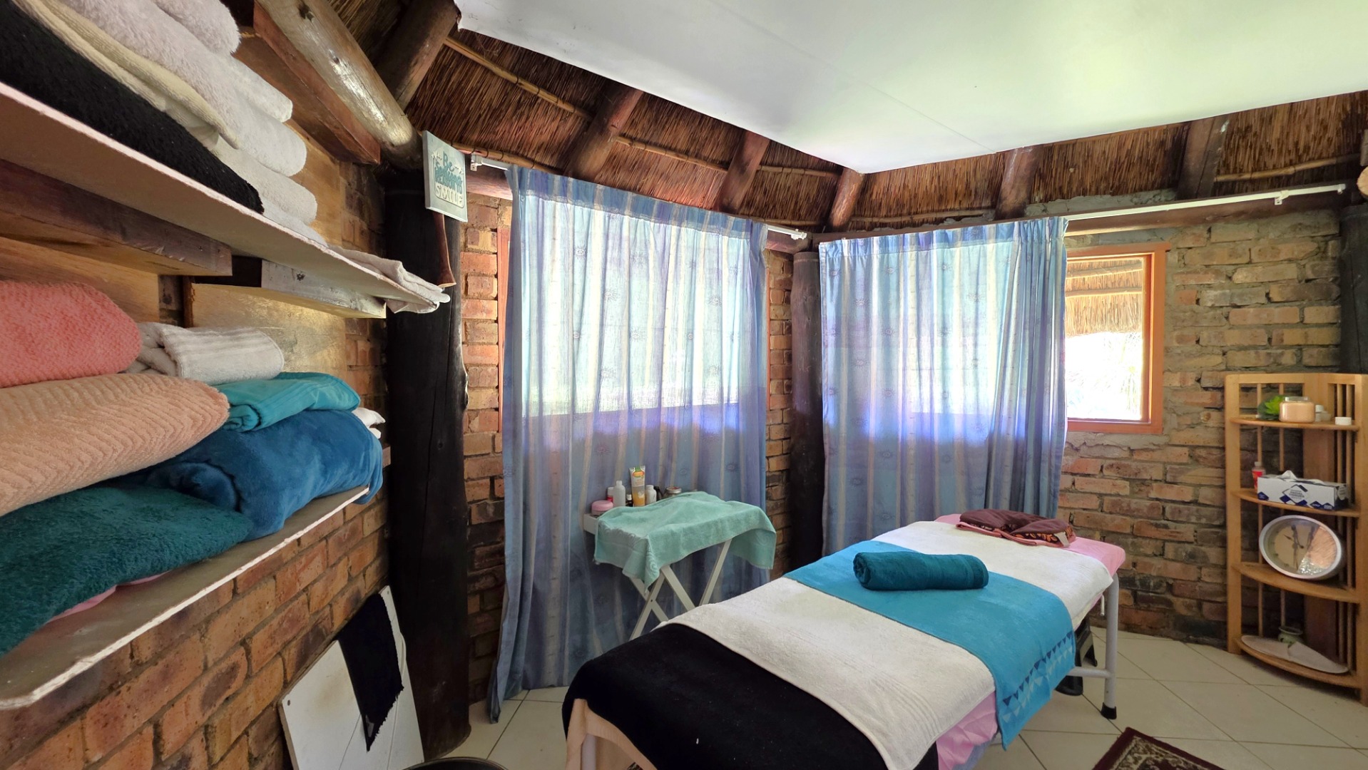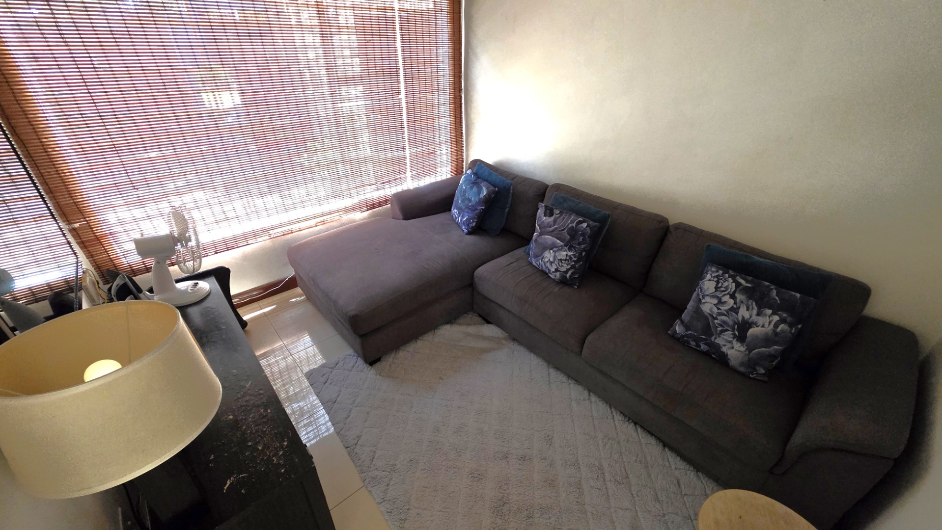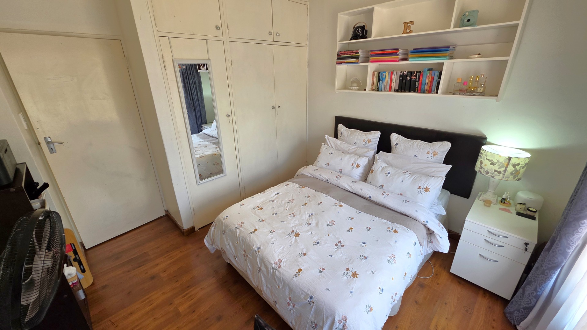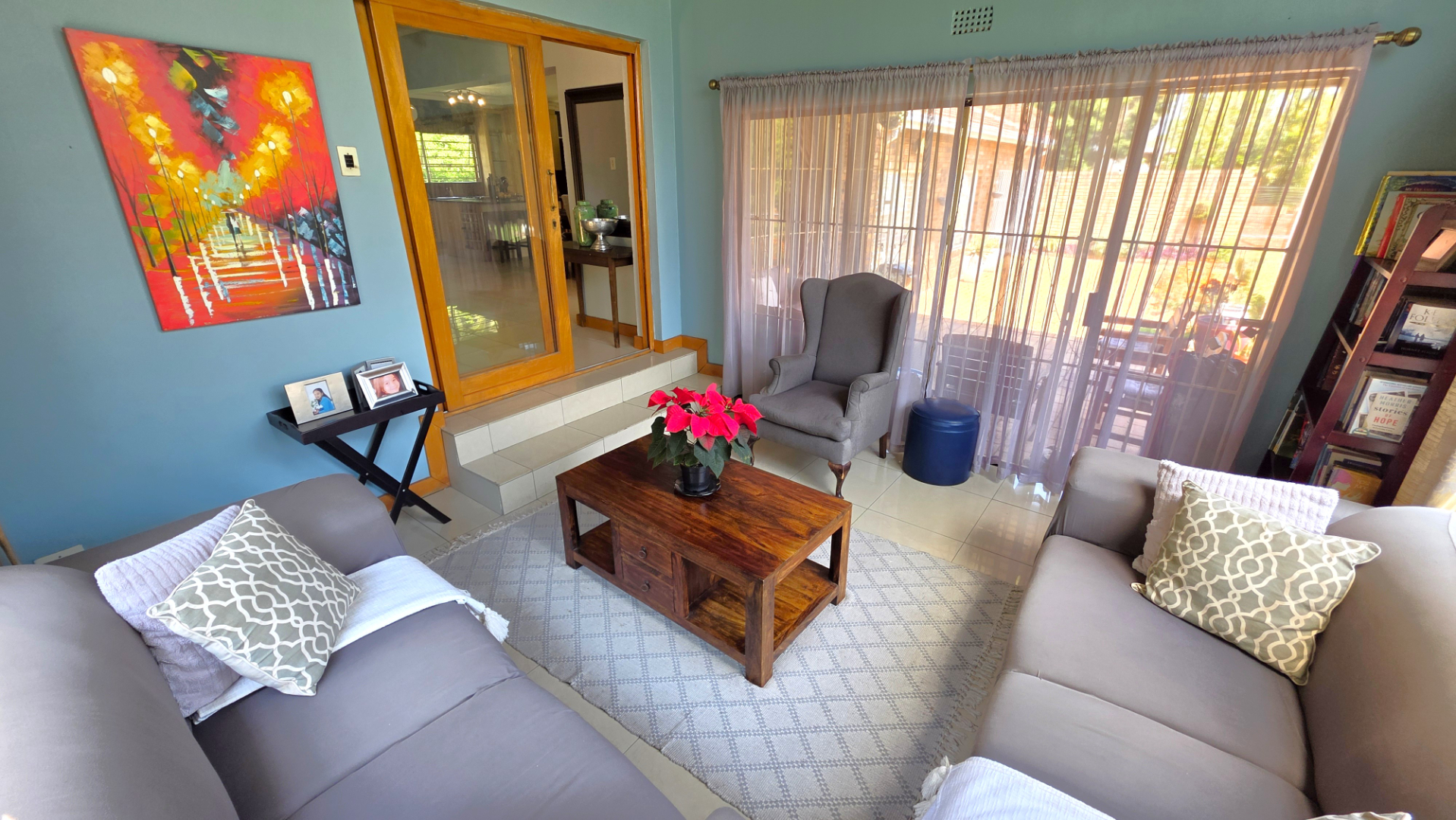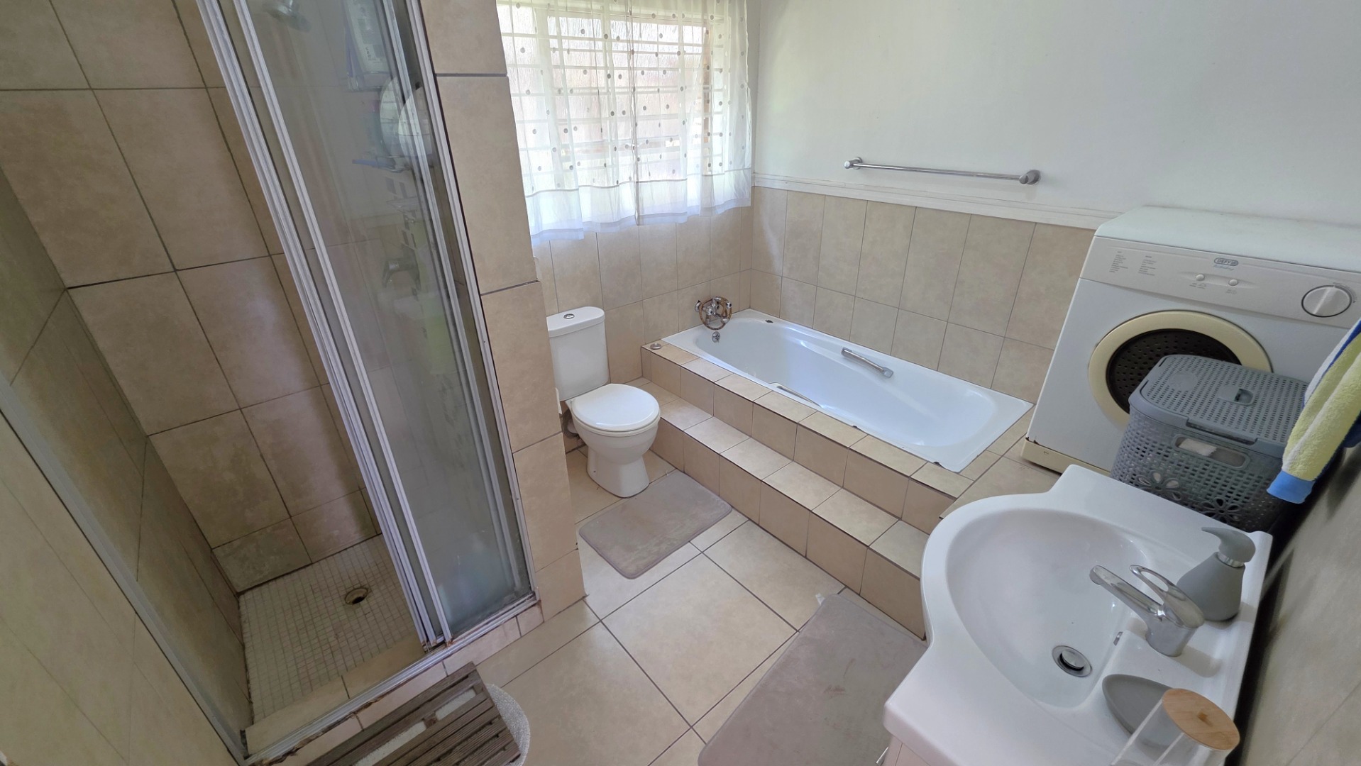 Sliding doors lead from the open-plan area to a covered patio overlooking a lush garden and sparkling swimming pool—perfect for relaxed weekends and hosting guests. The outdoor space is further enhanced by an enclosed entertainment lapa, creating an inviting entertainment area for all seasons. The lapa is currently utilized as a cottage, using dry-walling to create a bedroom with separate small living space, and separate toilet with basin.