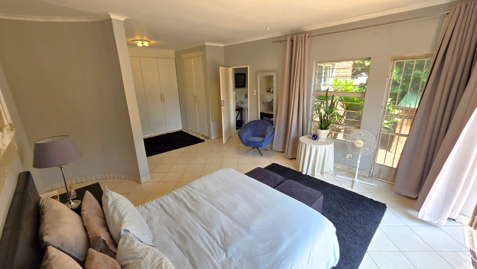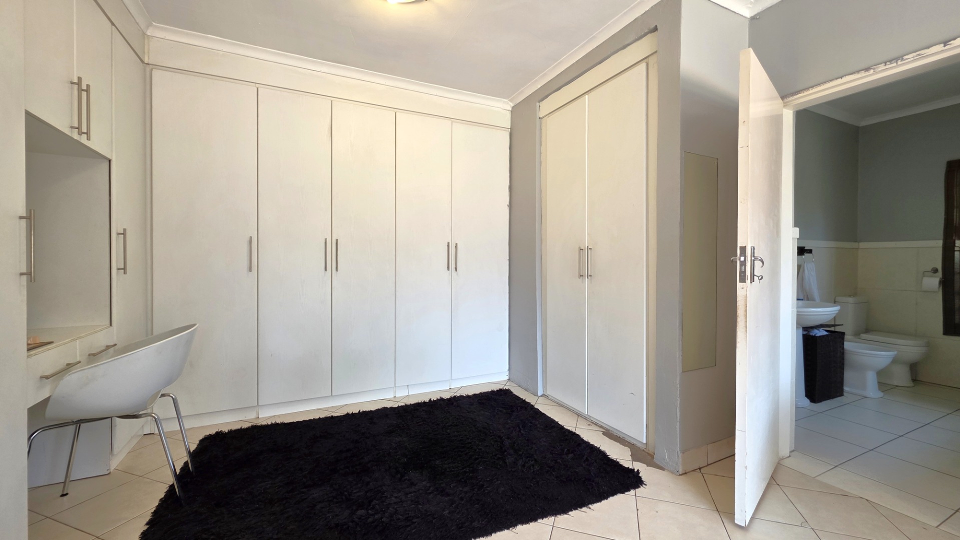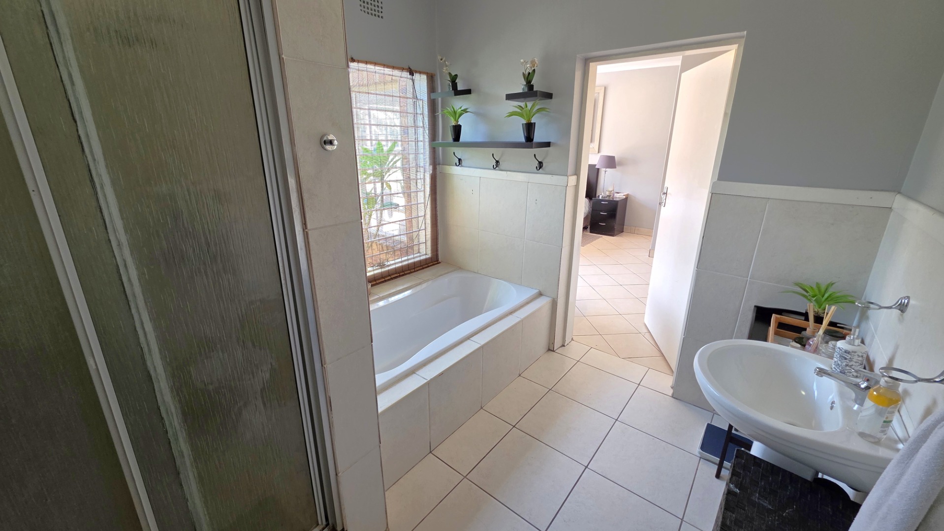 The main home offers three spacious bedrooms with built-in cupboards. The main bedroom is a standout feature, boasting ample space, with a dressing room, a full en-suite bathroom, and sliding doors that open directly onto the patio, garden and pool area—your own private retreat. A full family bathroom services the remaining bedrooms.