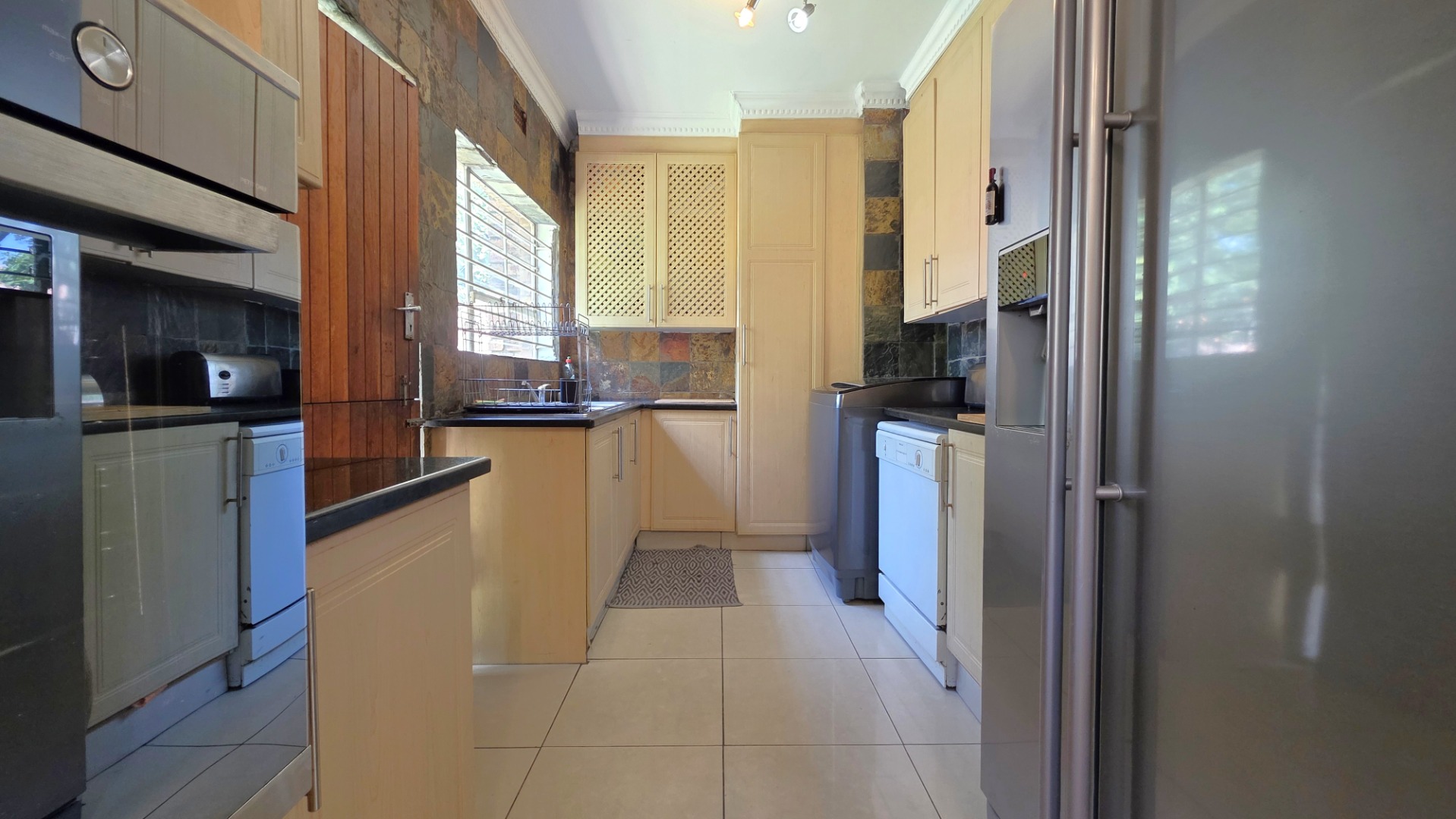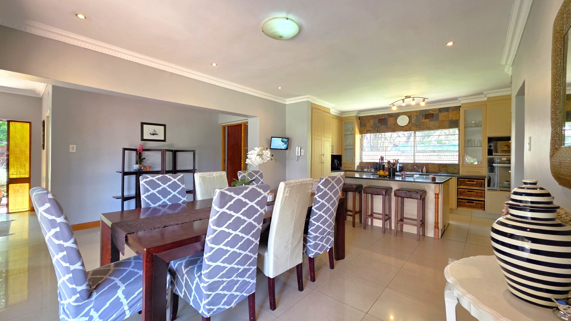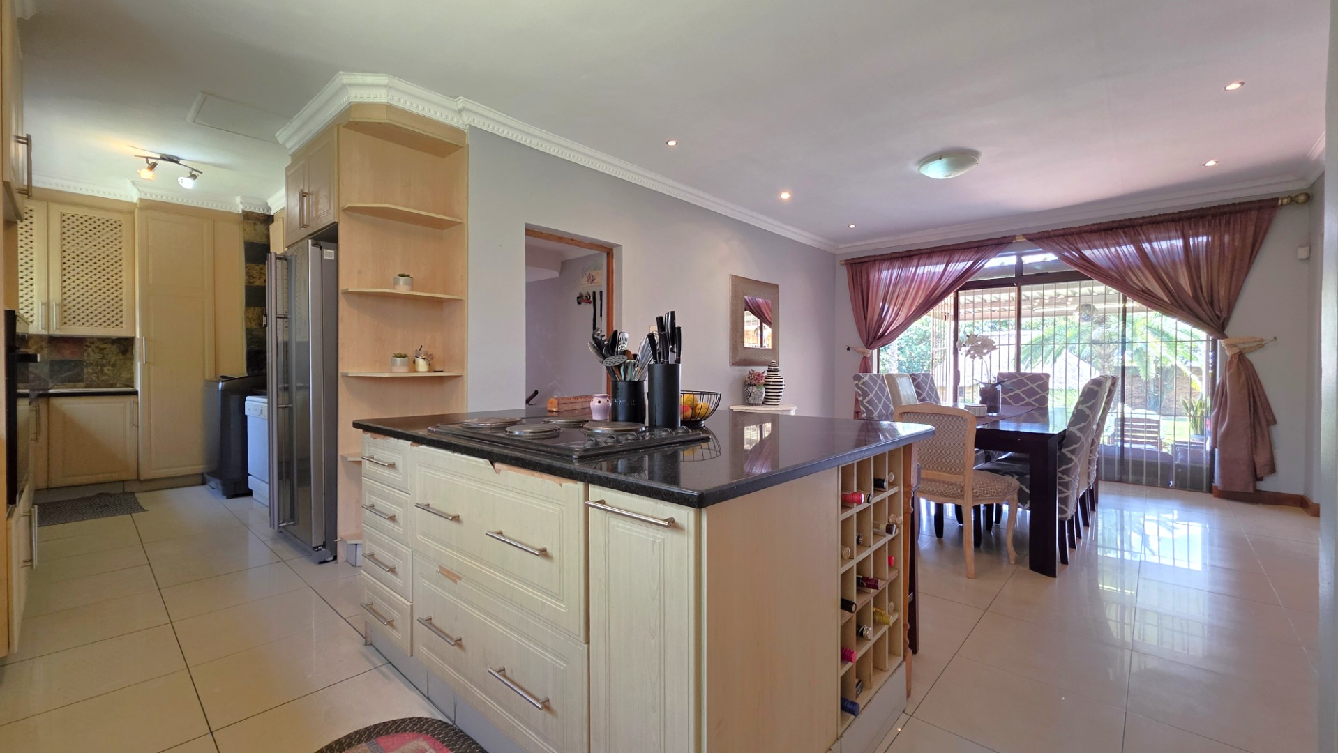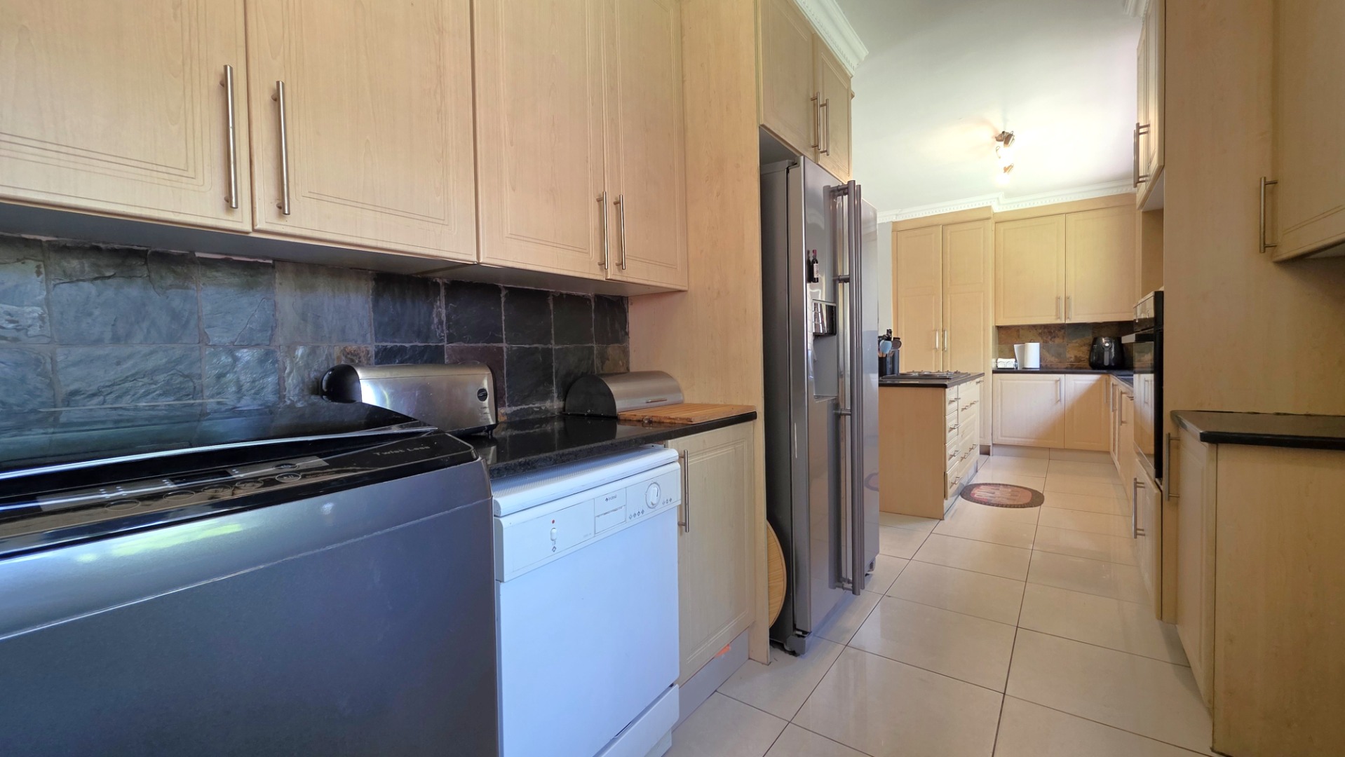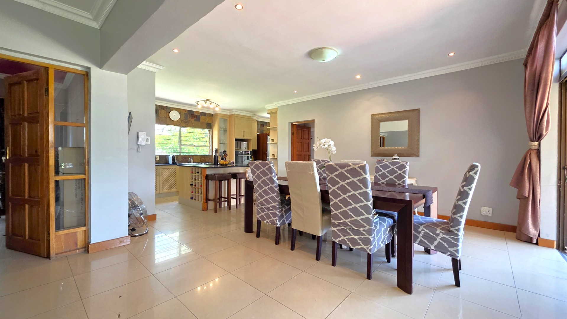 The heart of the home unfolds into a large open-plan living area featuring a contemporary kitchen with elegant built-in cupboards and a generous centre island. Designed for convenience and functionality, the kitchen comfortably accommodates a double-door fridge, with a scullery that accommodates two under-counter appliances and ample cupboard space. Seamlessly connected is the dining area, ideal for family meals and entertaining. Another lounge adjoins the living space, which could also be converted into a fourth bedroom if needs be.