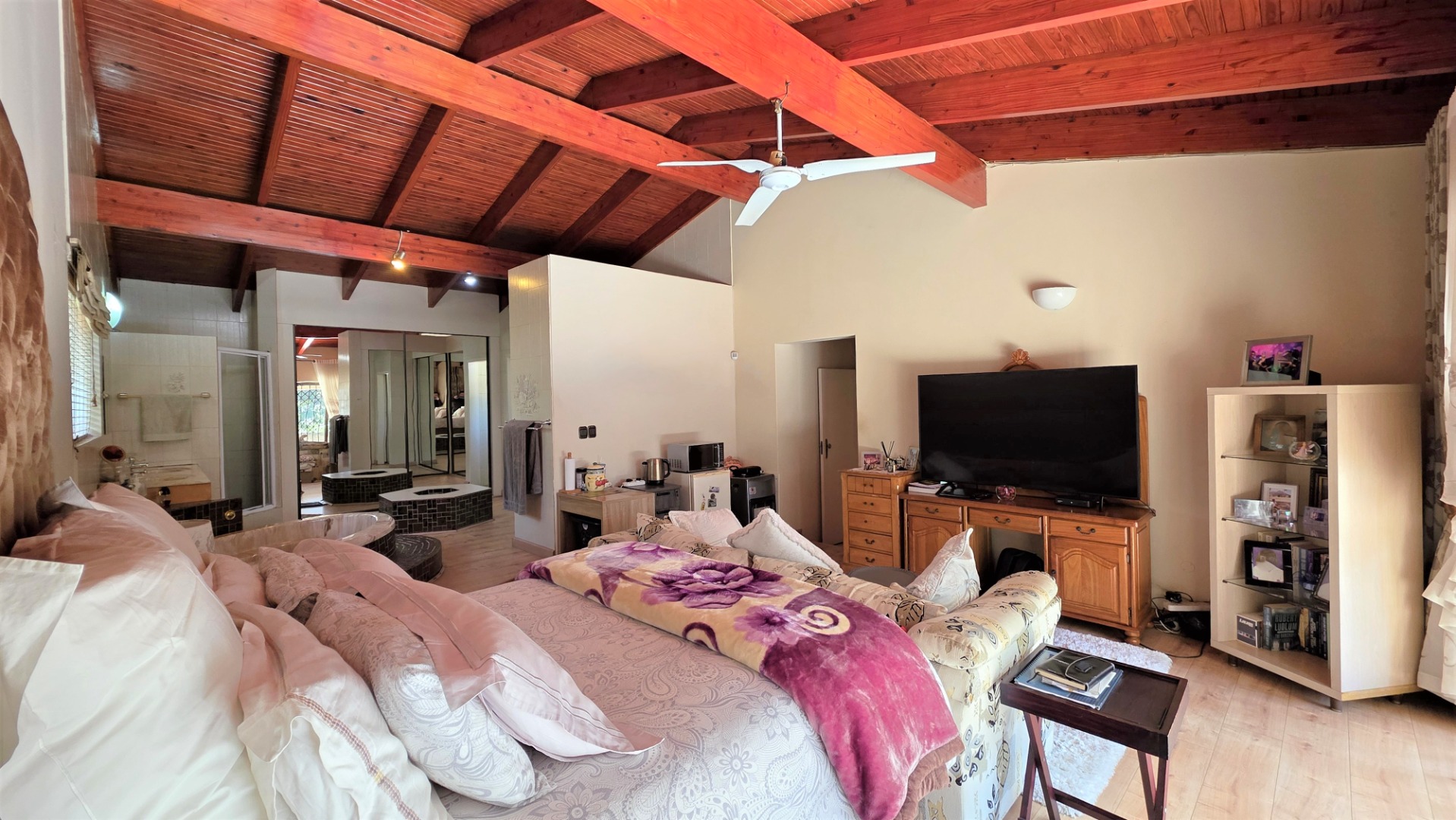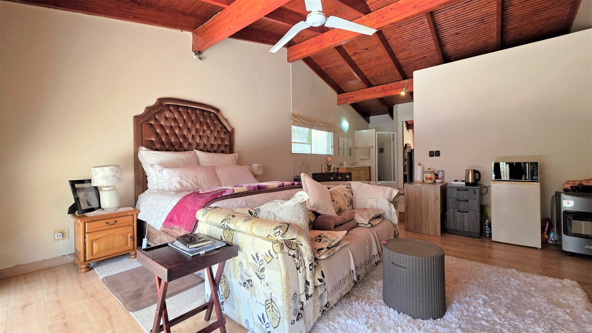 This inviting property offers three spacious bedrooms in the main house, complemented by two full bathrooms as well as a guest toilet. The main bedroom suite is large with statement open-plan bathroom area with central spa-like bath and full dressing room with mirror cupboards offering an abundance of storage space.