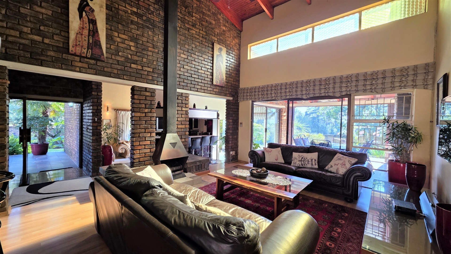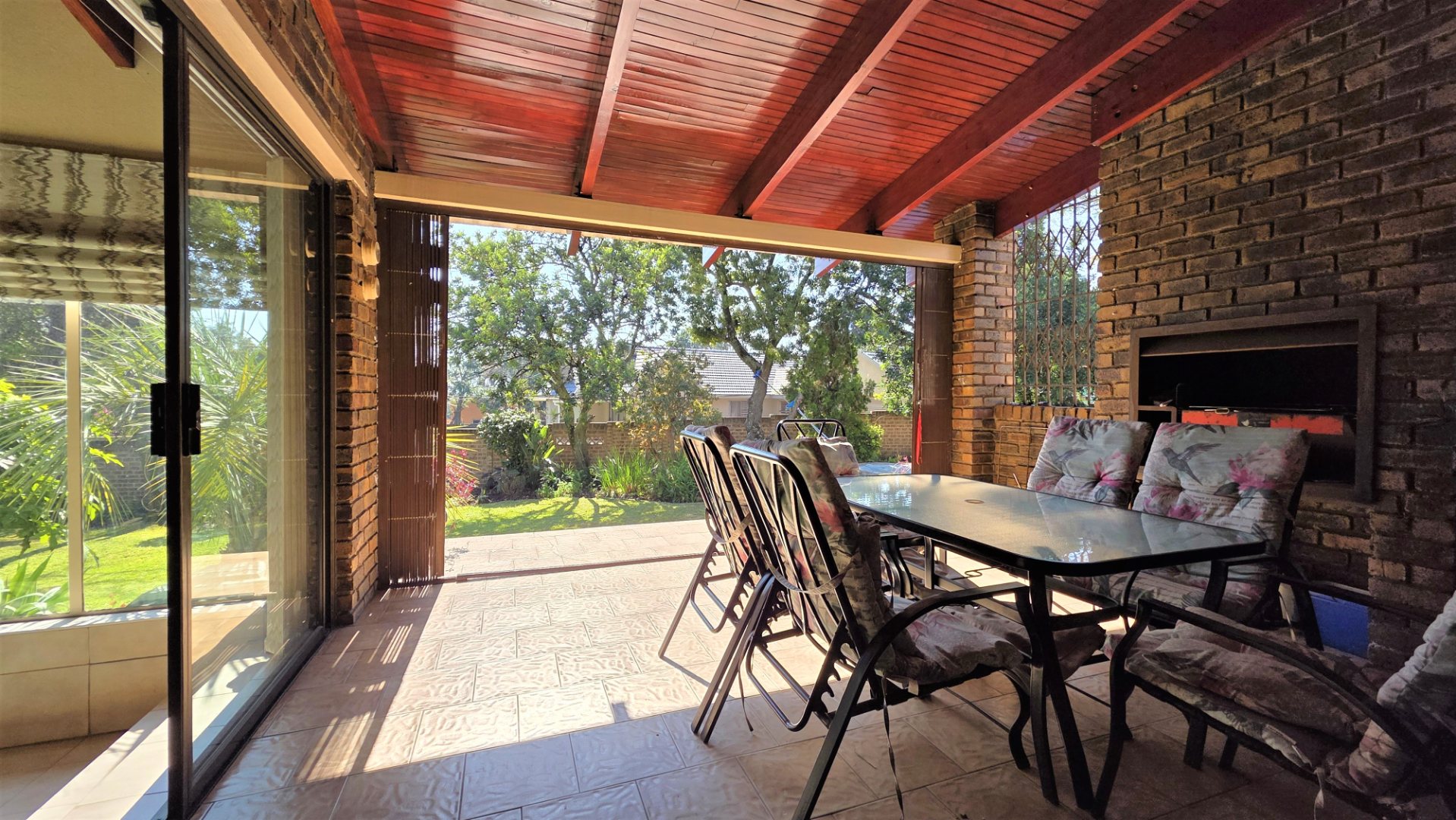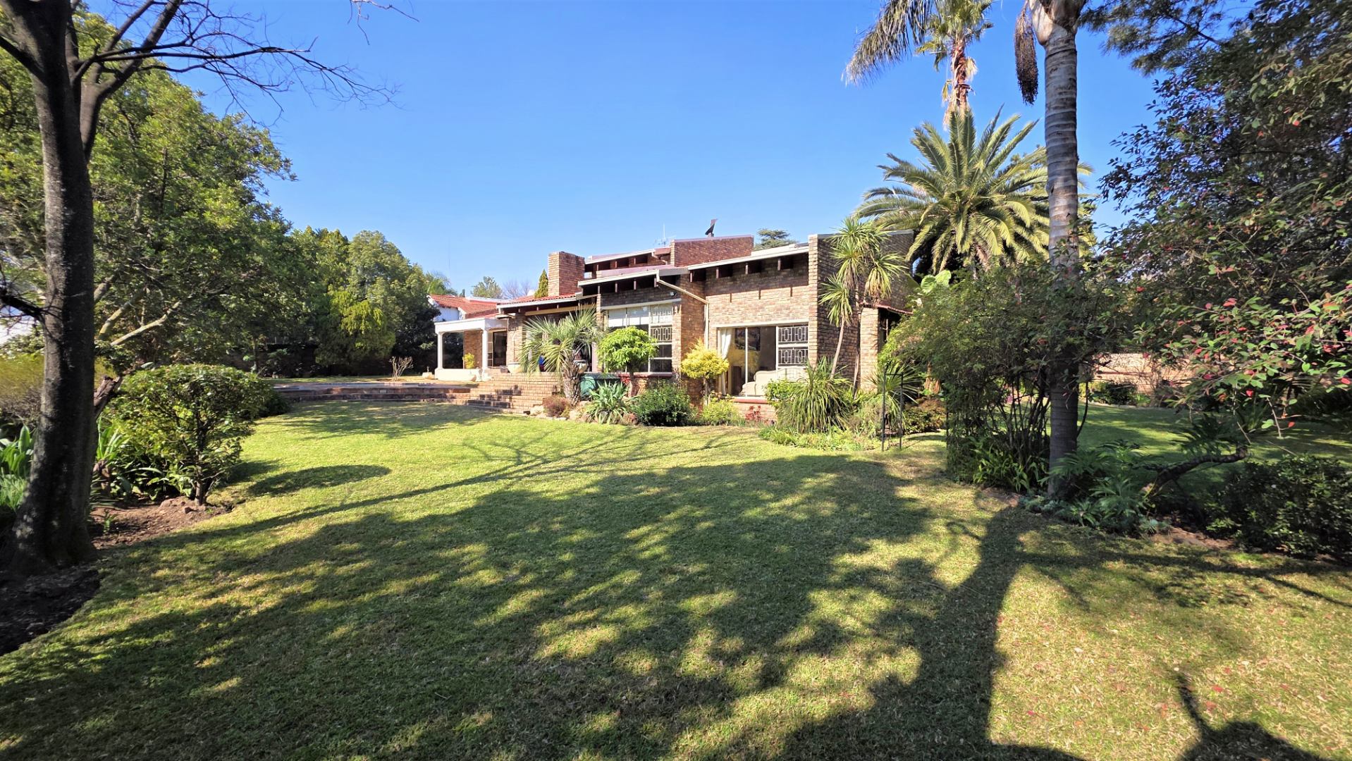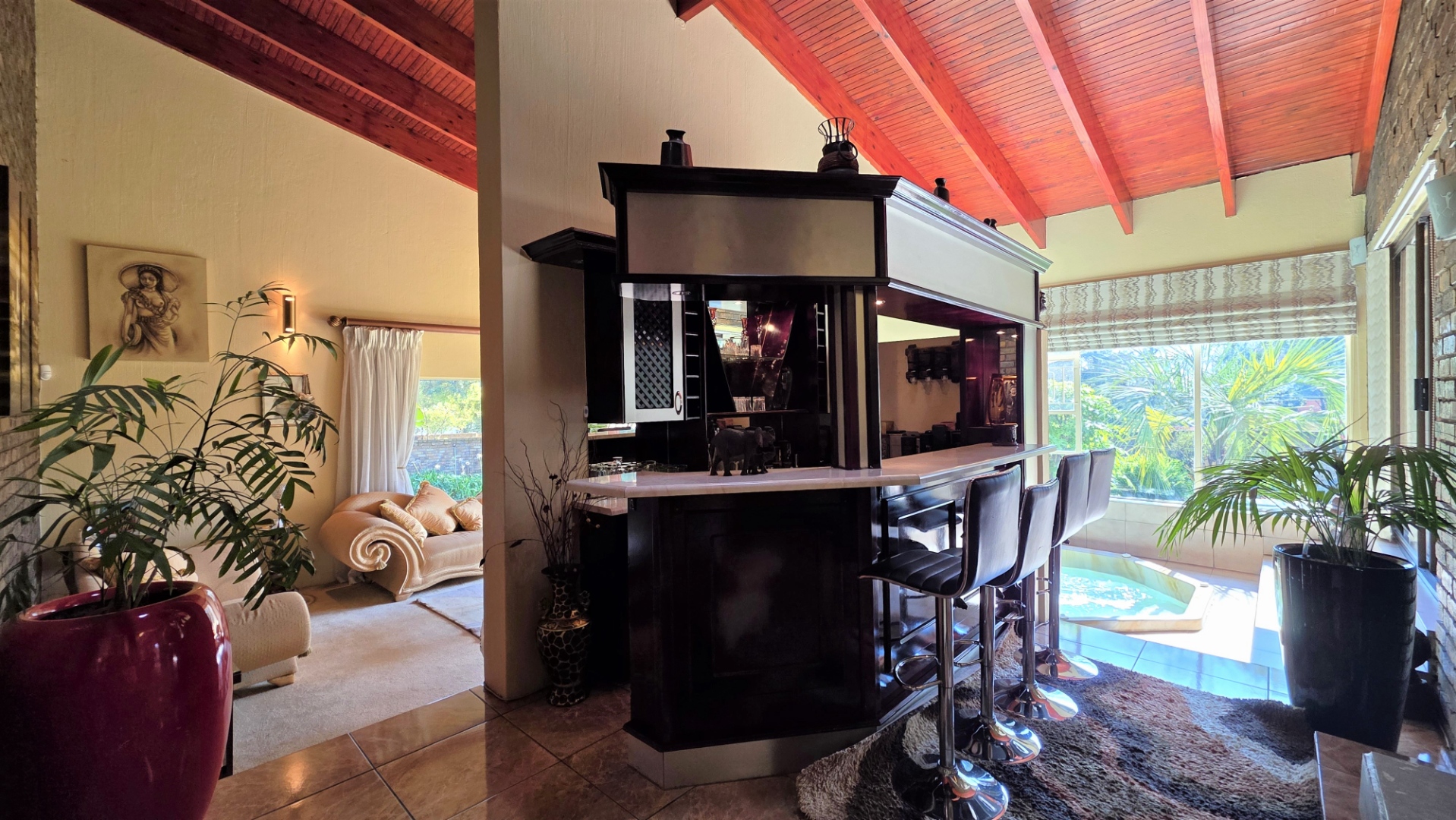 You are welcomed into an inviting spacious open-plan living area, with central fireplace. The elegant high wooden ceilings create a warm and sophisticated ambiance in the dining room, living room, large separate formal lounge, and entertainment areas. An indoor Jacuzzi is positioned alongside a stylish built-in bar, and sets the perfect mood for year-round relaxation and entertaining. The heart of the home is the sizeable contemporary kitchen with centre island, as well as a separate scullery leading to the back garden area. The living spaces open onto a covered patio area with built-in braai. Step outside into a lush established landscaped garden, extending 1604 square meters, that wraps around the property, featuring a sparkling swimming pool for adults, a kiddies' pool, and generous open areas ideal for family functions, weekend picnics, or even photoshoots.