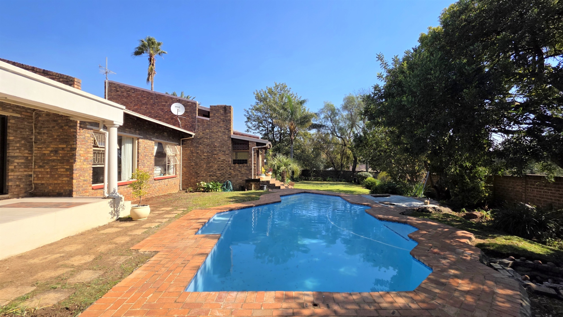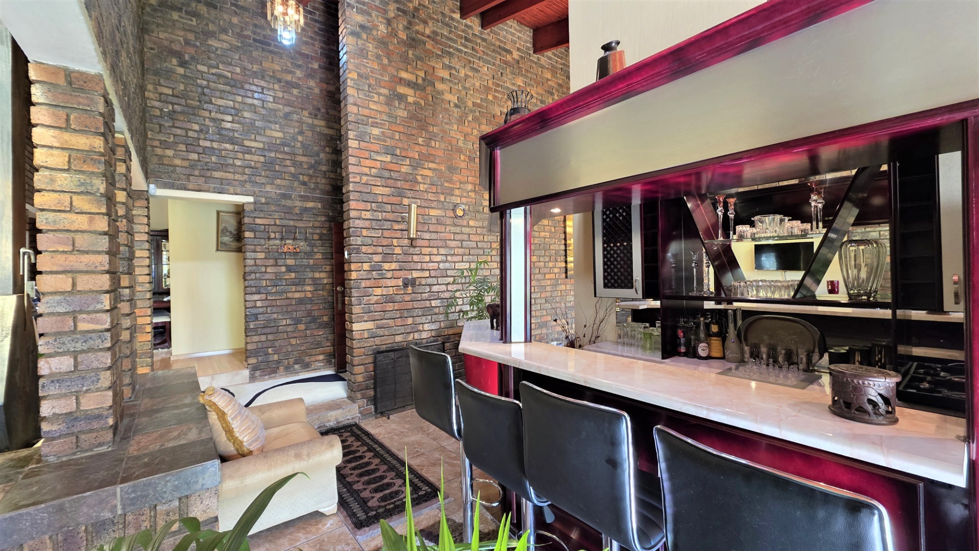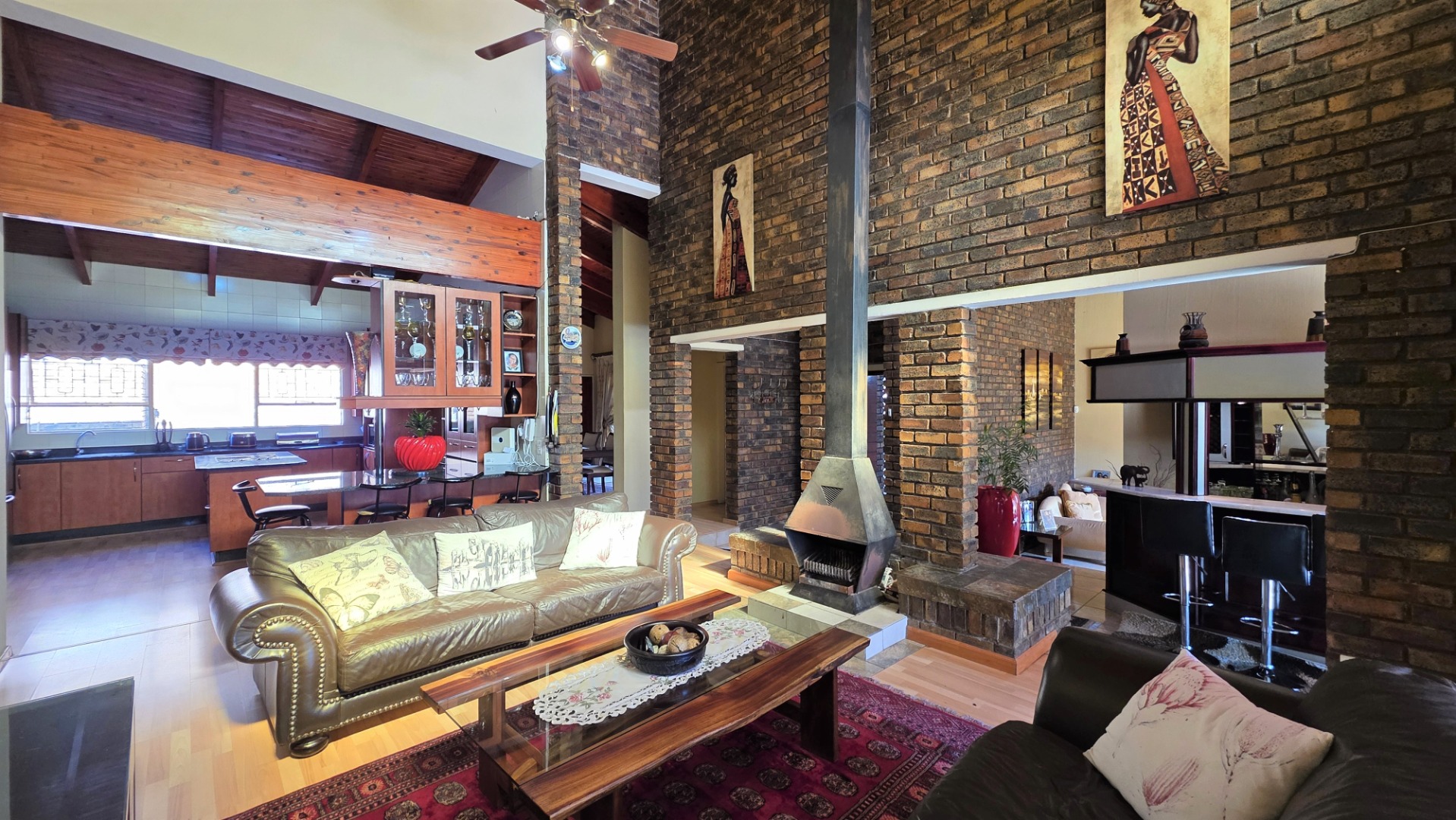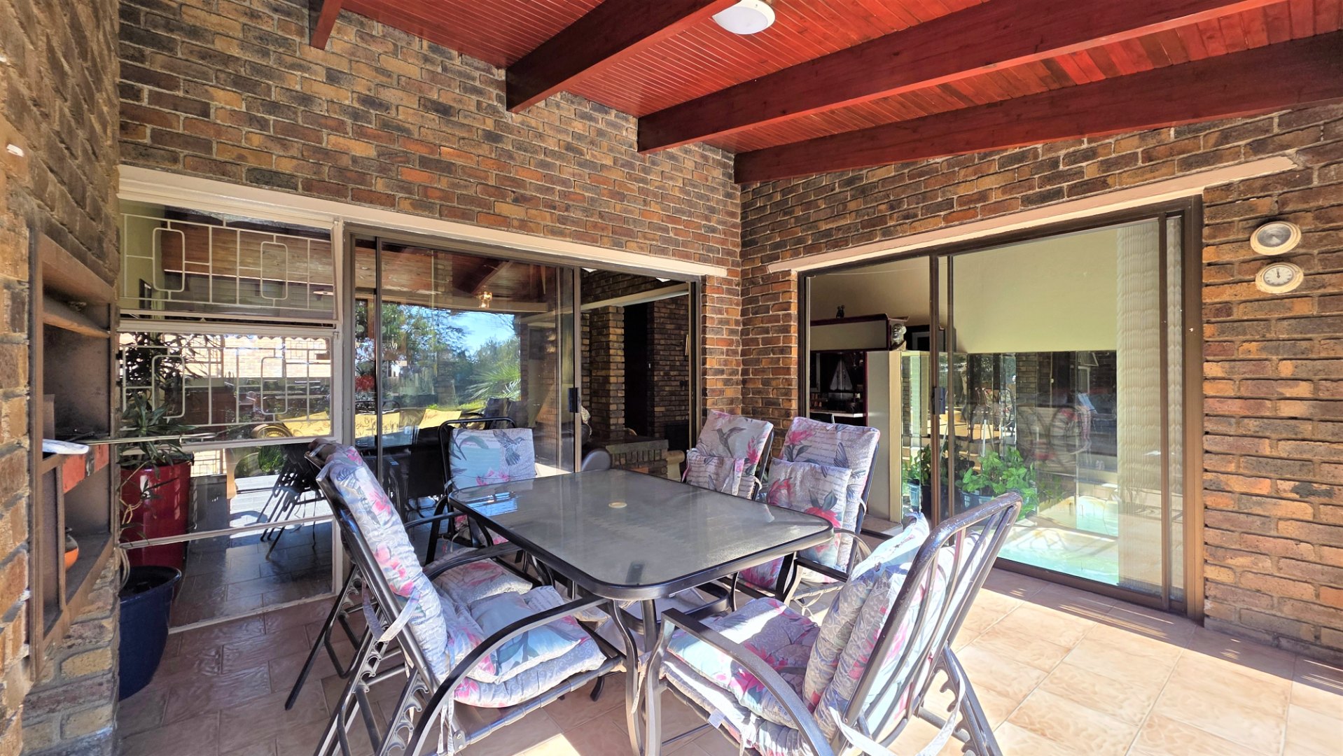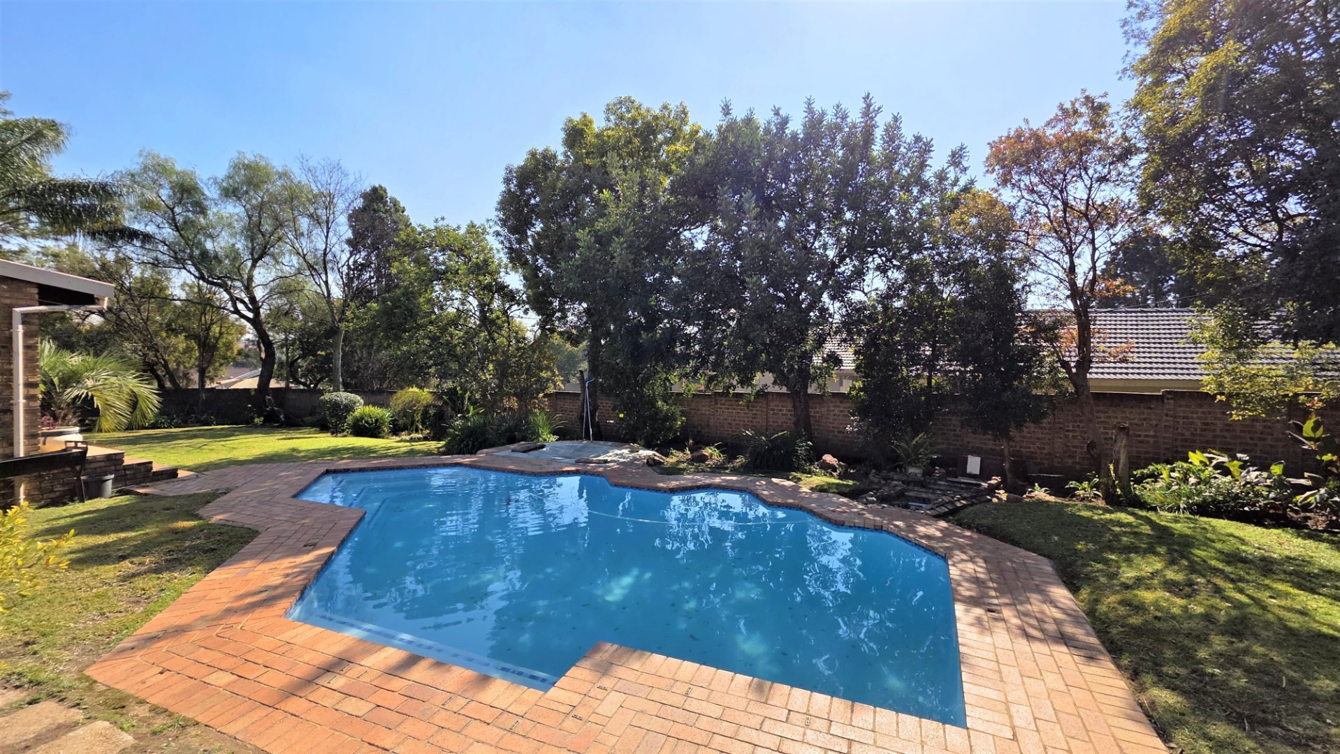 You are welcomed into an inviting spacious open-plan living area, with central fireplace. The elegant high wooden ceilings create a warm and sophisticated ambiance in the dining room, living room, large separate formal lounge, and entertainment areas. An indoor Jacuzzi is positioned alongside a stylish built-in bar, and sets the perfect mood for year-round relaxation and entertaining. The heart of the home is the sizeable contemporary kitchen with centre island, as well as a separate scullery leading to the back garden area. The living spaces open onto a covered patio area with built-in braai. Step outside into a lush established landscaped garden, extending 1604 square meters, that wraps around the property, featuring a sparkling swimming pool for adults, a kiddies' pool, and generous open areas ideal for family functions, weekend picnics, or even photoshoots.