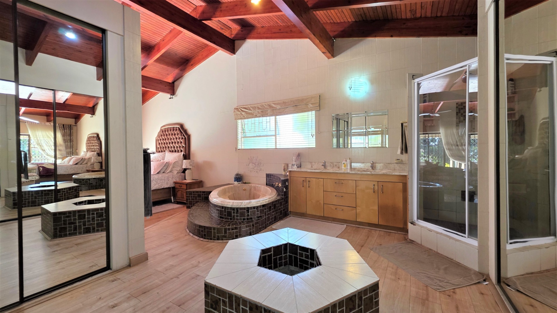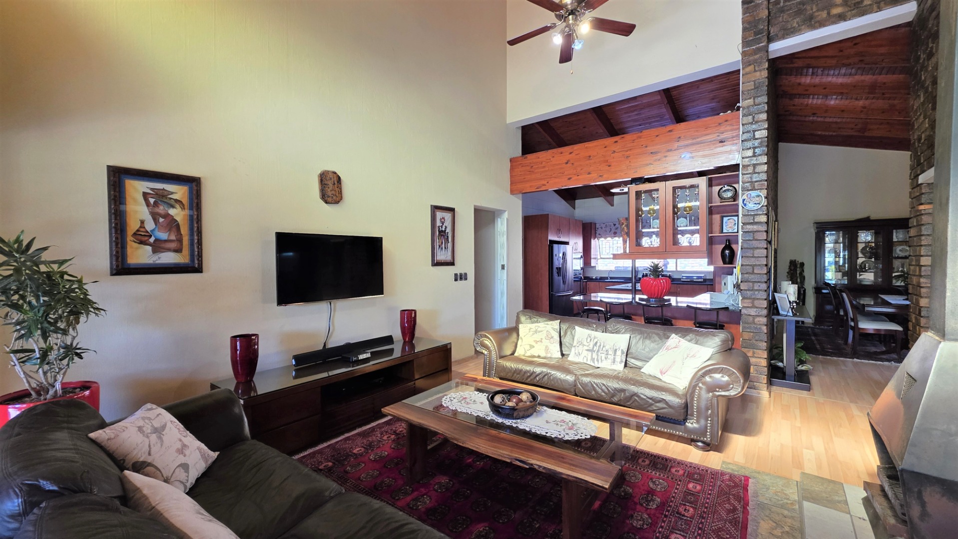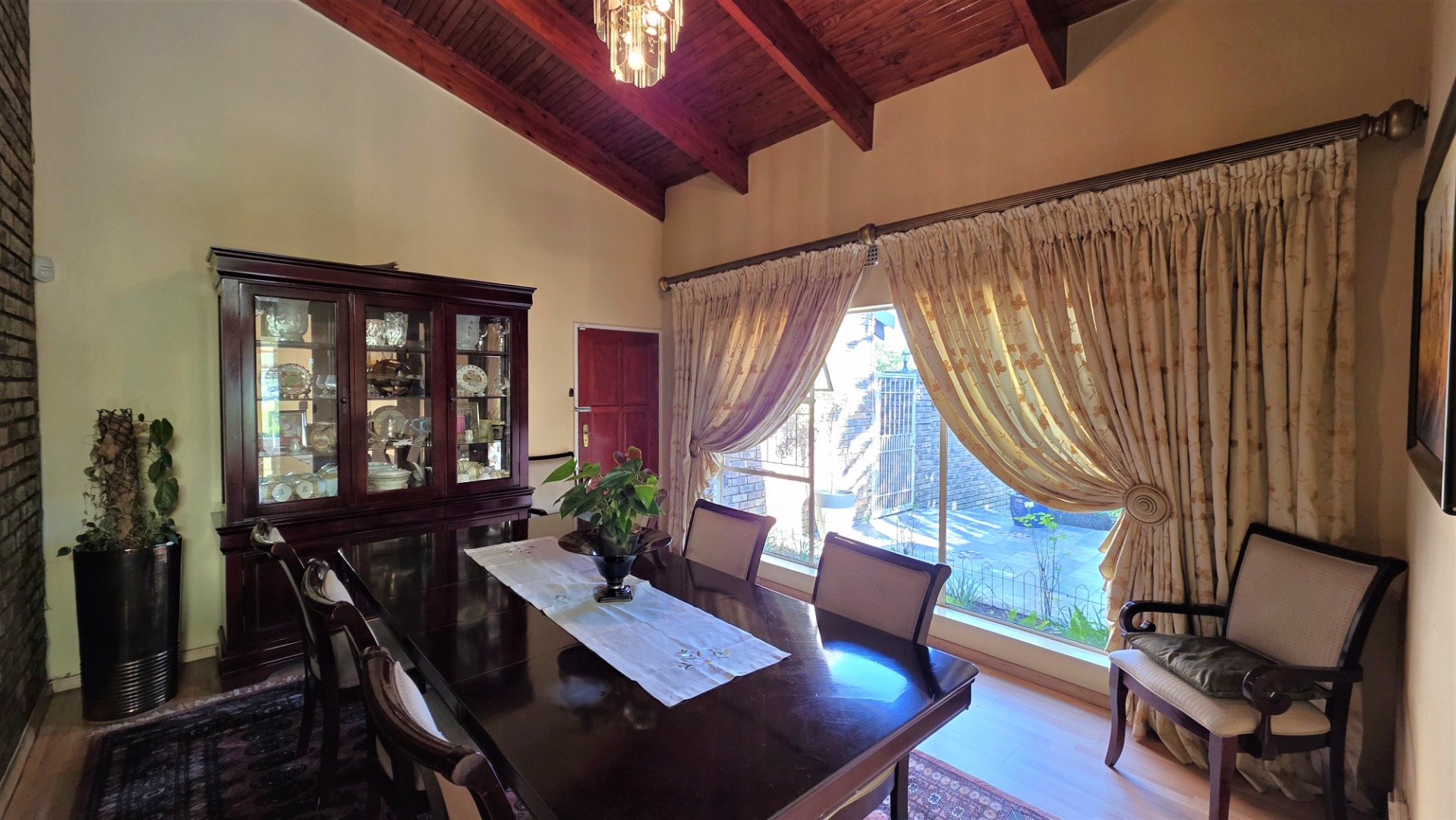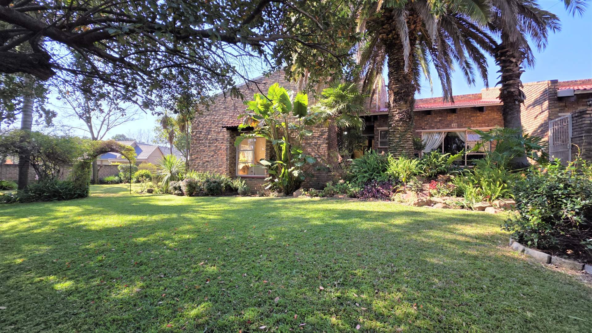 You are welcomed into an inviting spacious open-plan living area, with central fireplace. The elegant high wooden ceilings create a warm and sophisticated ambiance in the dining room, living room, large separate formal lounge, and entertainment areas. An indoor Jacuzzi is positioned alongside a stylish built-in bar, and sets the perfect mood for year-round relaxation and entertaining. The heart of the home is the sizeable contemporary kitchen with centre island, as well as a separate scullery leading to the back garden area. The living spaces open onto a covered patio area with built-in braai. Step outside into a lush established landscaped garden, extending 1604 square meters, that wraps around the property, featuring a sparkling swimming pool for adults, a kiddies' pool, and generous open areas ideal for family functions, weekend picnics, or even photoshoots.