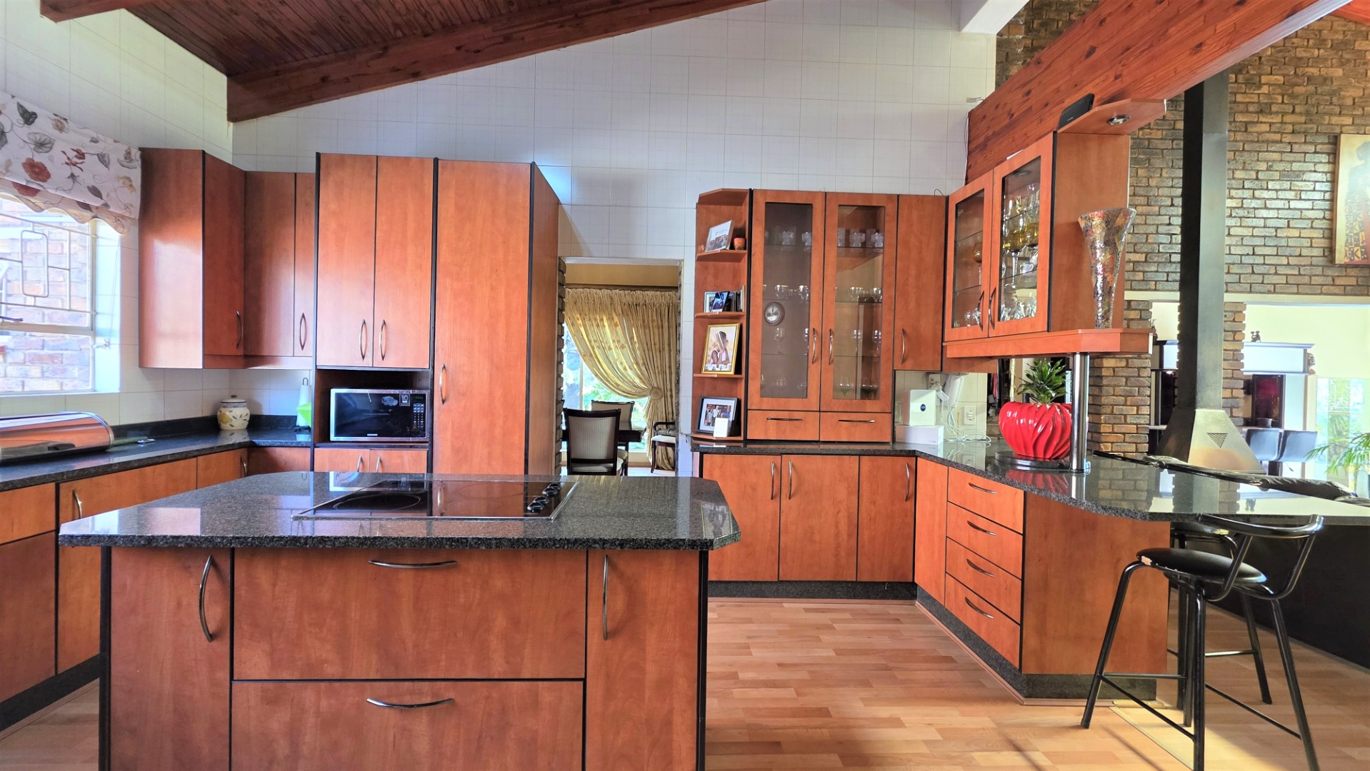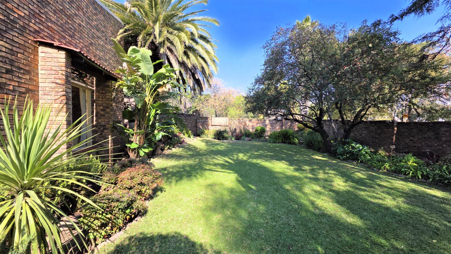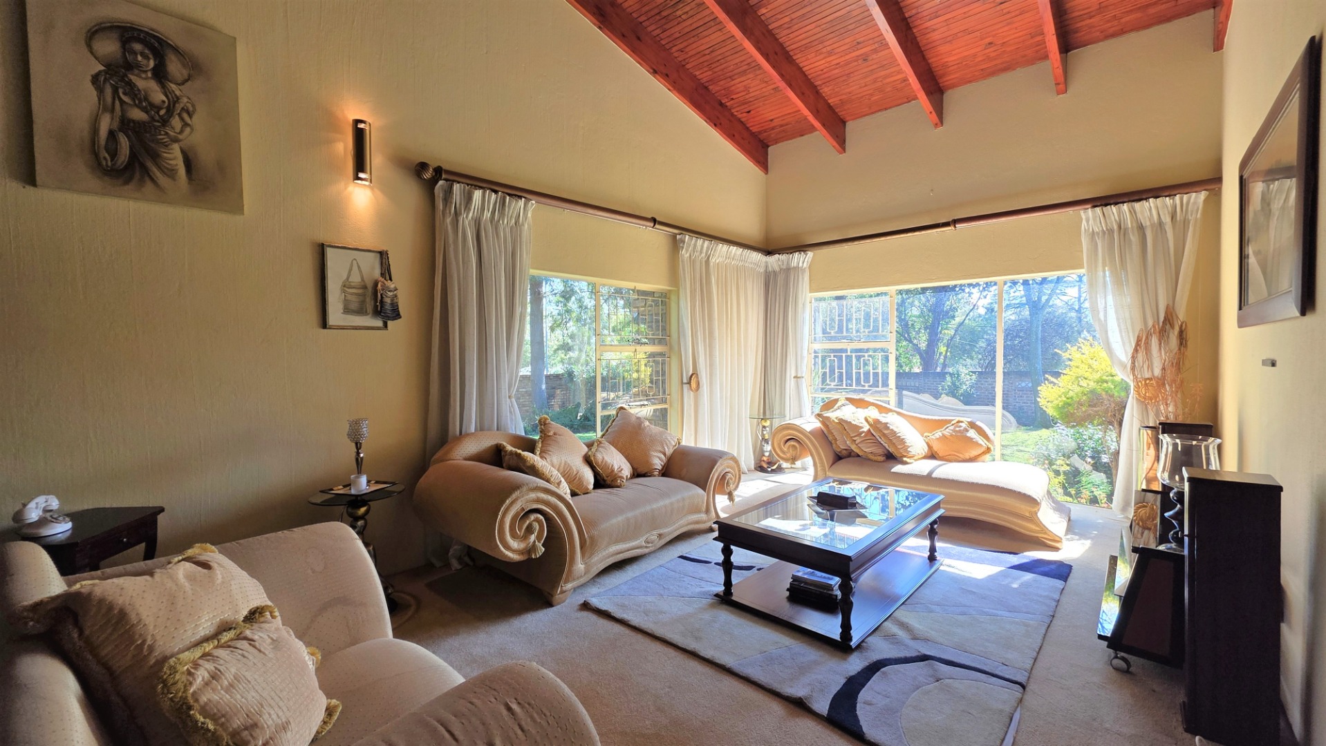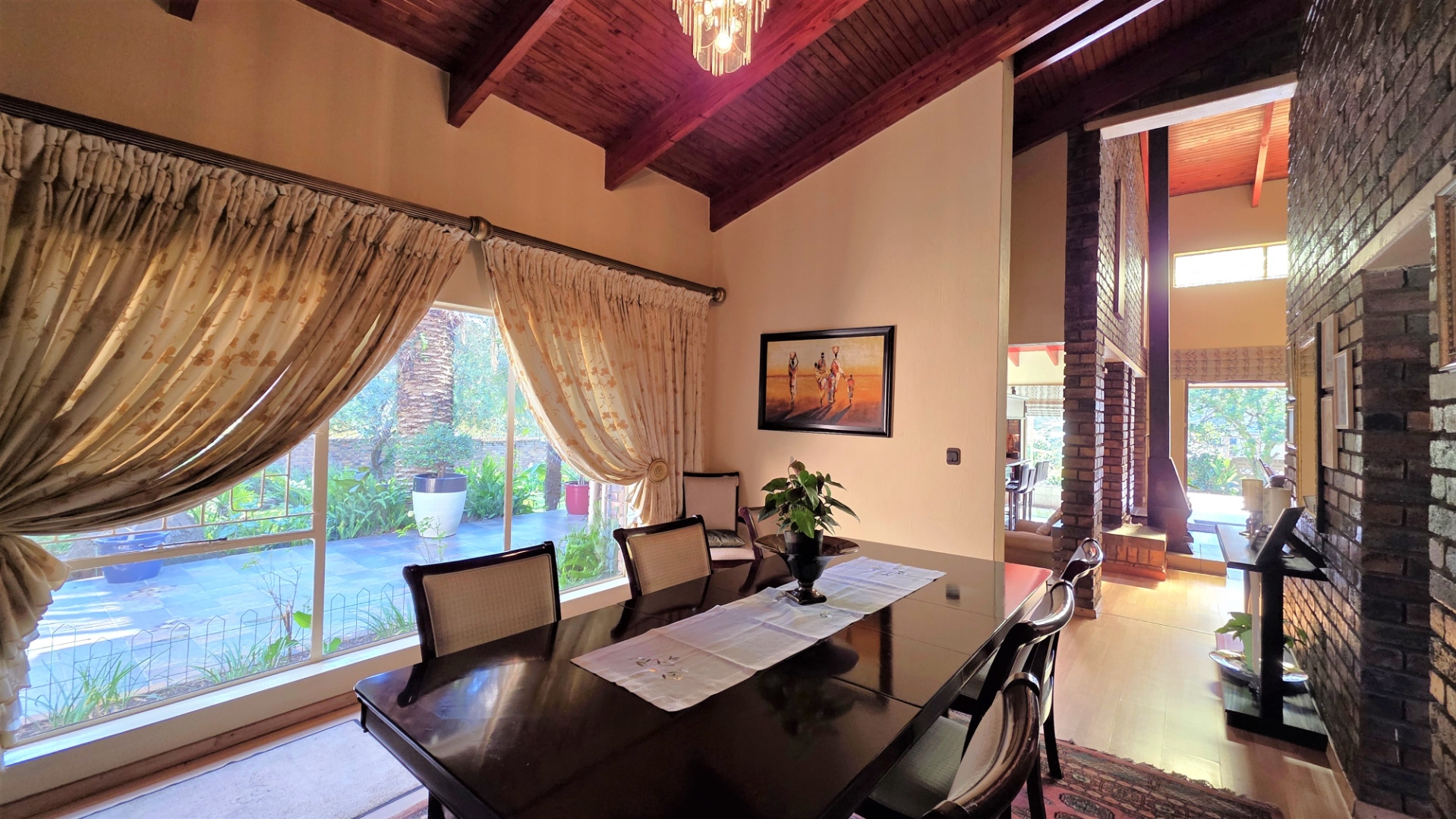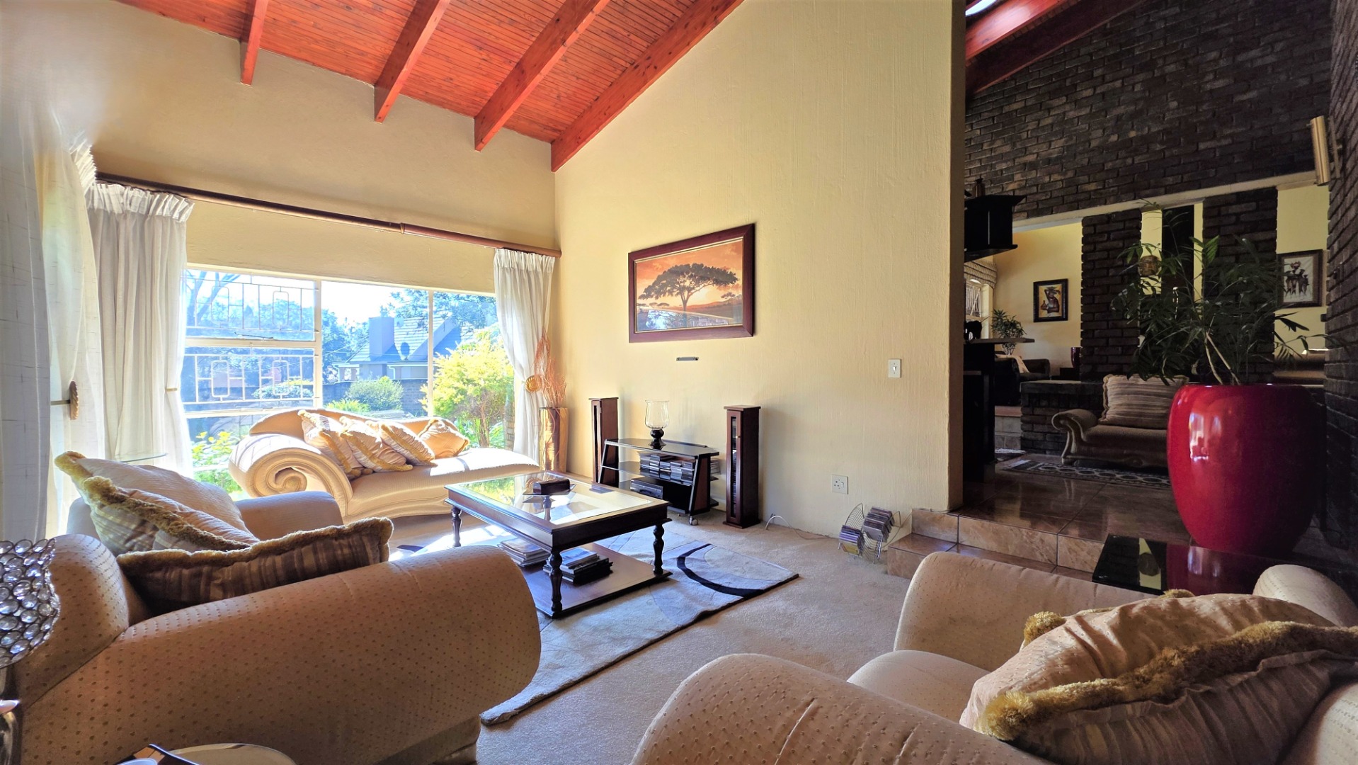 You are welcomed into an inviting spacious open-plan living area, with central fireplace. The elegant high wooden ceilings create a warm and sophisticated ambiance in the dining room, living room, large separate formal lounge, and entertainment areas. An indoor Jacuzzi is positioned alongside a stylish built-in bar, and sets the perfect mood for year-round relaxation and entertaining. The heart of the home is the sizeable contemporary kitchen with centre island, as well as a separate scullery leading to the back garden area. The living spaces open onto a covered patio area with built-in braai. Step outside into a lush established landscaped garden, extending 1604 square meters, that wraps around the property, featuring a sparkling swimming pool for adults, a kiddies' pool, and generous open areas ideal for family functions, weekend picnics, or even photoshoots.