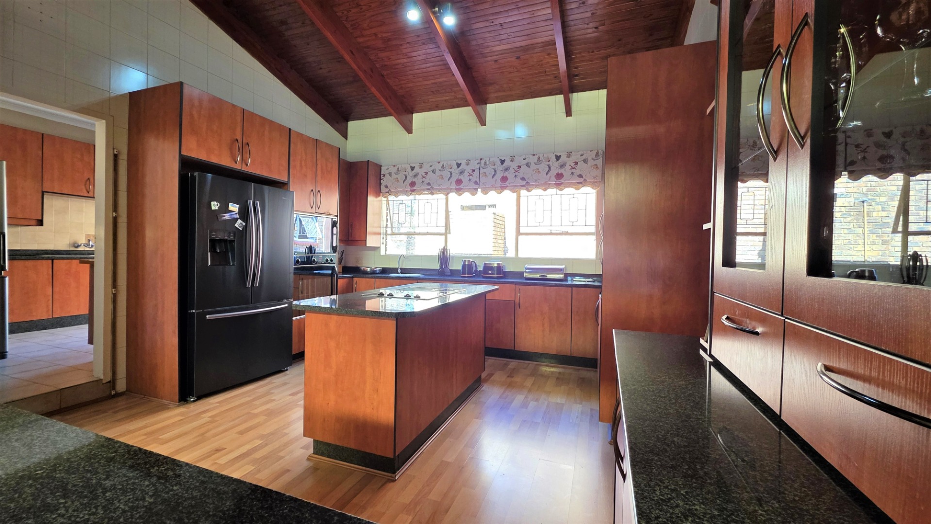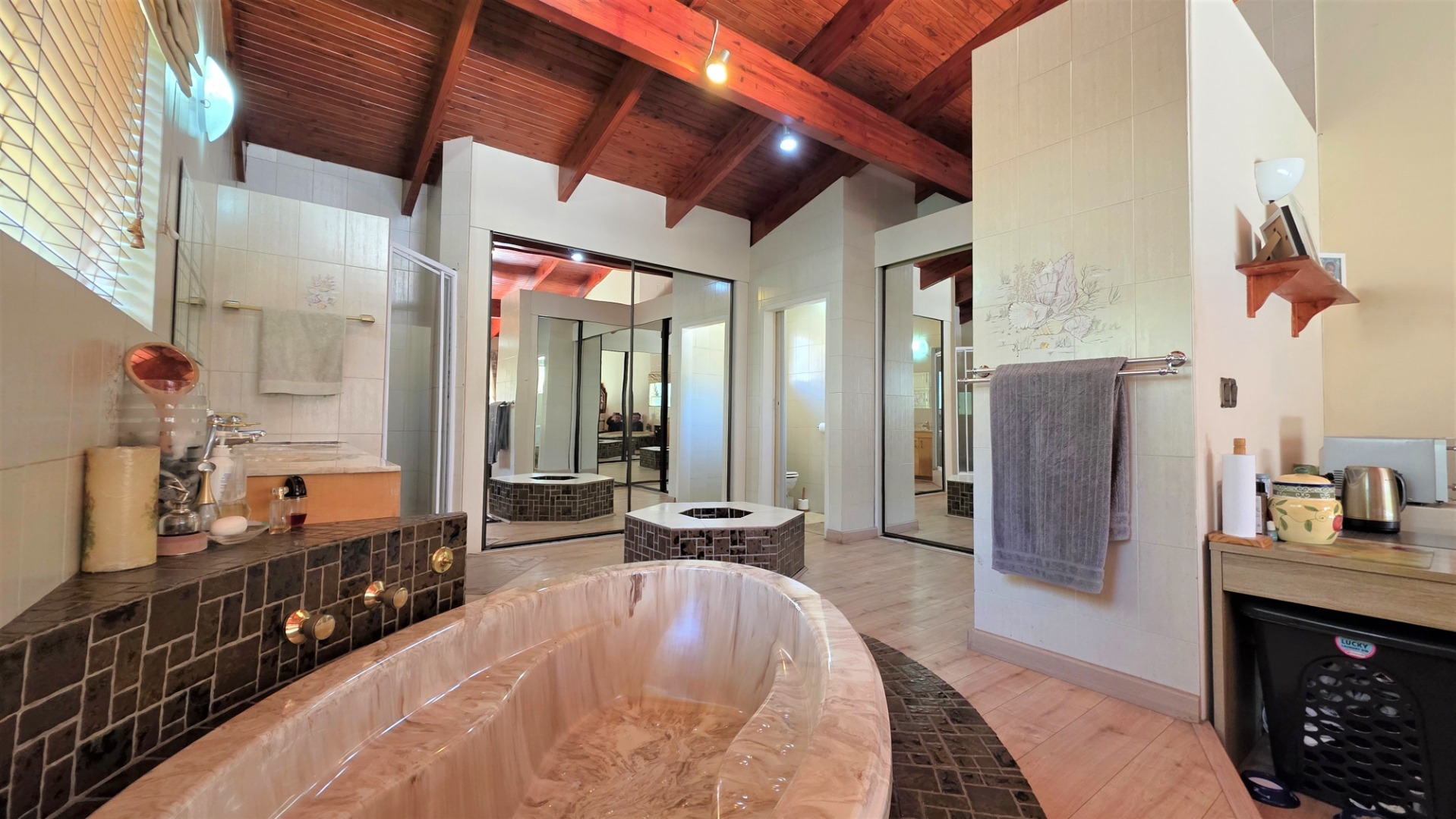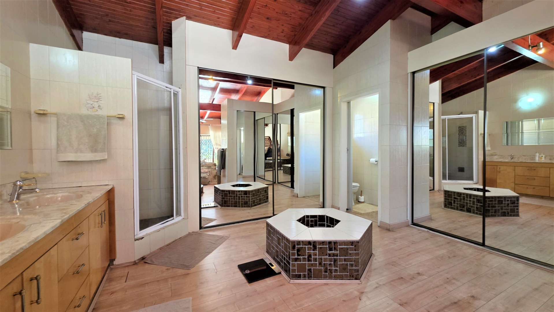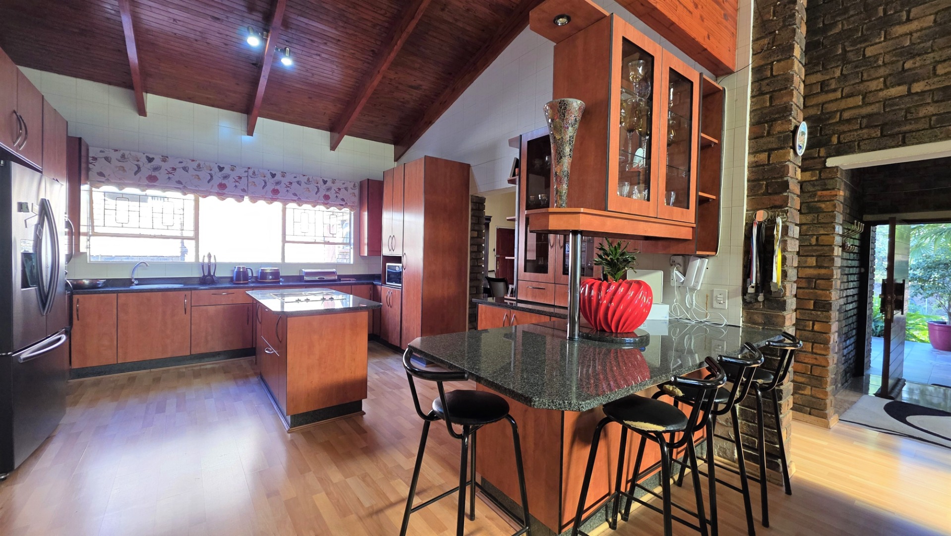 You are welcomed into an inviting spacious open-plan living area, with central fireplace. The elegant high wooden ceilings create a warm and sophisticated ambiance in the dining room, living room, large separate formal lounge, and entertainment areas. An indoor Jacuzzi is positioned alongside a stylish built-in bar, and sets the perfect mood for year-round relaxation and entertaining. The heart of the home is the sizeable contemporary kitchen with centre island, as well as a separate scullery leading to the back garden area. The living spaces open onto a covered patio area with built-in braai. Step outside into a lush established landscaped garden, extending 1604 square meters, that wraps around the property, featuring a sparkling swimming pool for adults, a kiddies' pool, and generous open areas ideal for family functions, weekend picnics, or even photoshoots.