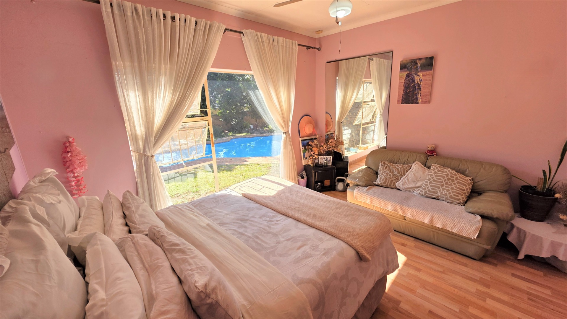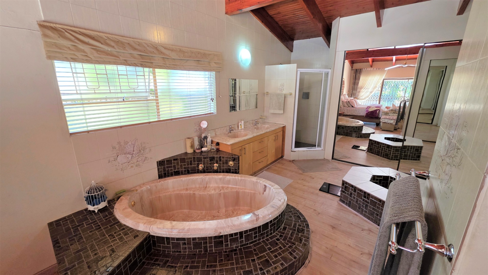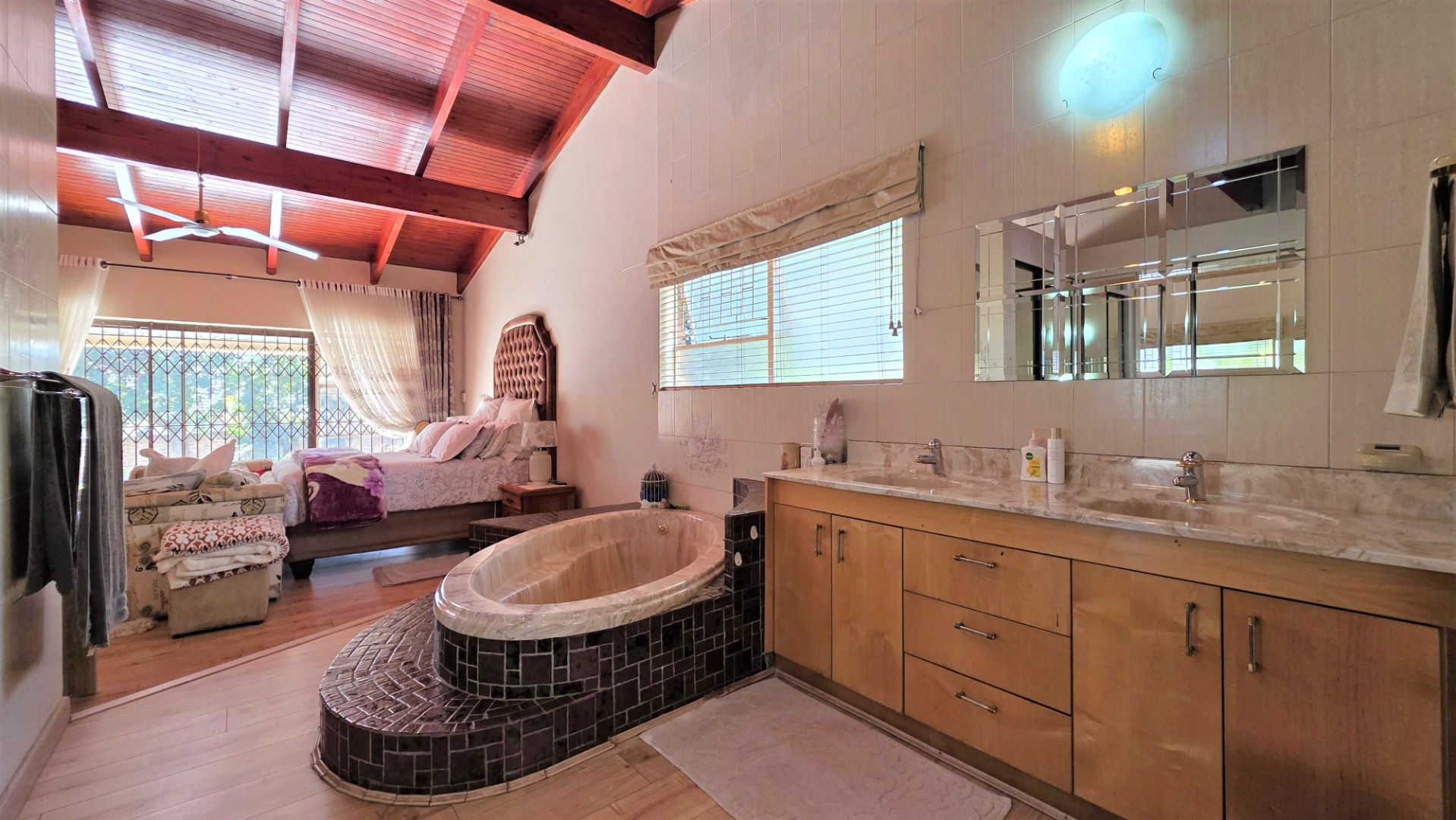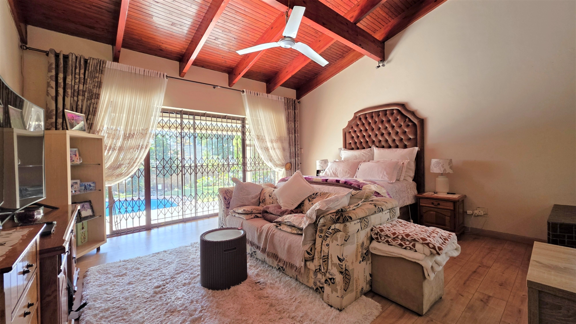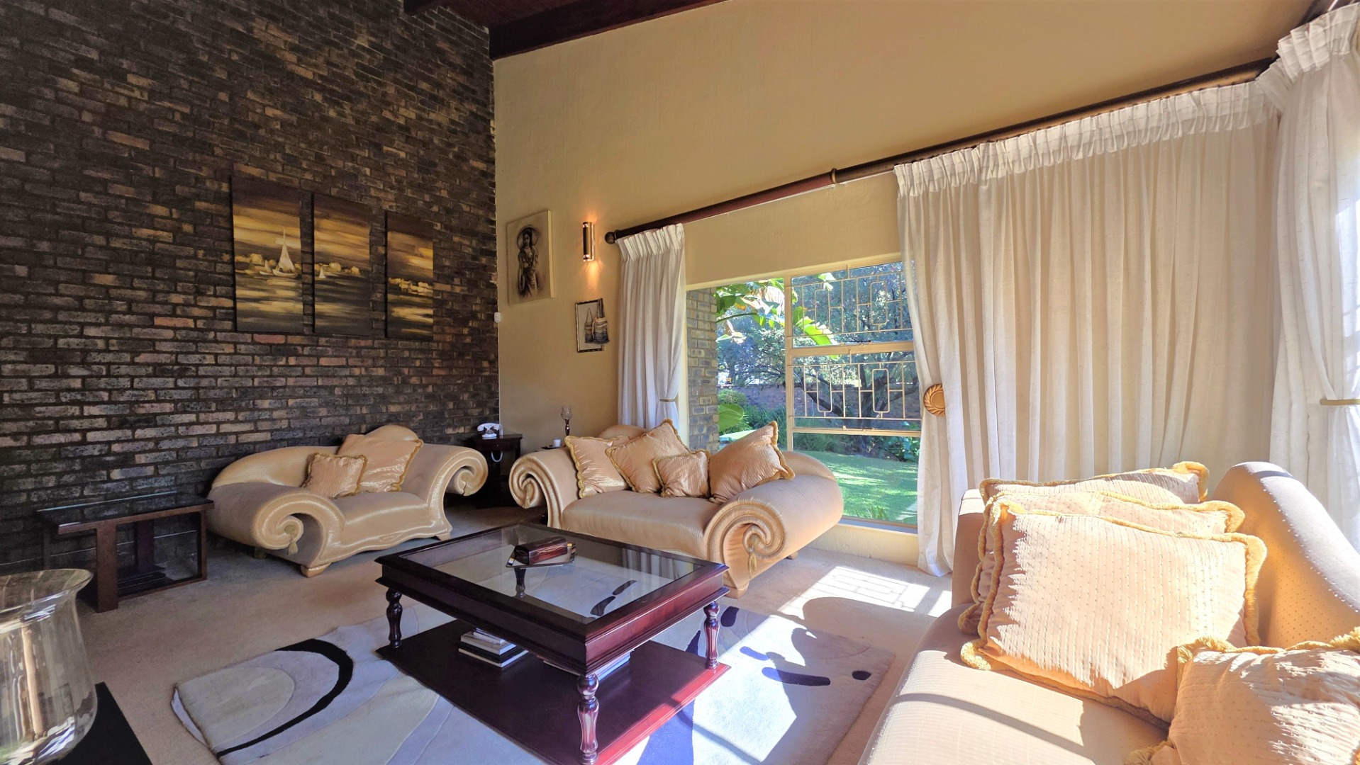 You are welcomed into an inviting spacious open-plan living area, with central fireplace. The elegant high wooden ceilings create a warm and sophisticated ambiance in the dining room, living room, large separate formal lounge, and entertainment areas. An indoor Jacuzzi is positioned alongside a stylish built-in bar, and sets the perfect mood for year-round relaxation and entertaining. The heart of the home is the sizeable contemporary kitchen with centre island, as well as a separate scullery leading to the back garden area. The living spaces open onto a covered patio area with built-in braai. Step outside into a lush established landscaped garden, extending 1604 square meters, that wraps around the property, featuring a sparkling swimming pool for adults, a kiddies' pool, and generous open areas ideal for family functions, weekend picnics, or even photoshoots.