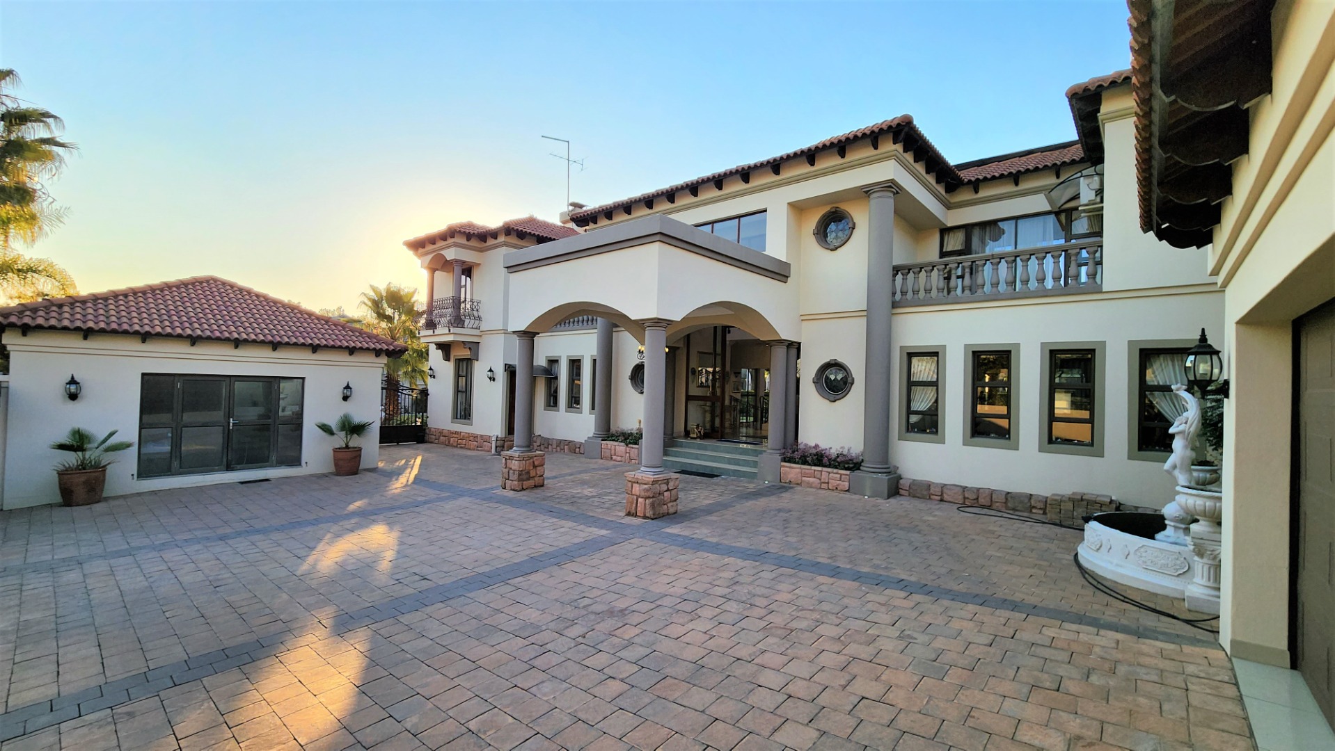 This property is exquisite from every angle. You are welcomed into this home by an impressive porte cochére entrance, where you are struck by the magnificent Tuscan-style architecture from the courtyard into the main entrance. On entering through the large double-doors you are welcomed into a spacious entrance hall with a luxurious floating marble sweeping staircase in front of you, against a full wall of glass.