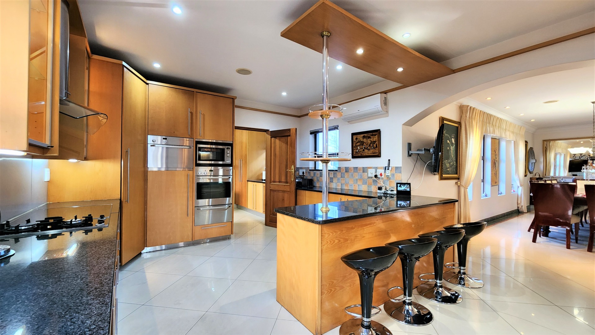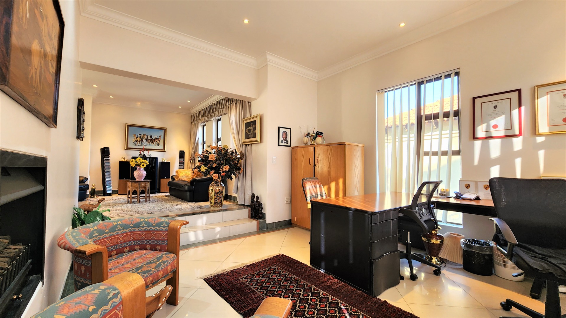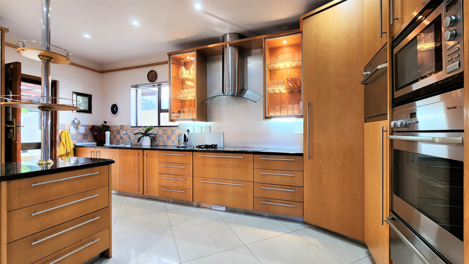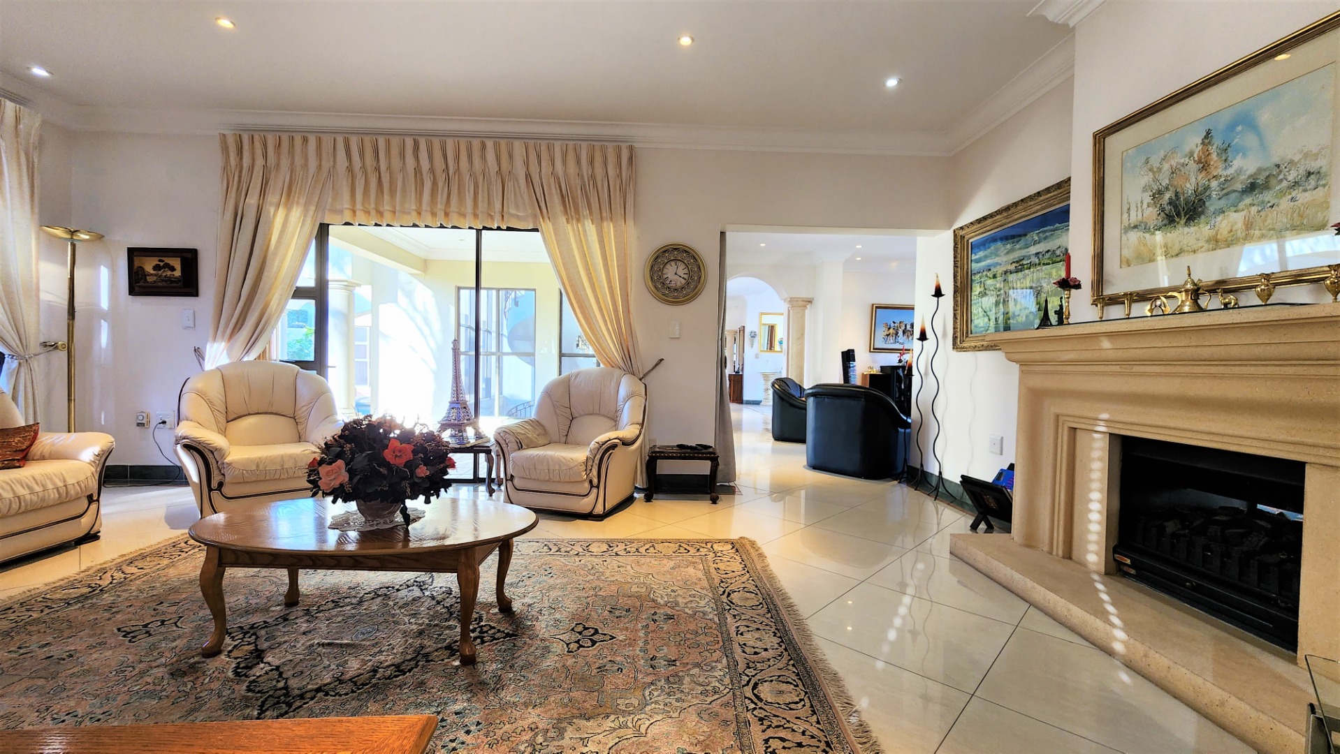 The main floor allows easy practical living with numerous living and entertainment spaces (featuring jetmaster fireplaces) flowing seamlessly into each other, as well as flowing out onto patio areas and the garden area. The sizeable open-plan dining room is perfectly located alongside the chef’s kitchen with Miele appliances, and a separate scullery with space for a fridge and all 3 under-counter appliances. The kitchen and dining area opens out onto a covered patio with built-in braai, and sparkling pool (with cover), and low-maintenance private garden.