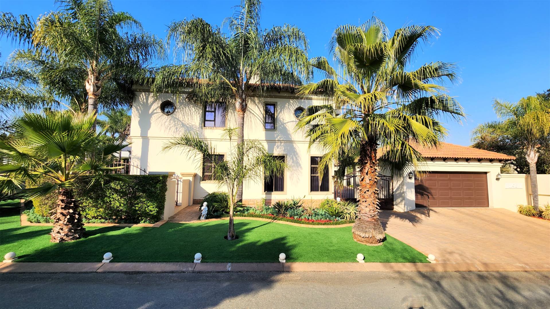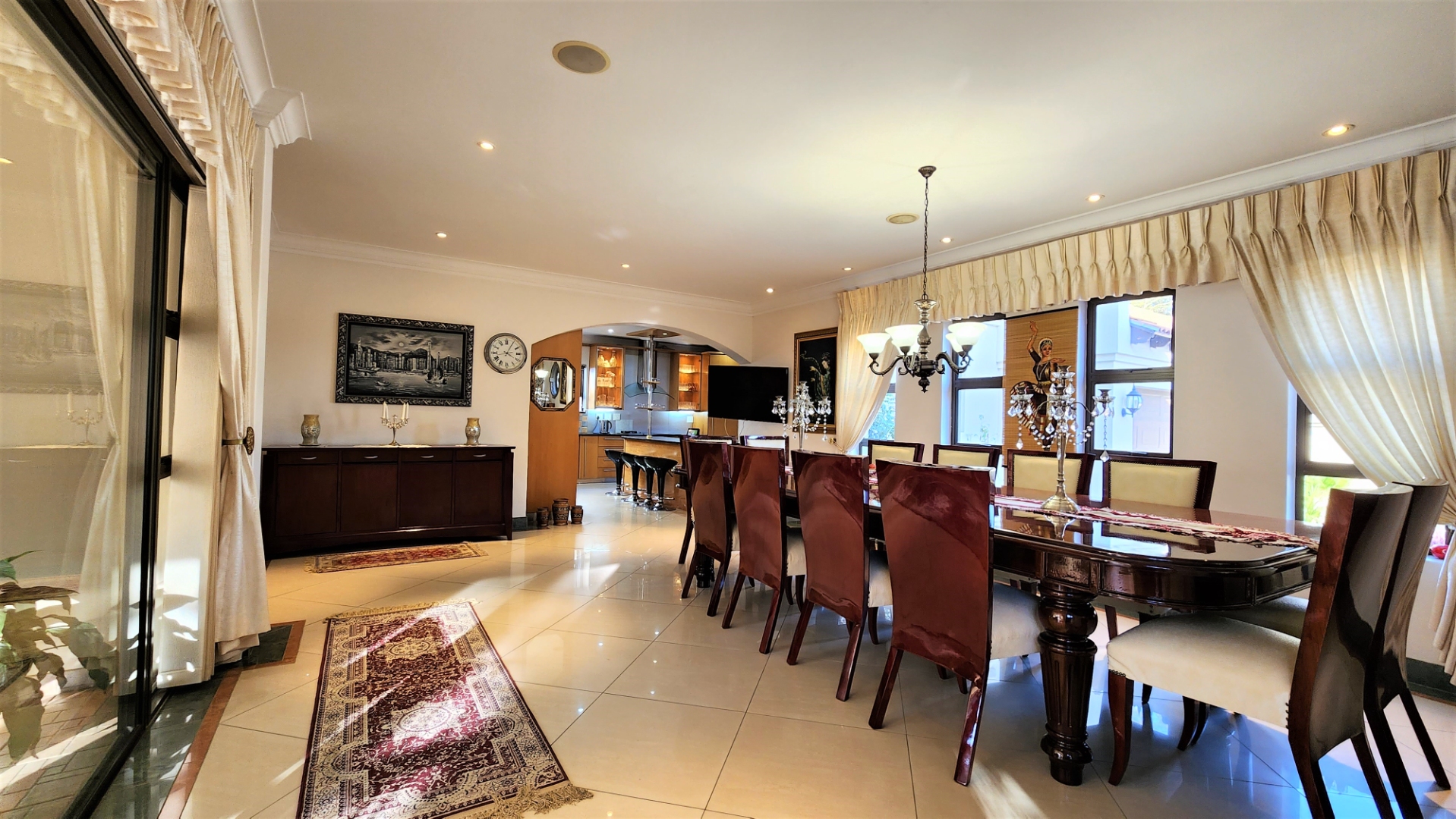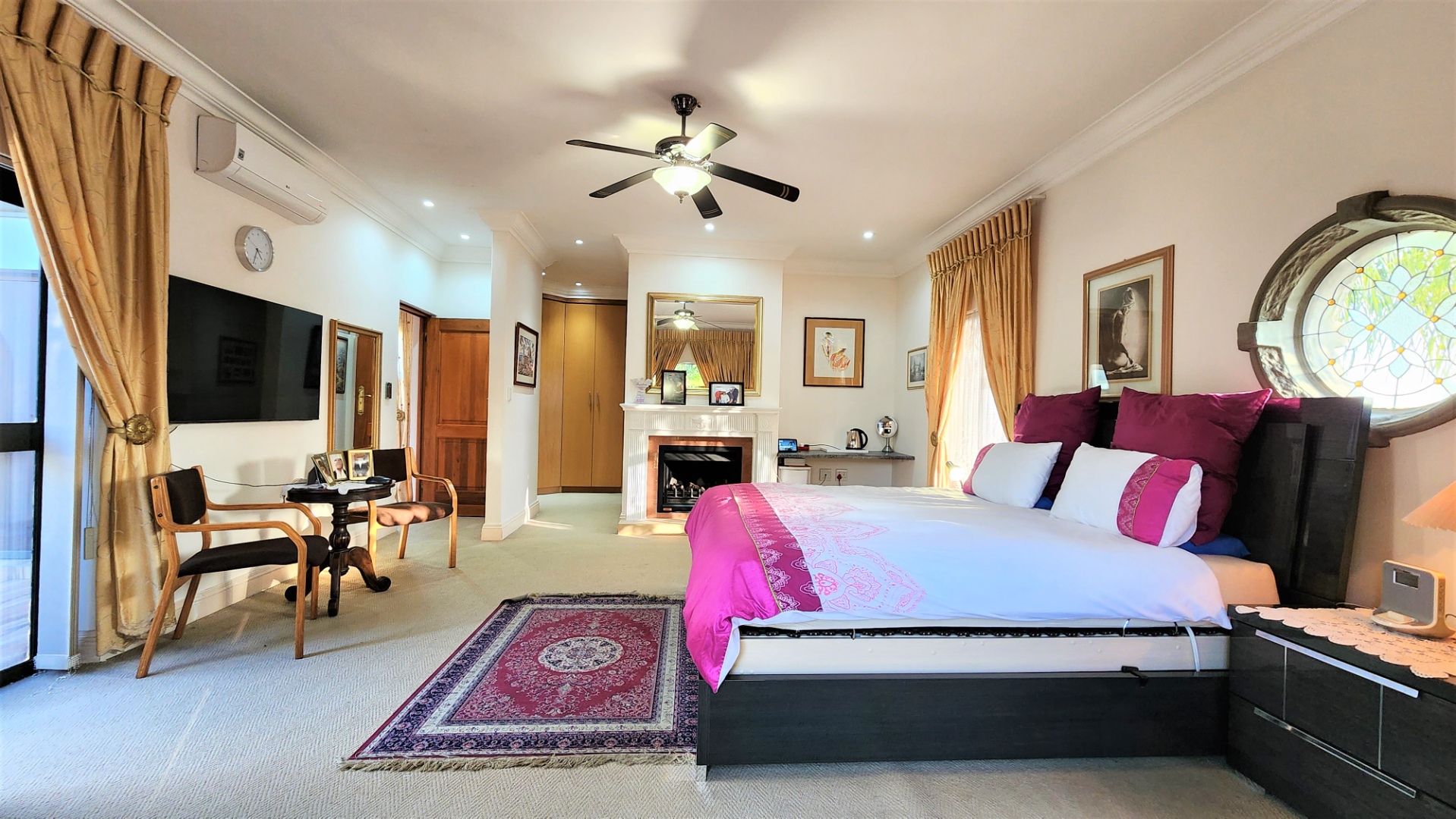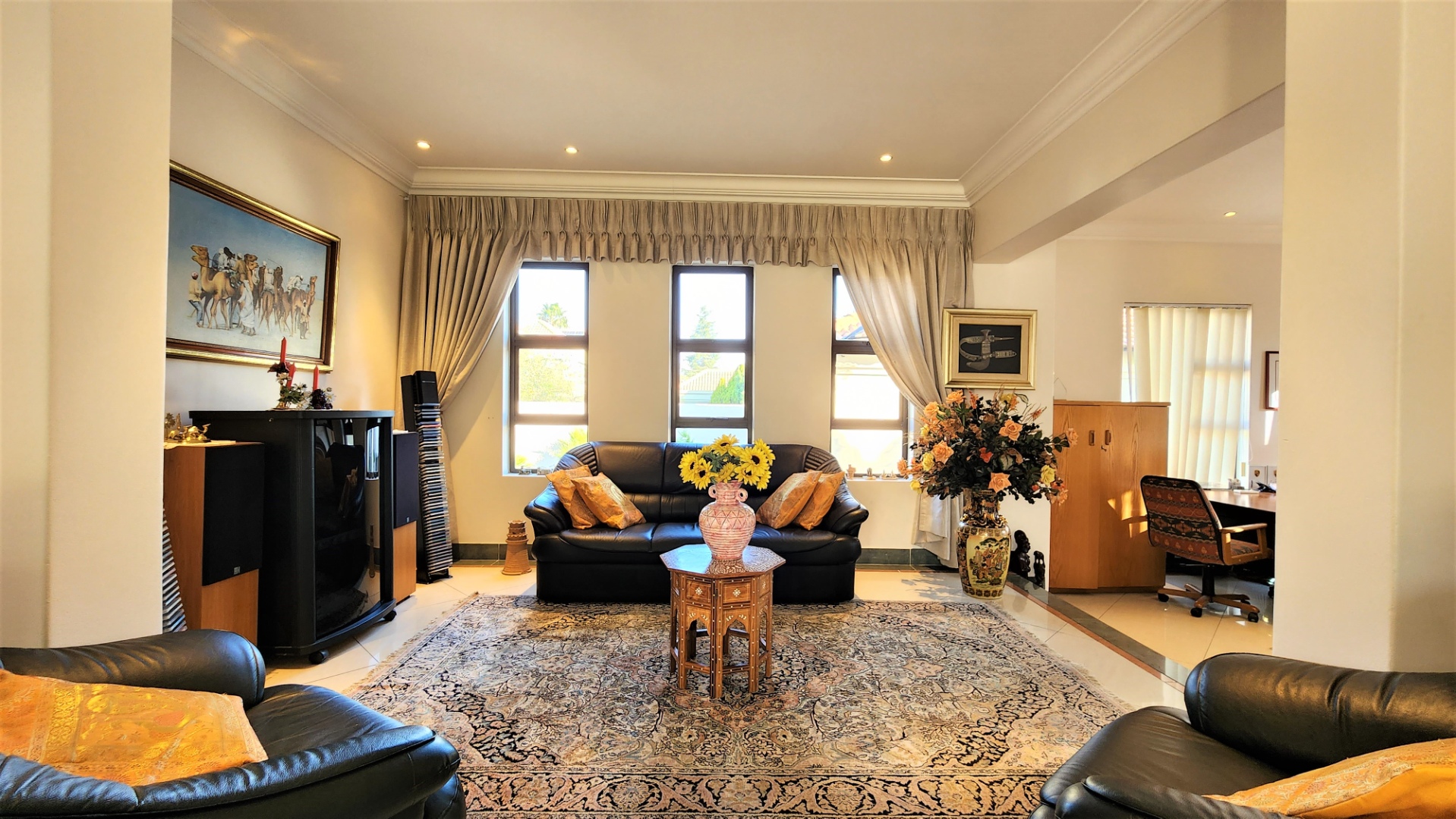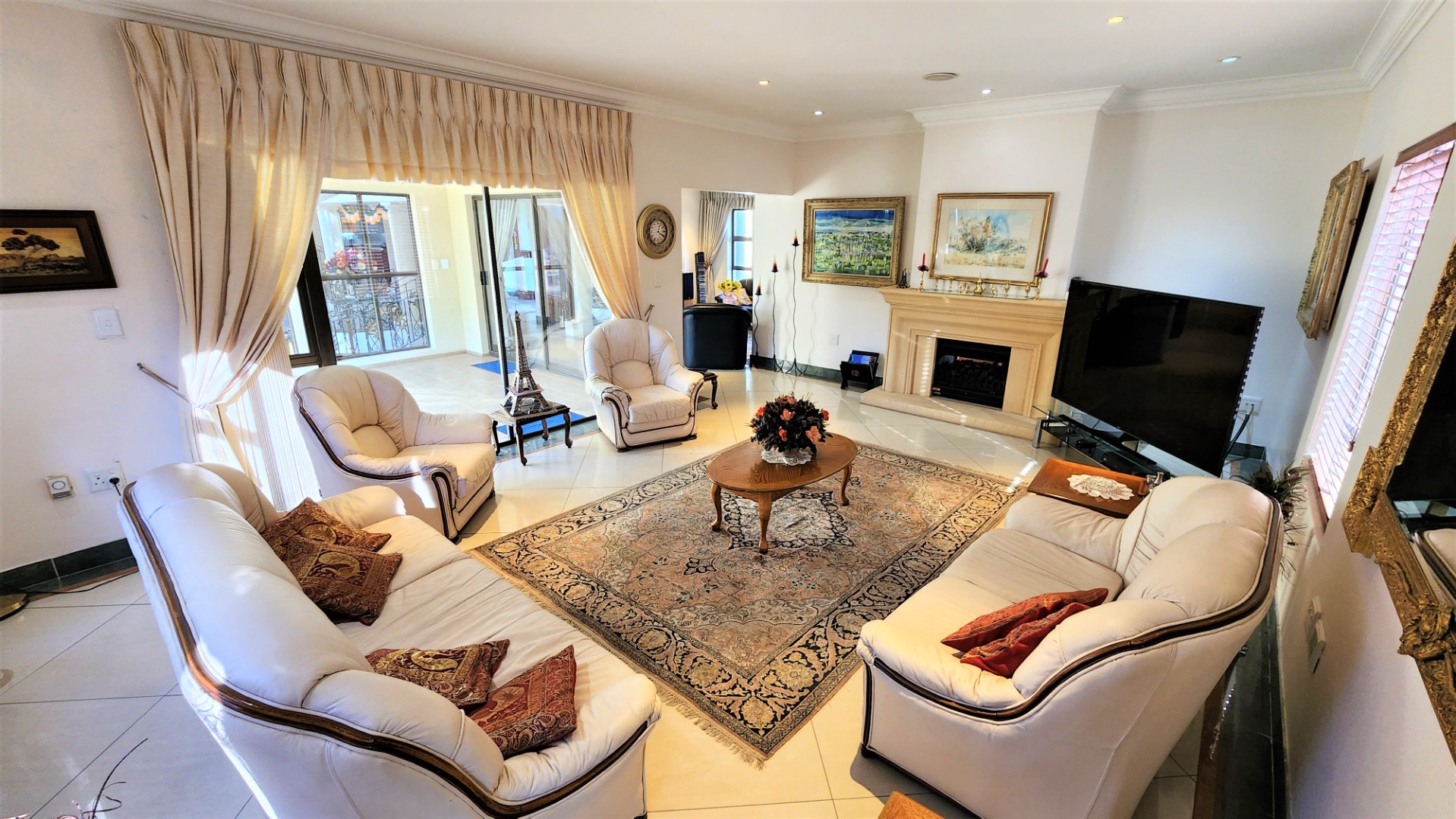 The main floor allows easy practical living with numerous living and entertainment spaces (featuring jetmaster fireplaces) flowing seamlessly into each other, as well as flowing out onto patio areas and the garden area. The sizeable open-plan dining room is perfectly located alongside the chef’s kitchen with Miele appliances, and a separate scullery with space for a fridge and all 3 under-counter appliances. The kitchen and dining area opens out onto a covered patio with built-in braai, and sparkling pool (with cover), and low-maintenance private garden.