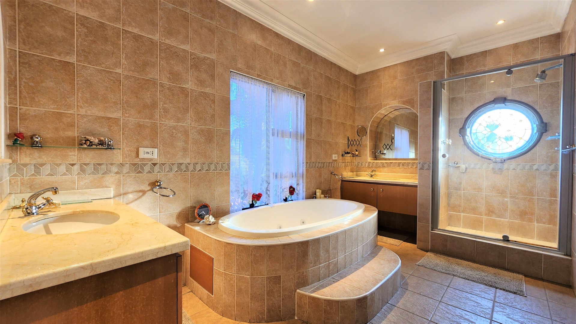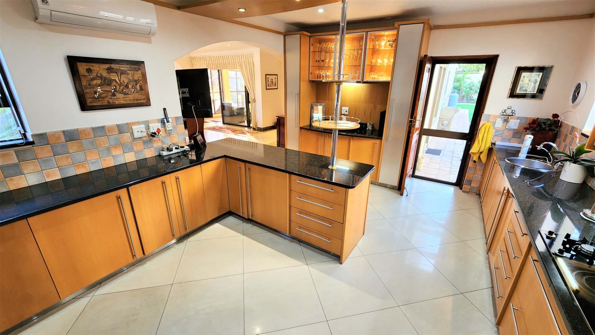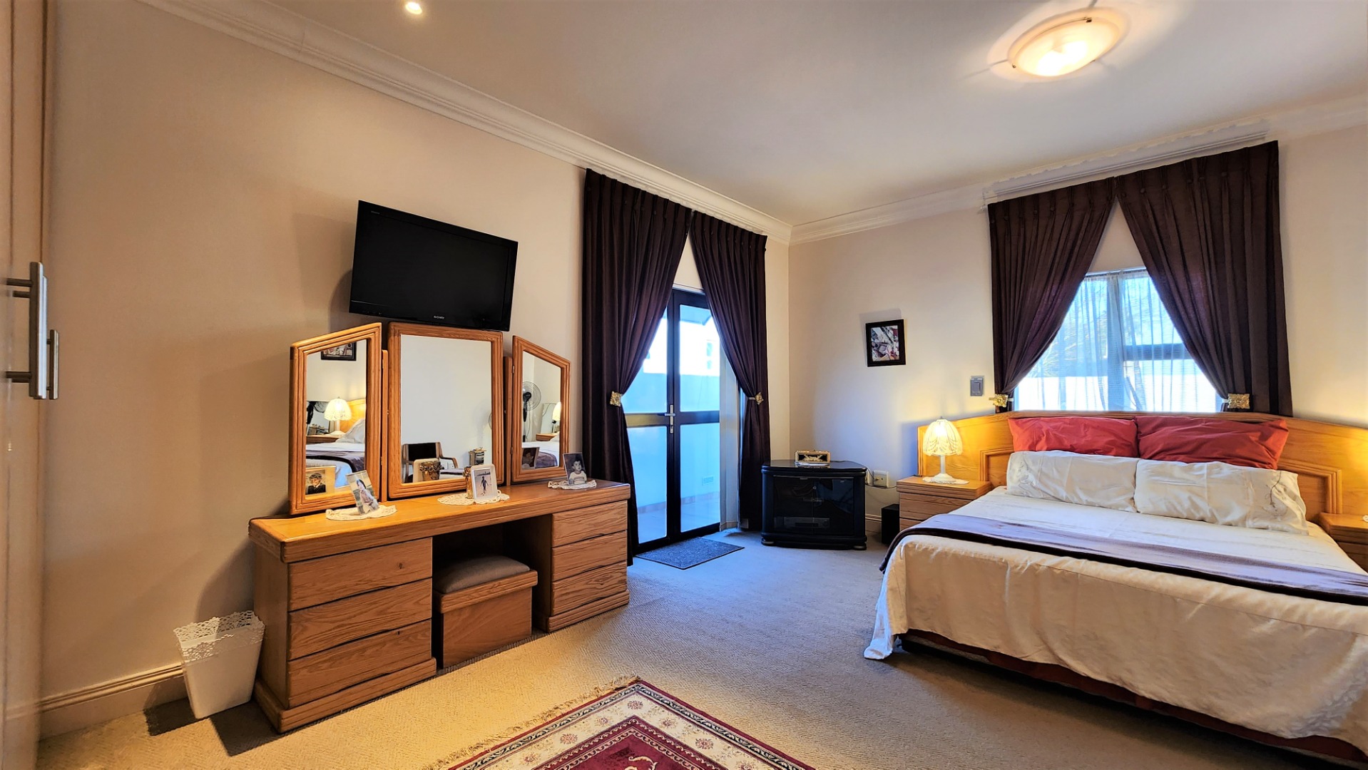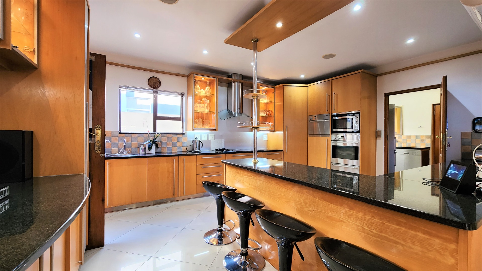 The main floor allows easy practical living with numerous living and entertainment spaces (featuring jetmaster fireplaces) flowing seamlessly into each other, as well as flowing out onto patio areas and the garden area. The sizeable open-plan dining room is perfectly located alongside the chef’s kitchen with Miele appliances, and a separate scullery with space for a fridge and all 3 under-counter appliances. The kitchen and dining area opens out onto a covered patio with built-in braai, and sparkling pool (with cover), and low-maintenance private garden.