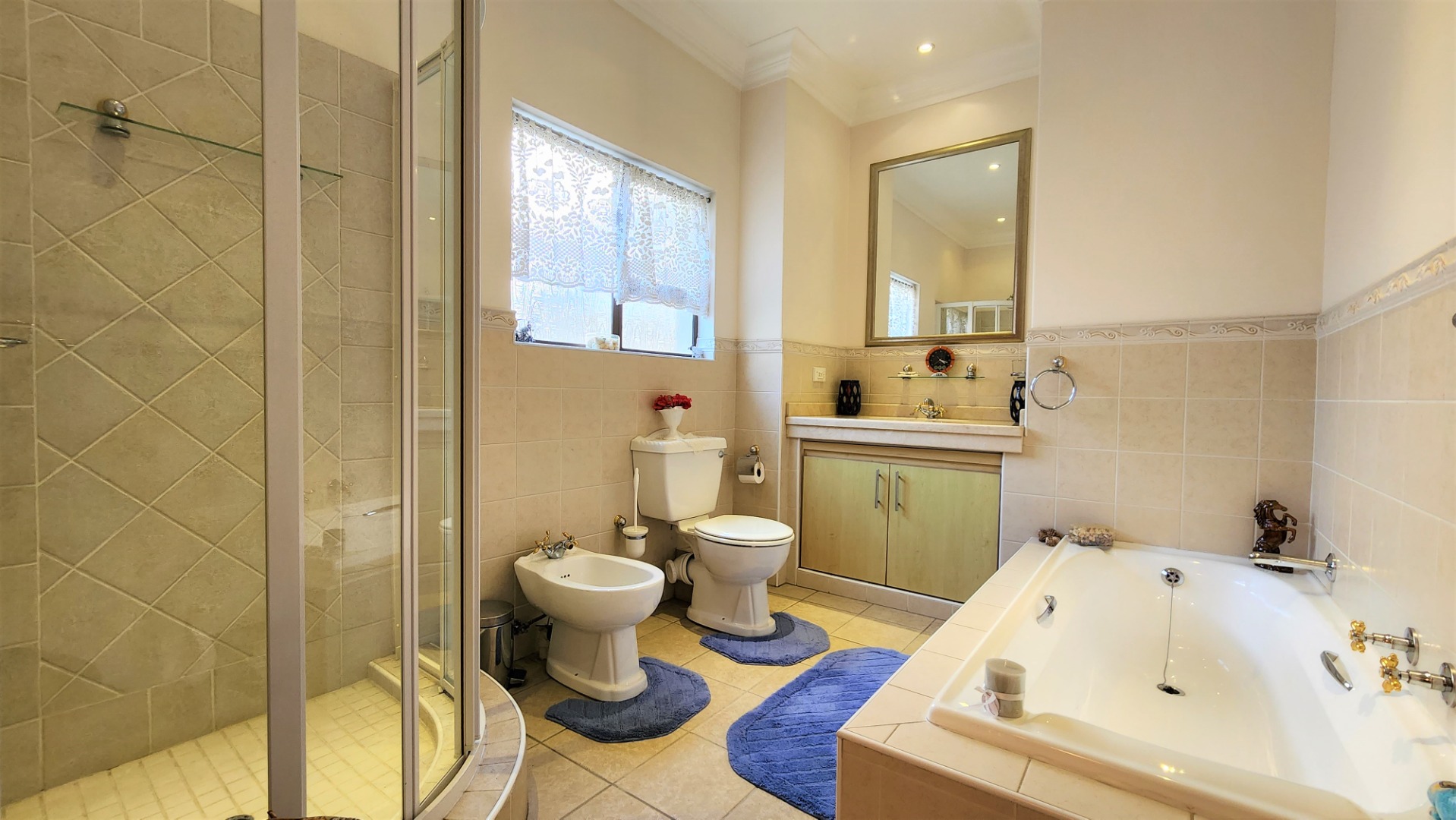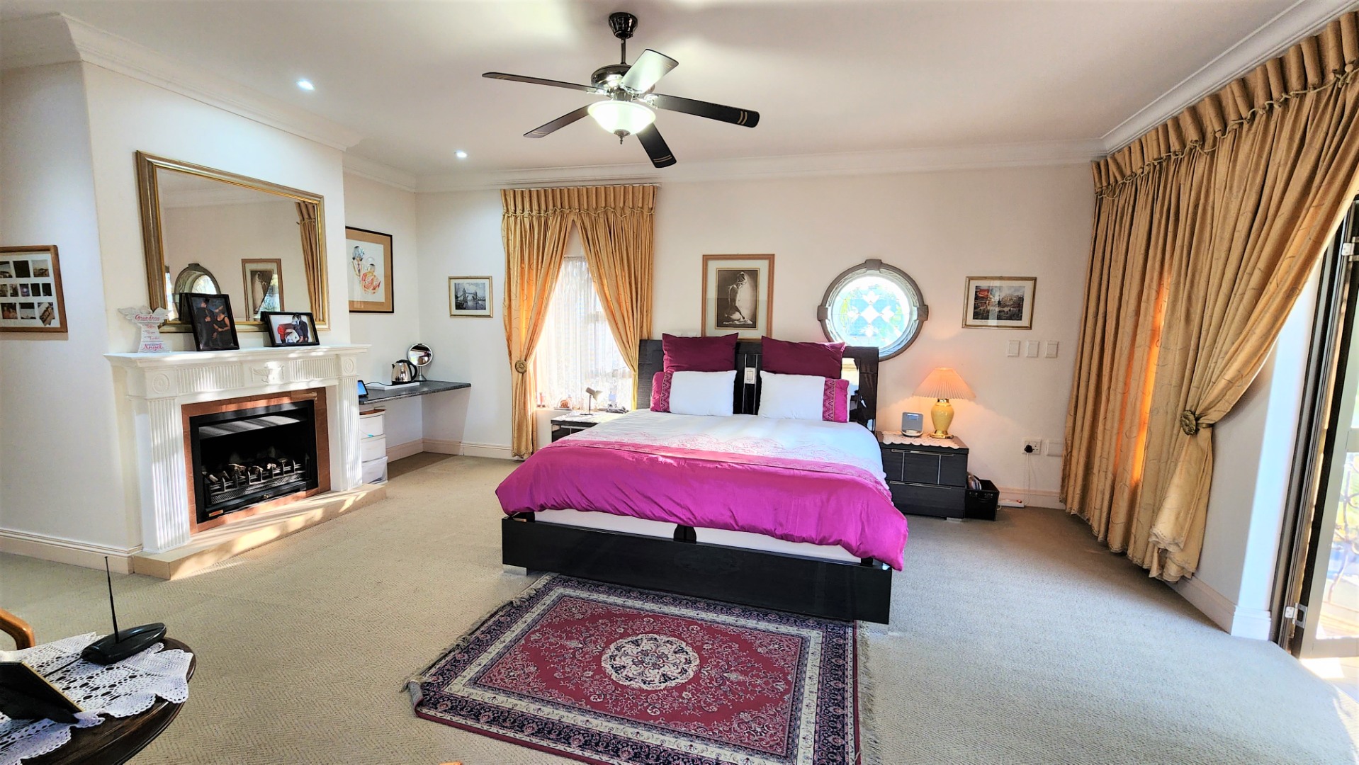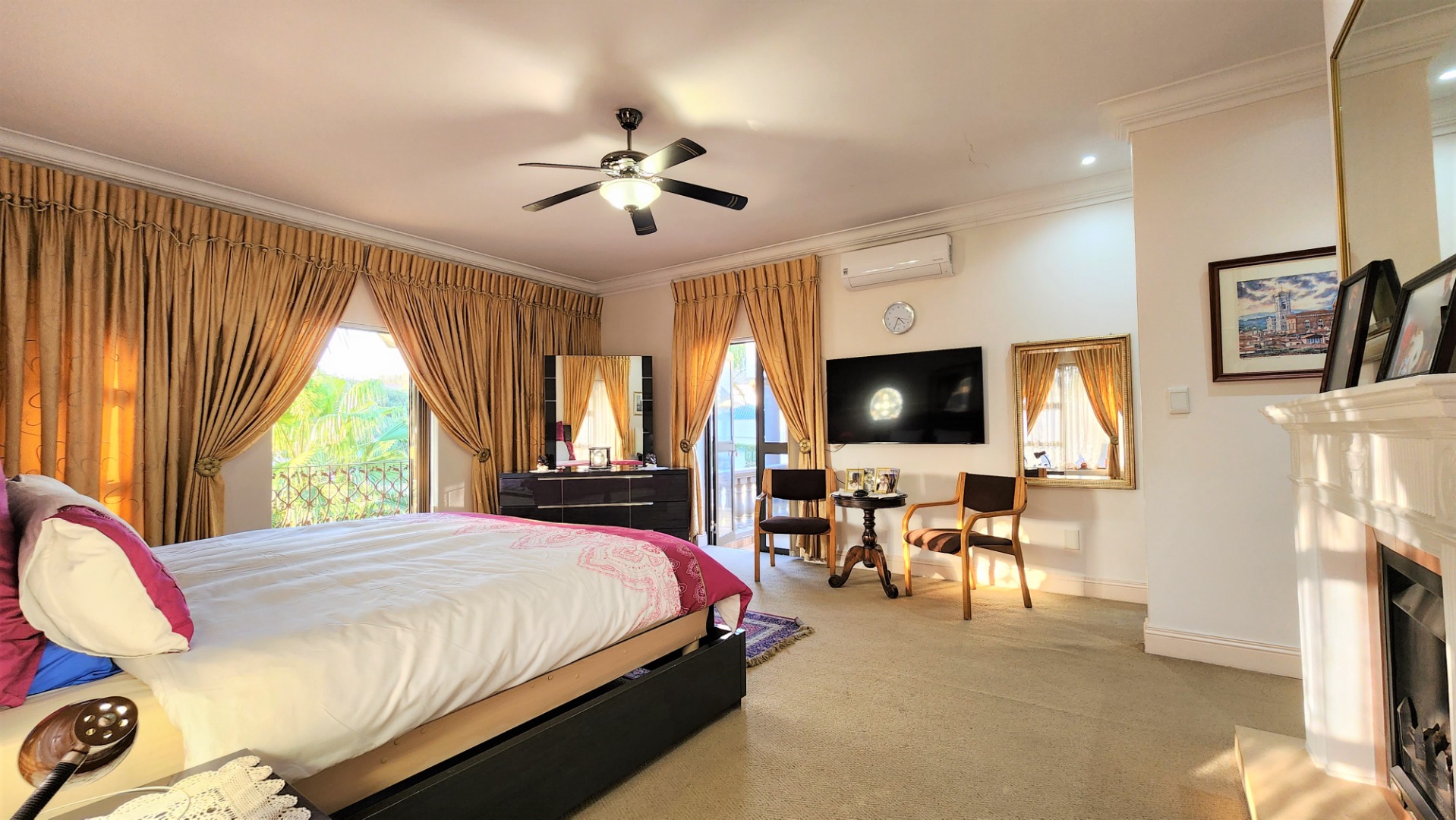 Ascending the grand floating staircase, you will find a large landing area which could house another seating area or be utilized however you choose. The main bedroom is spacious, with a fireplace, and open’s out onto 2 balconies with views, and boasts a walk-through dressing room with ample cupboard space, and a full ensuite bathroom with jet-spa bath and bidet. The 2nd and 3rd bedrooms are also sizeable, and both boast full ensuite bathrooms (with bidets), and balconies.