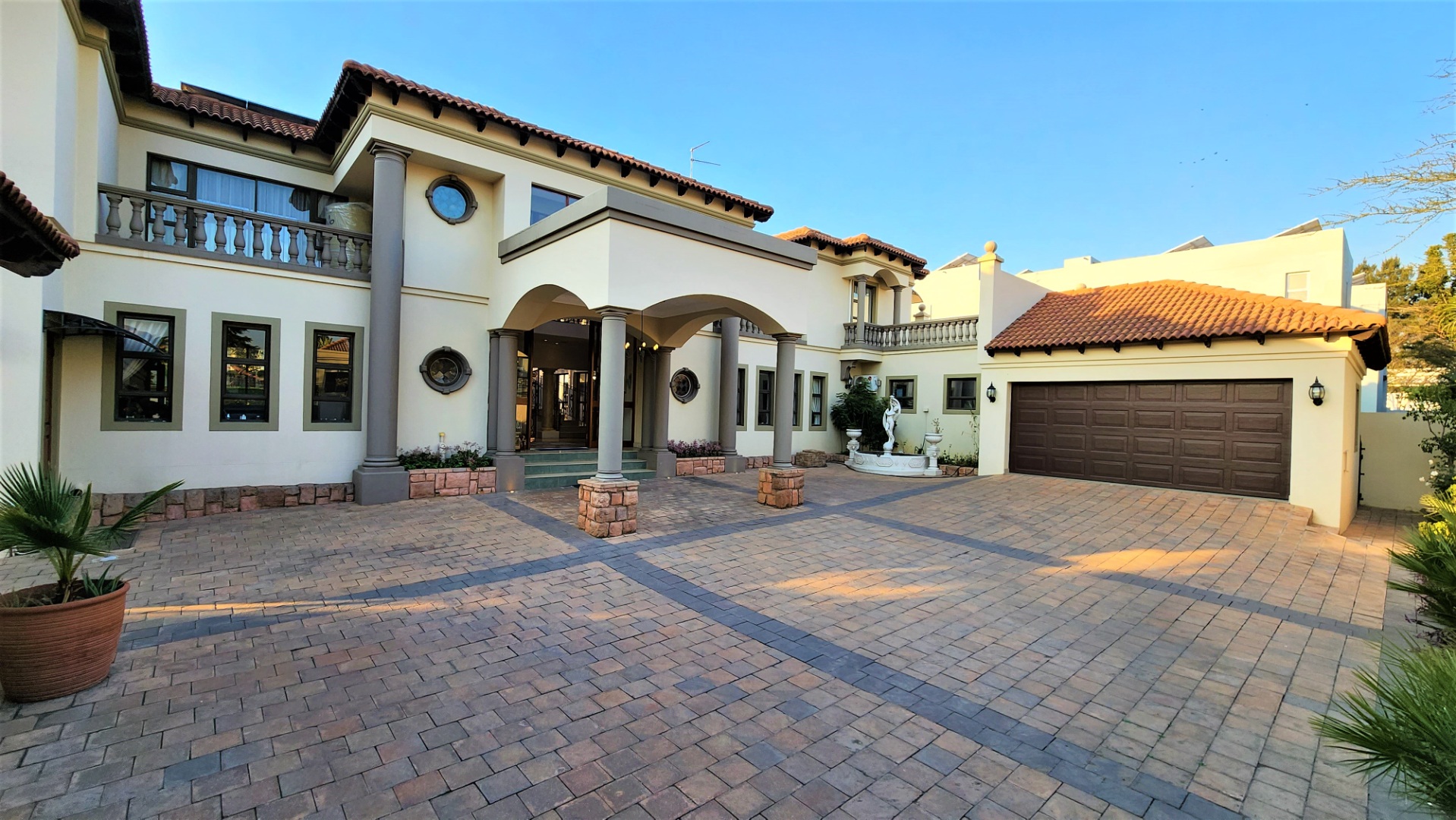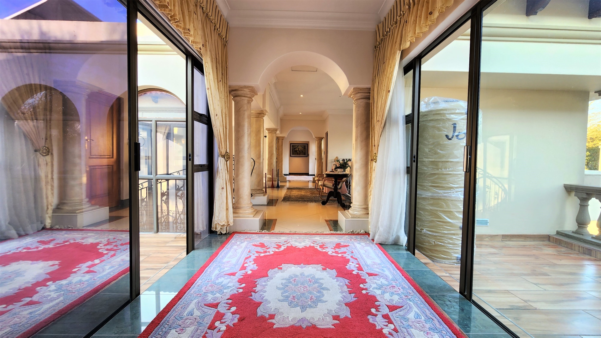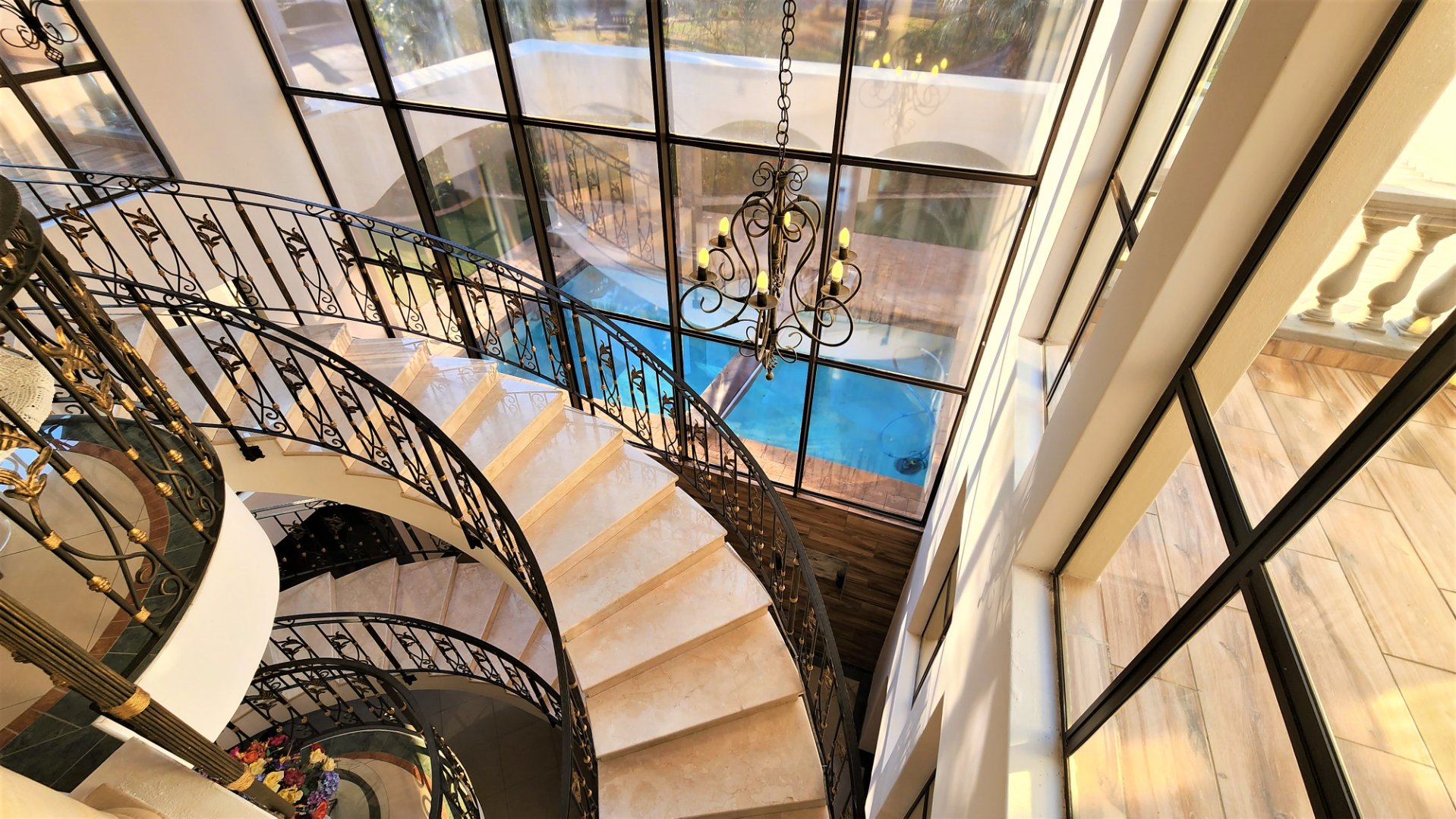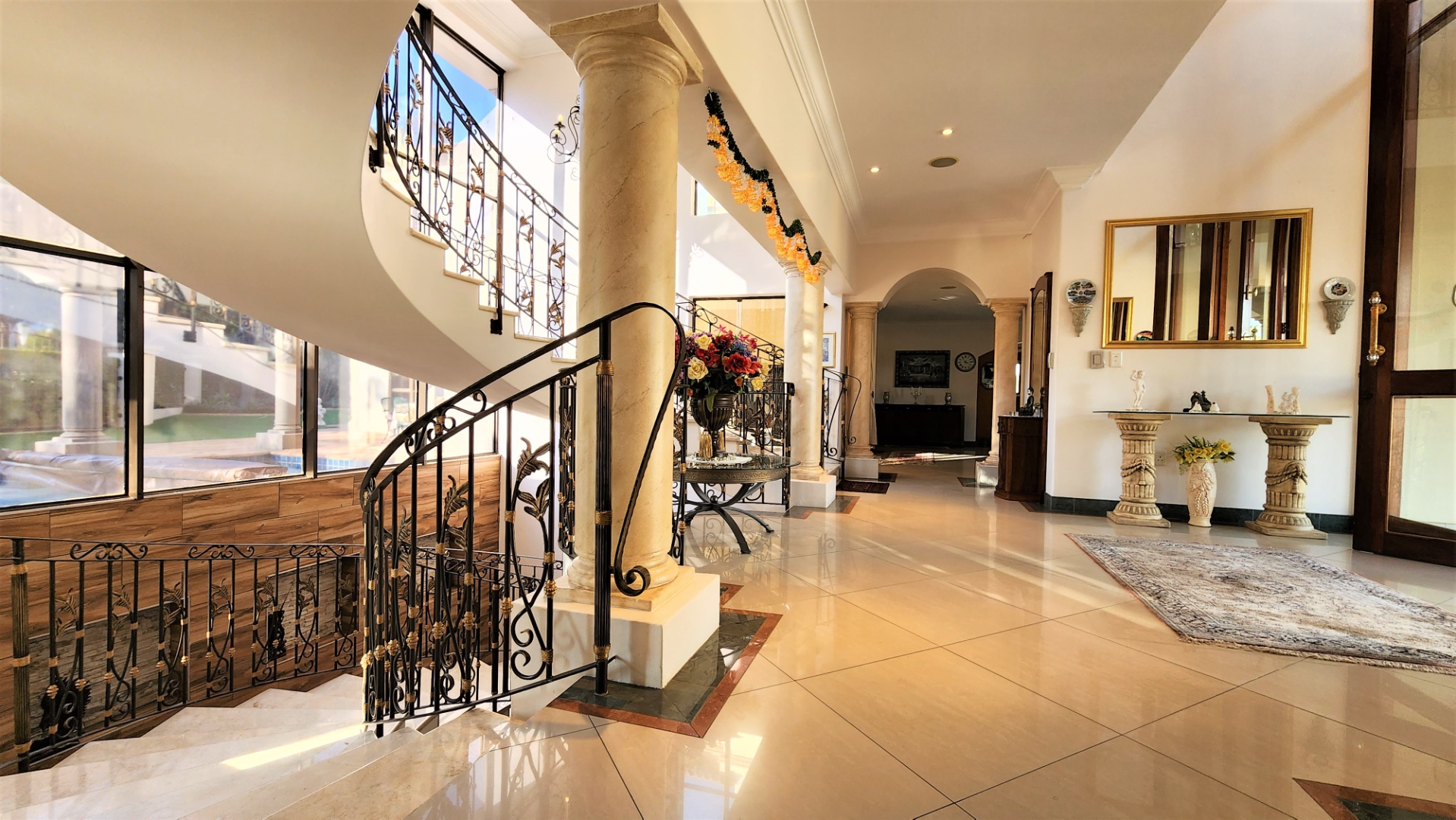 This property is exquisite from every angle. You are welcomed into this home by an impressive porte cochére entrance, where you are struck by the magnificent Tuscan-style architecture from the courtyard into the main entrance. On entering through the large double-doors you are welcomed into a spacious entrance hall with a luxurious floating marble sweeping staircase in front of you, against a full wall of glass.