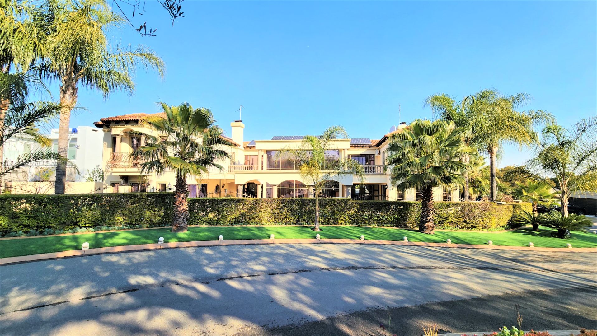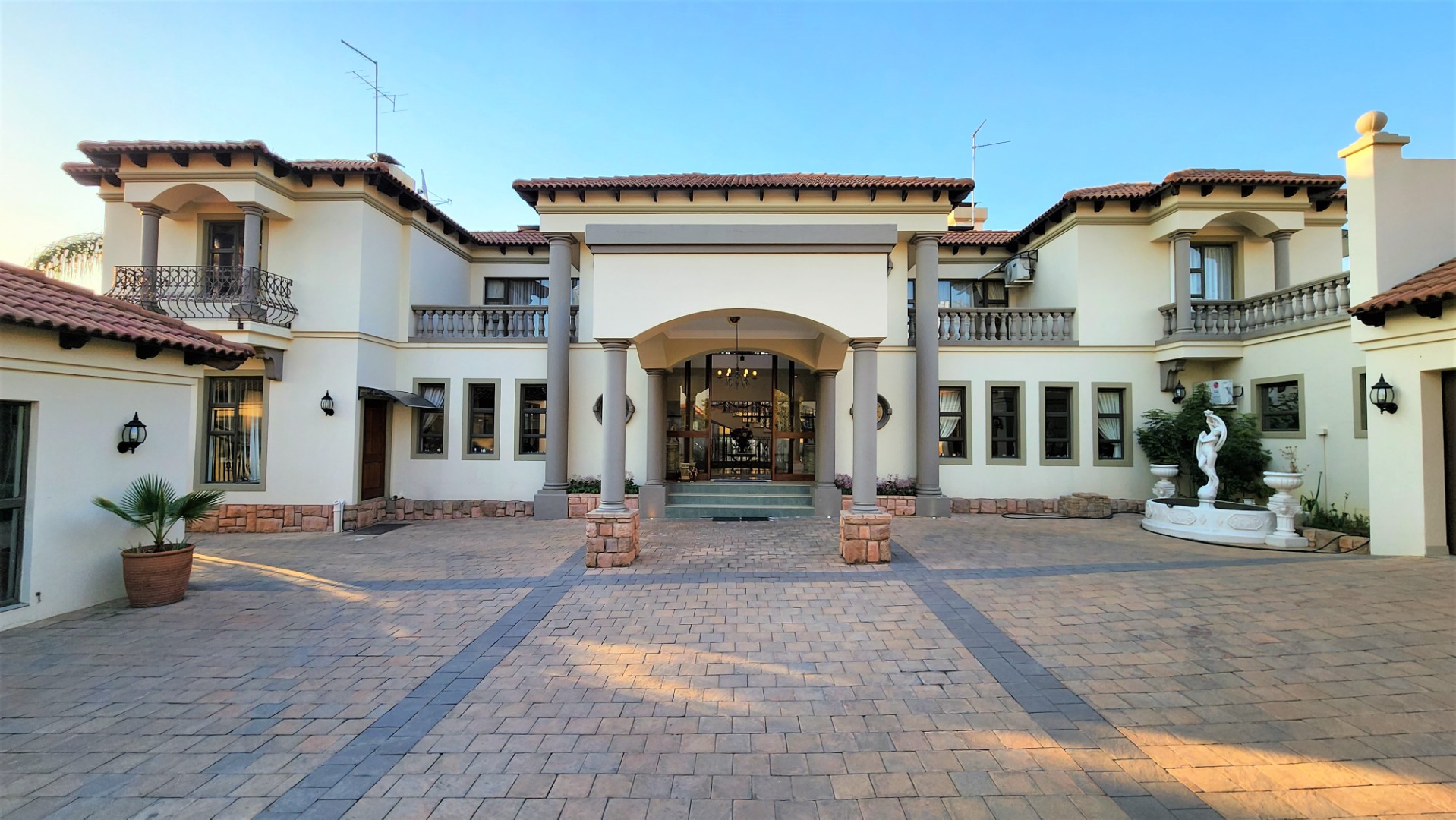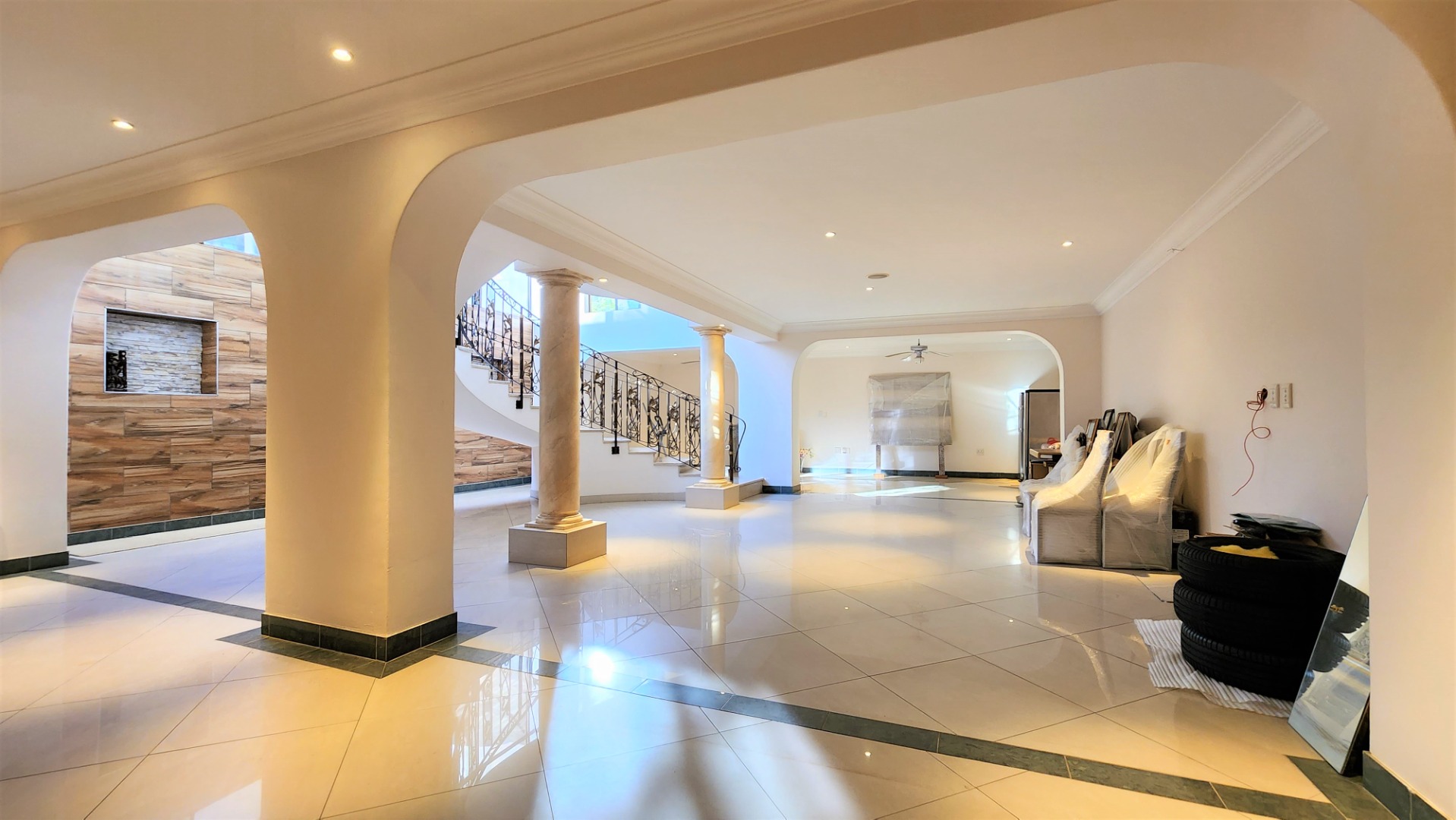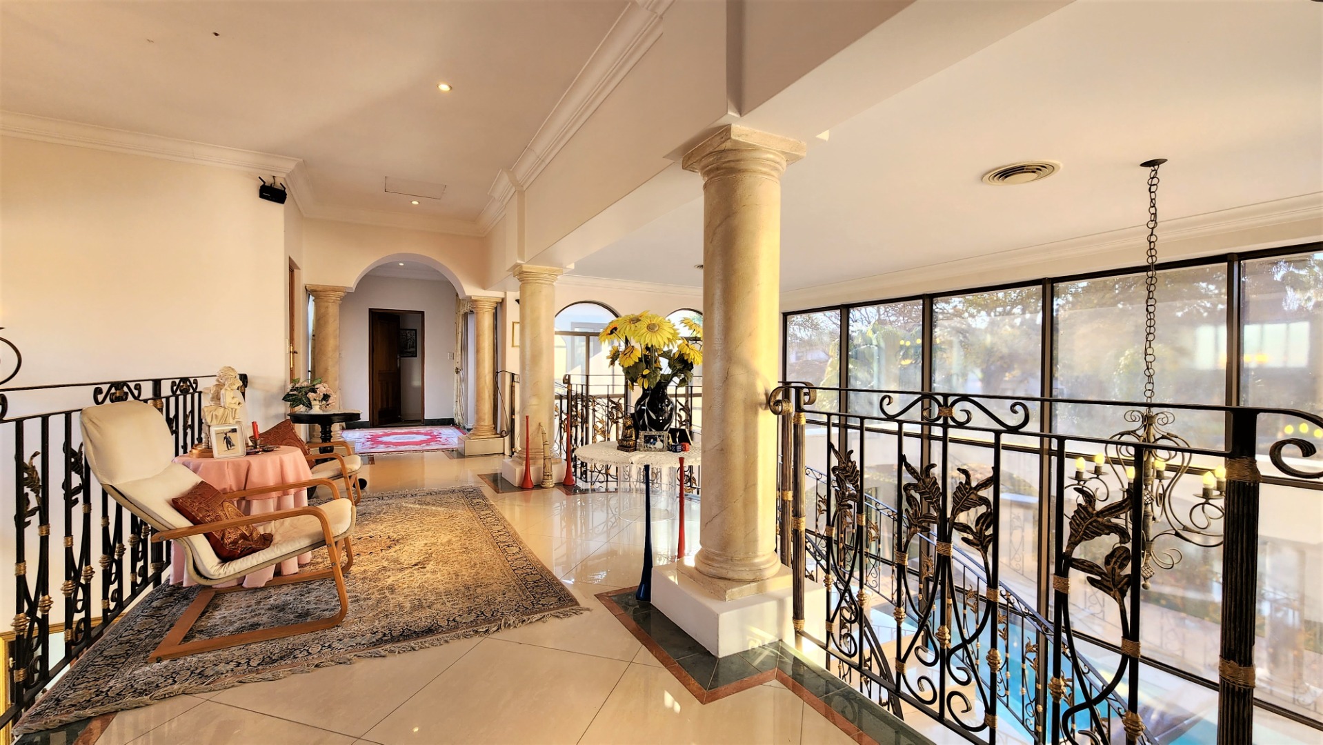 This property is exquisite from every angle. You are welcomed into this home by an impressive porte cochére entrance, where you are struck by the magnificent Tuscan-style architecture from the courtyard into the main entrance. On entering through the large double-doors you are welcomed into a spacious entrance hall with a luxurious floating marble sweeping staircase in front of you, against a full wall of glass.