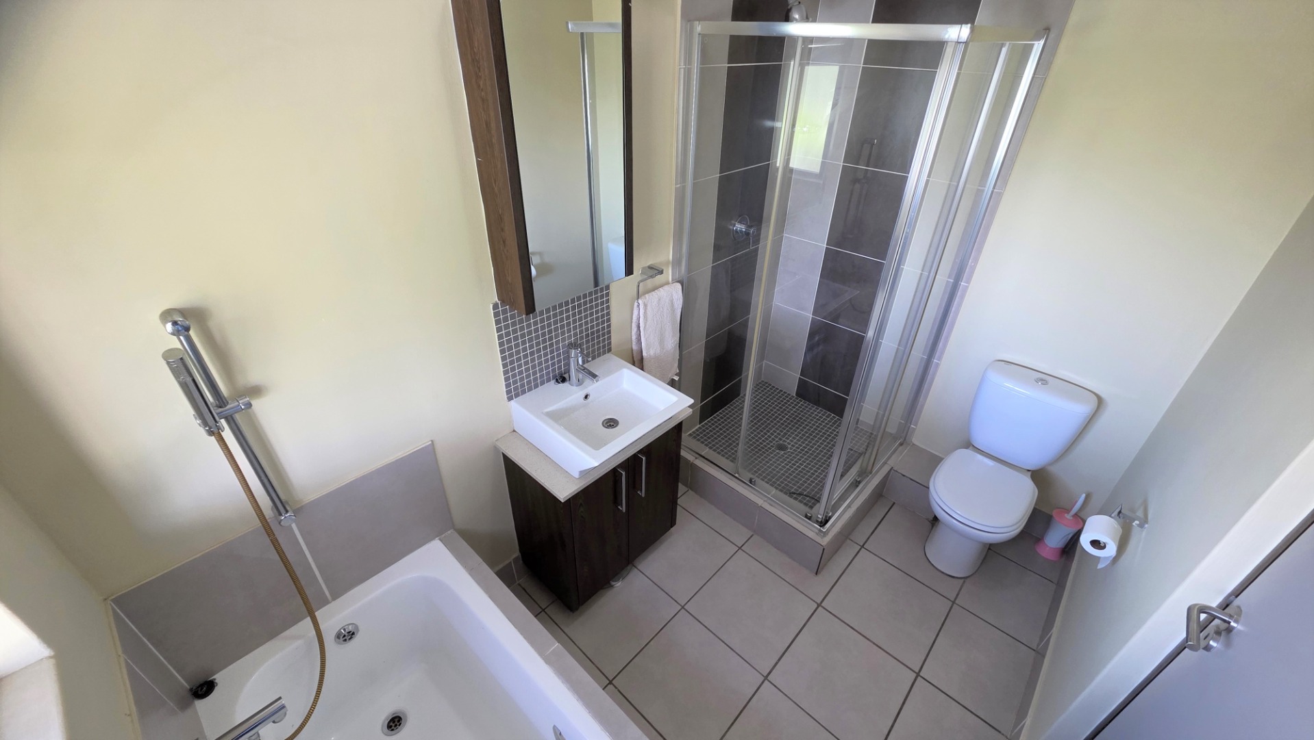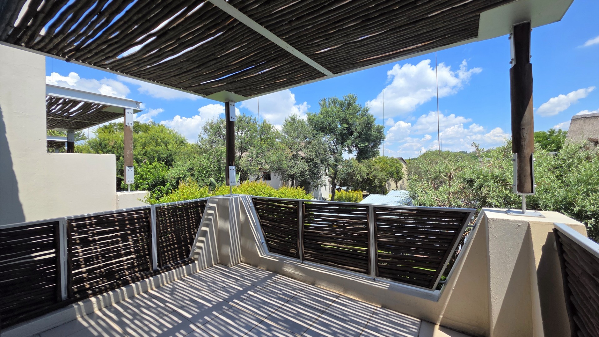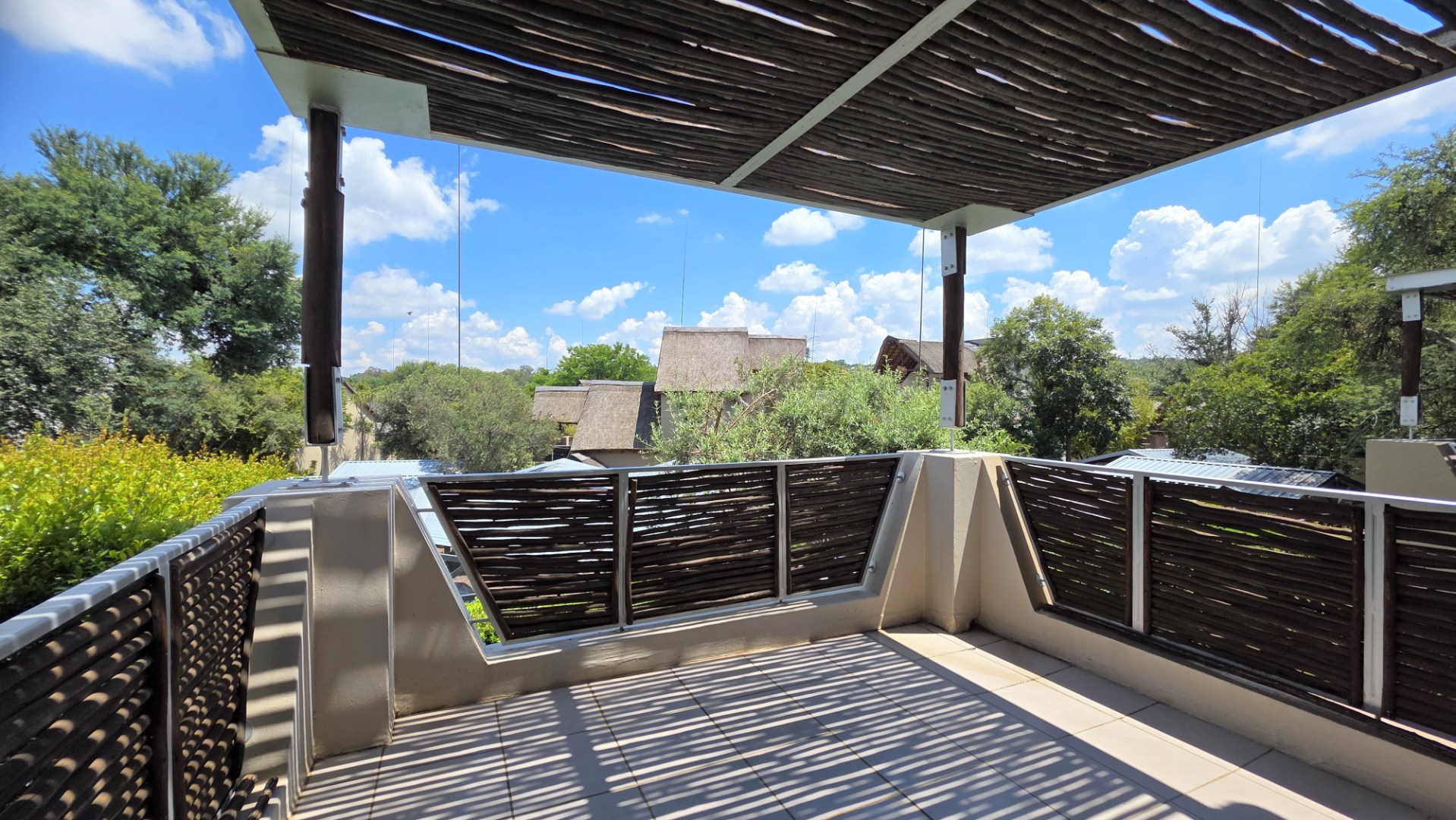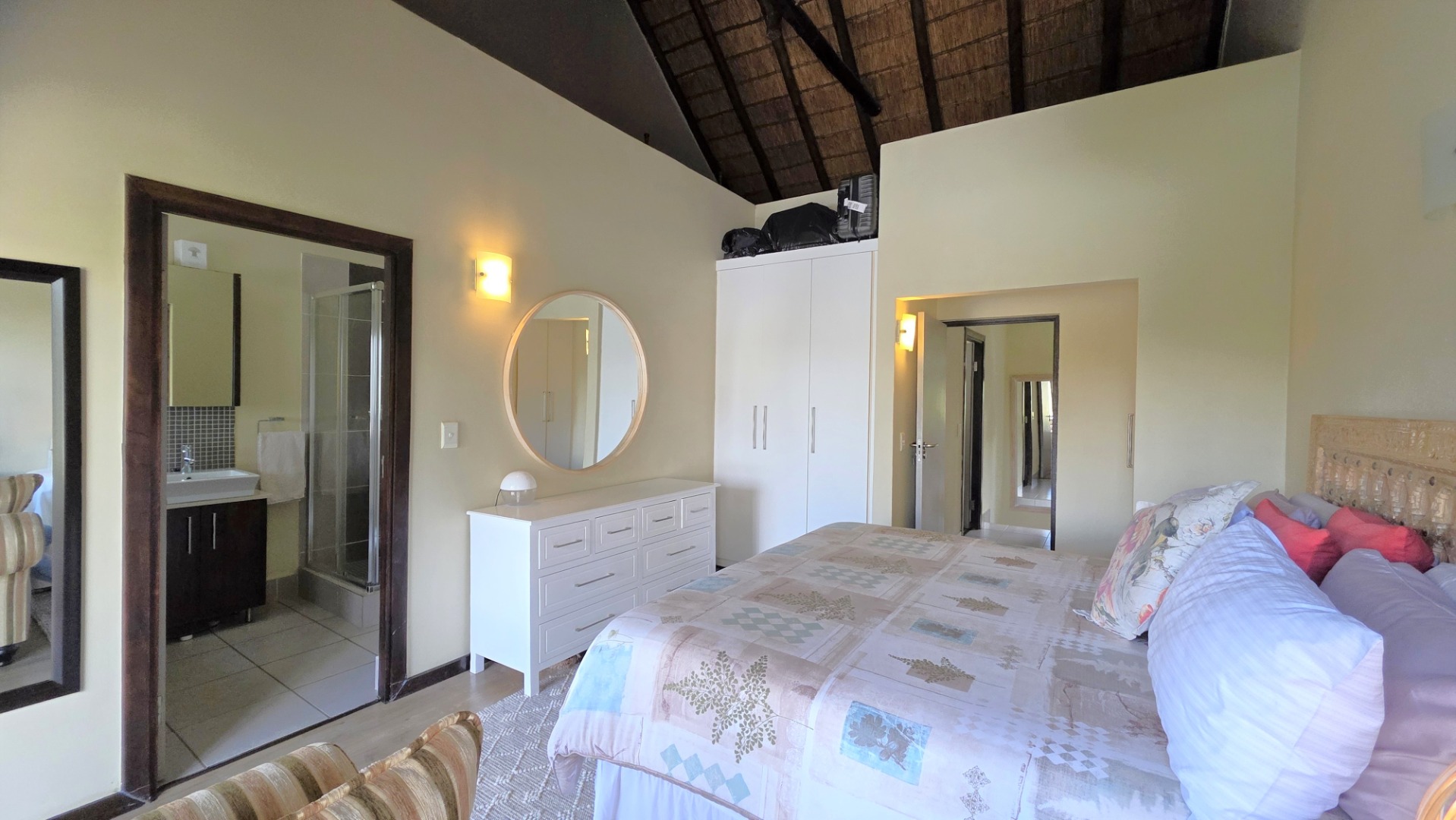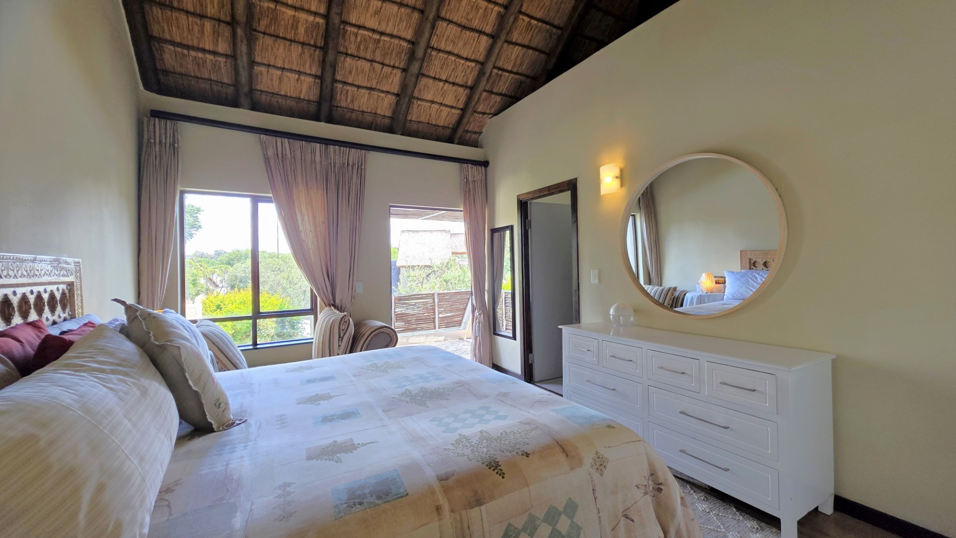 Upstairs, you’ll find two spacious bedrooms, both offering the luxury of their own en-suite bathrooms. The main bedroom is a standout, boasting dramatic double-volume high thatch ceilings that enhance the sense of space, a full en-suite bathroom, and a private balcony with far-reaching views over the surrounding trees and greenery.