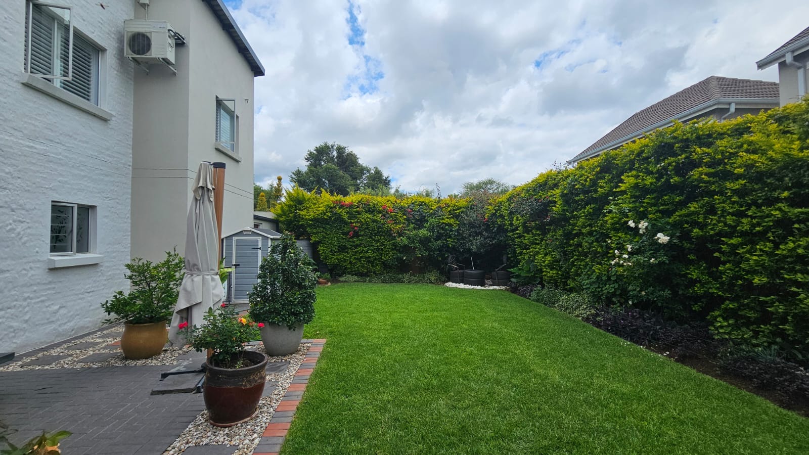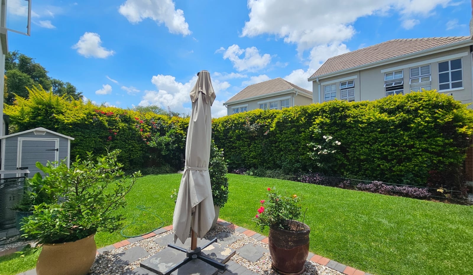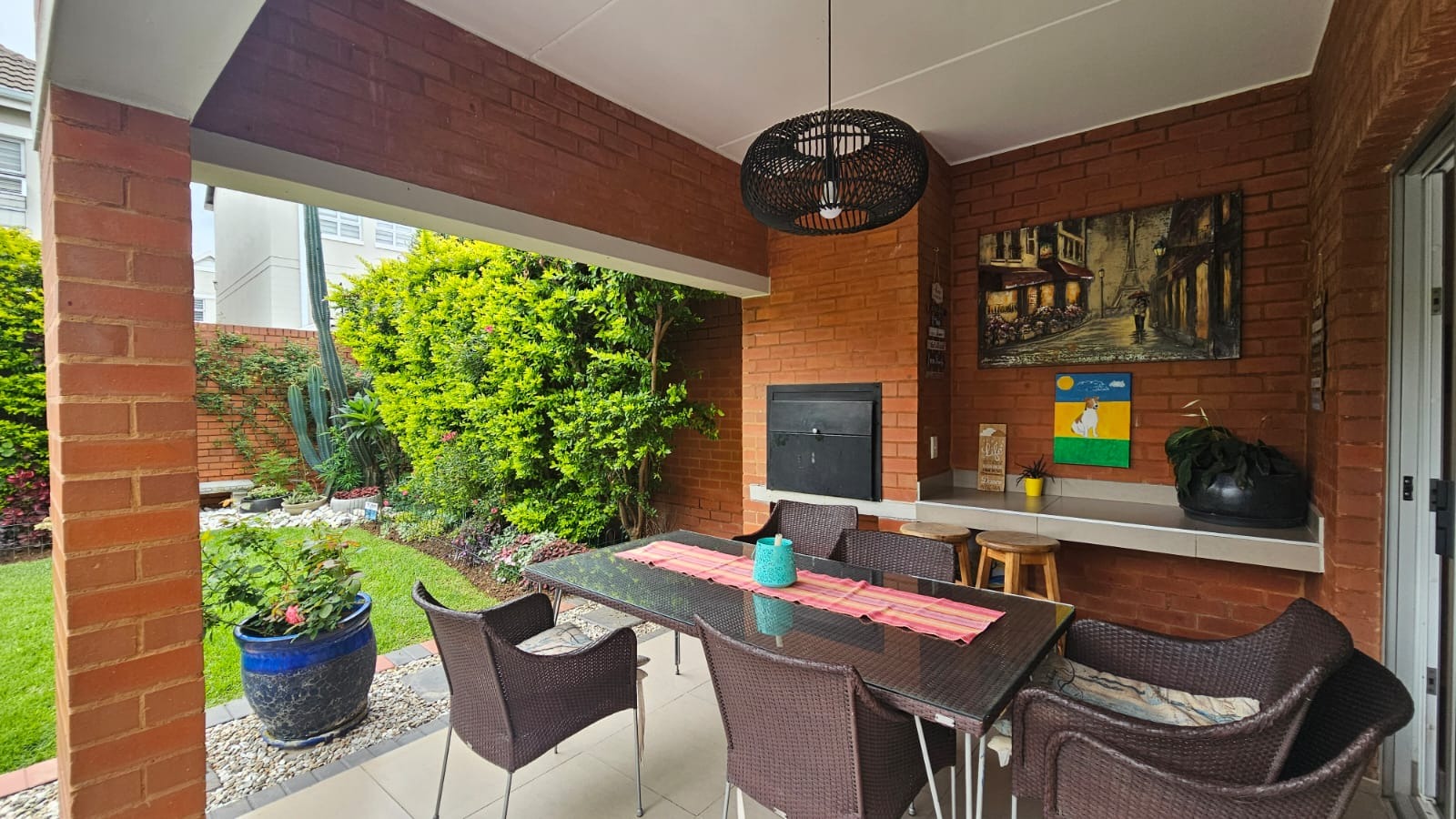 Upon arrival, the home displays striking curb appeal with its modern exterior, featuring a tasteful mix of brick and painted finishes. The private, well-maintained sizeable garden boasts a lush lawn and mature landscaping, complemented by a dedicated outdoor entertainment area. This space includes a covered patio with a built-in braai, perfect for social gatherings, along with an upper-level balcony for additional outdoor relaxation. Practical features such as a Wendy house, a Jojo tank, and an irrigation system enhance the outdoor functionality.