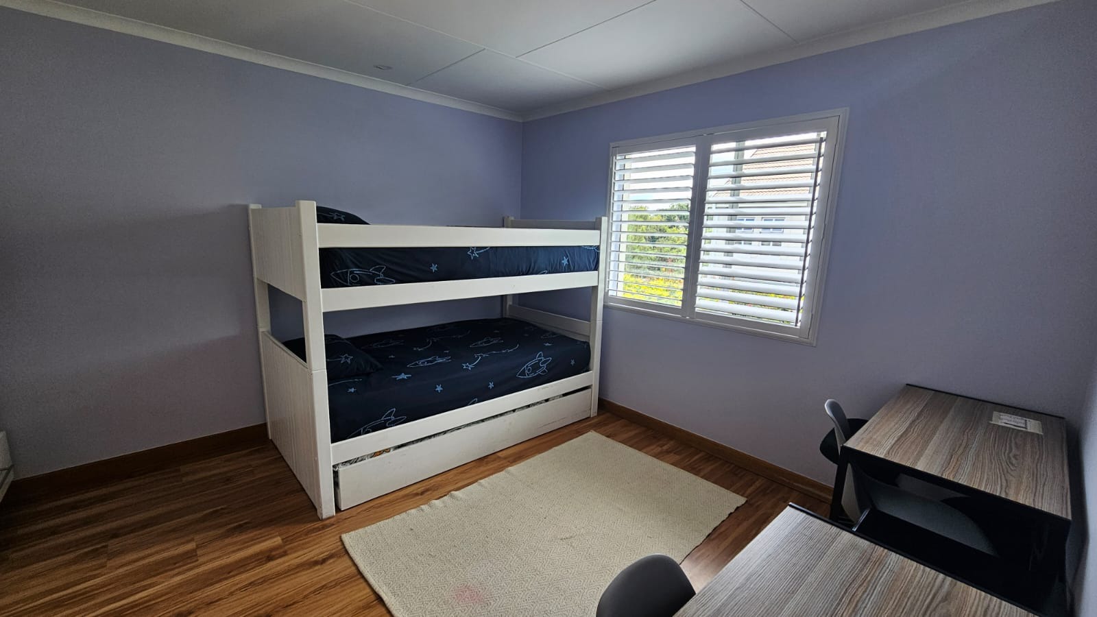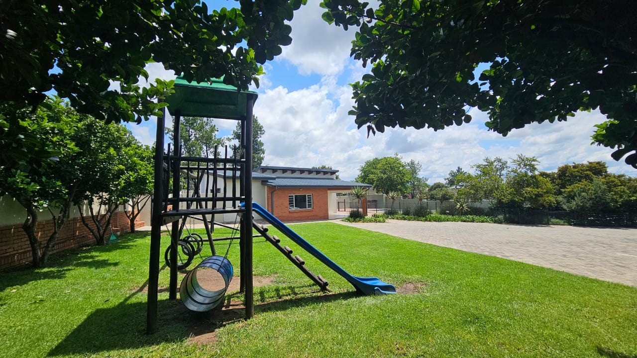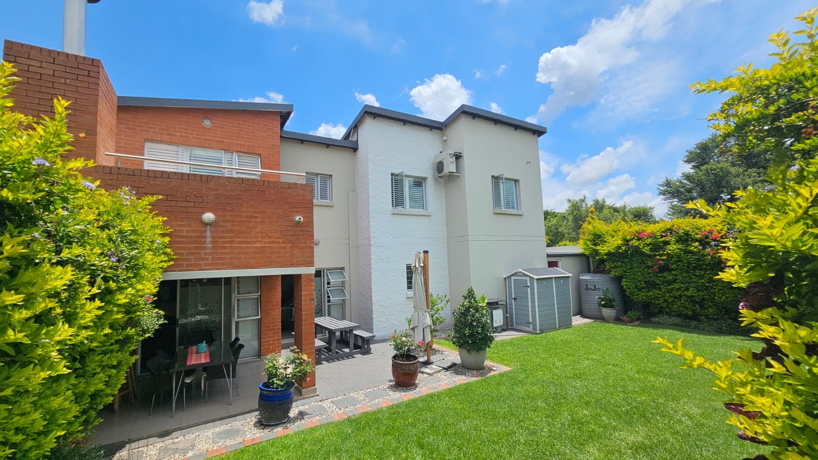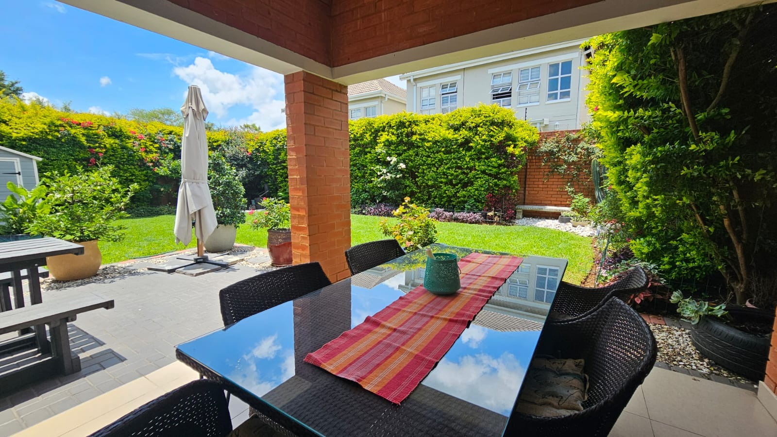 Upon arrival, the home displays striking curb appeal with its modern exterior, featuring a tasteful mix of brick and painted finishes. The private, well-maintained sizeable garden boasts a lush lawn and mature landscaping, complemented by a dedicated outdoor entertainment area. This space includes a covered patio with a built-in braai, perfect for social gatherings, along with an upper-level balcony for additional outdoor relaxation. Practical features such as a Wendy house, a Jojo tank, and an irrigation system enhance the outdoor functionality.
