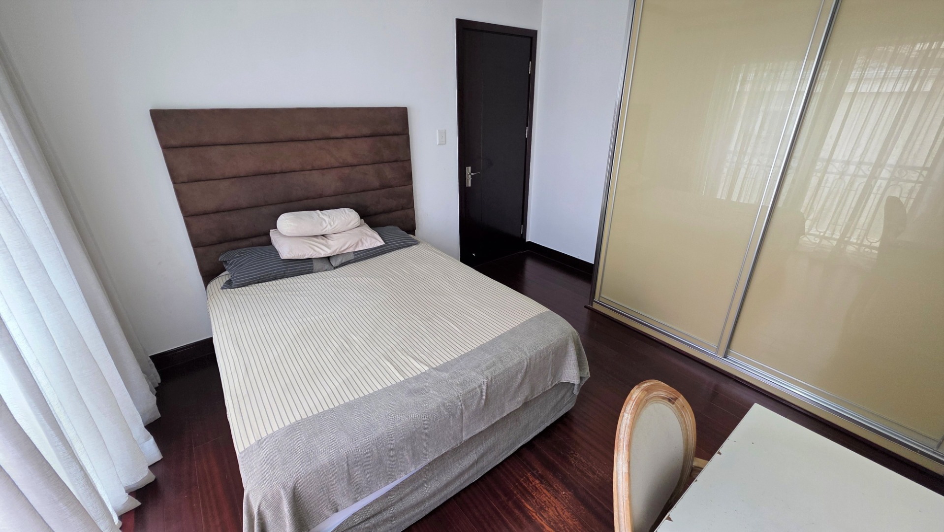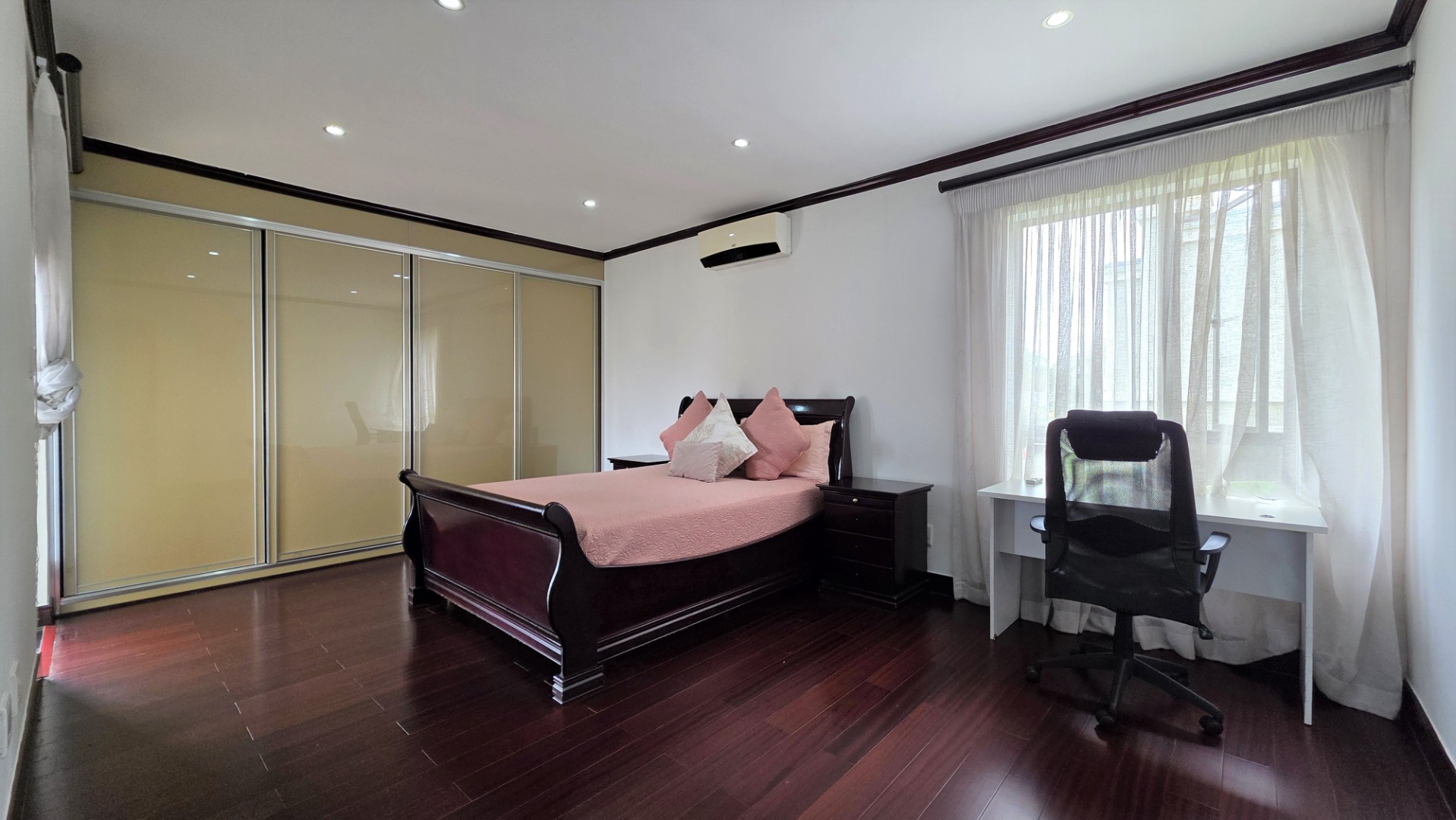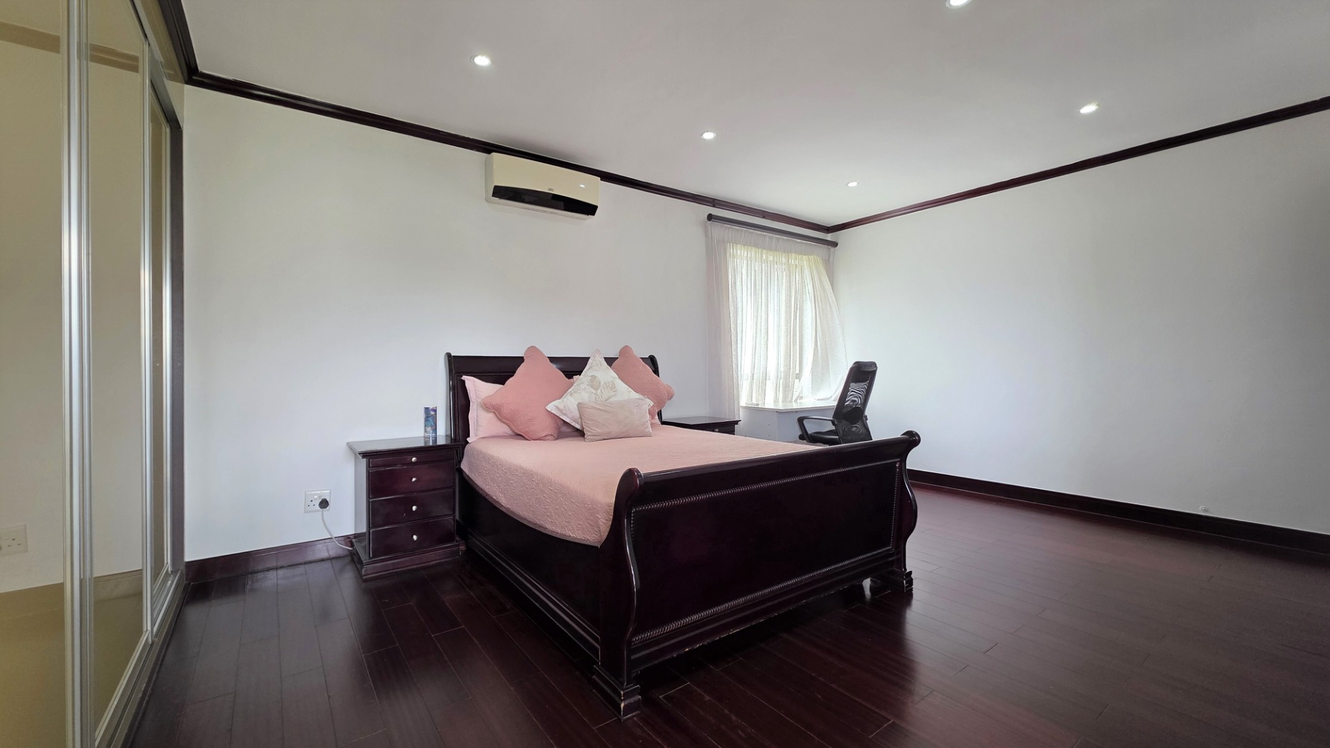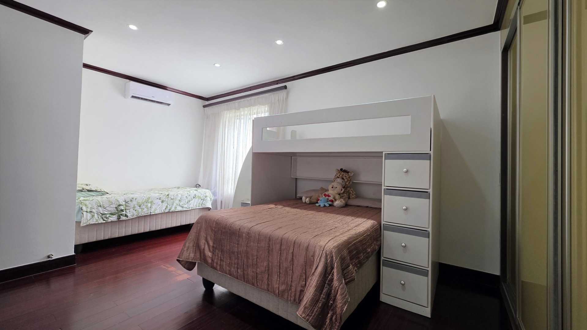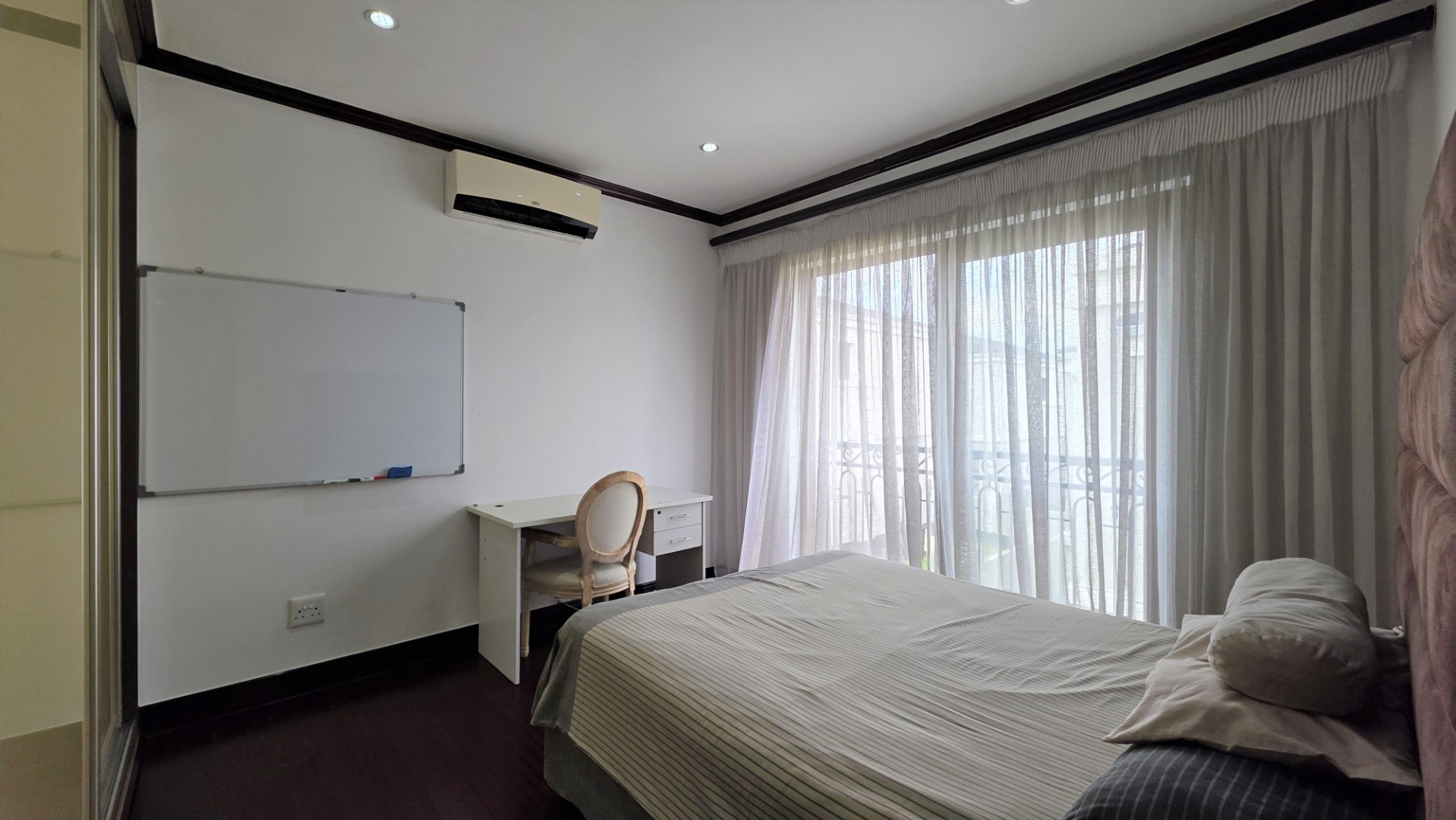 Moving up stairs is a landing area which provides easy access to the guest toilet. On the first level you will find a pyjama lounge area, with space for an open-plan study nook. This area leads to three modern air-conditioned bedrooms with wood-look laminate flooring and modern high-gloss cabinetry. The second and third bedrooms are spacious, and feature ample cupboard space, one with it’s own balcony, and share a full, modern bathroom. The large main bedroom includes generous high-gloss built-in cupboards, a balcony, and a luxurious full en-suite bathroom, providing the perfect retreat for relaxation and comfort.
