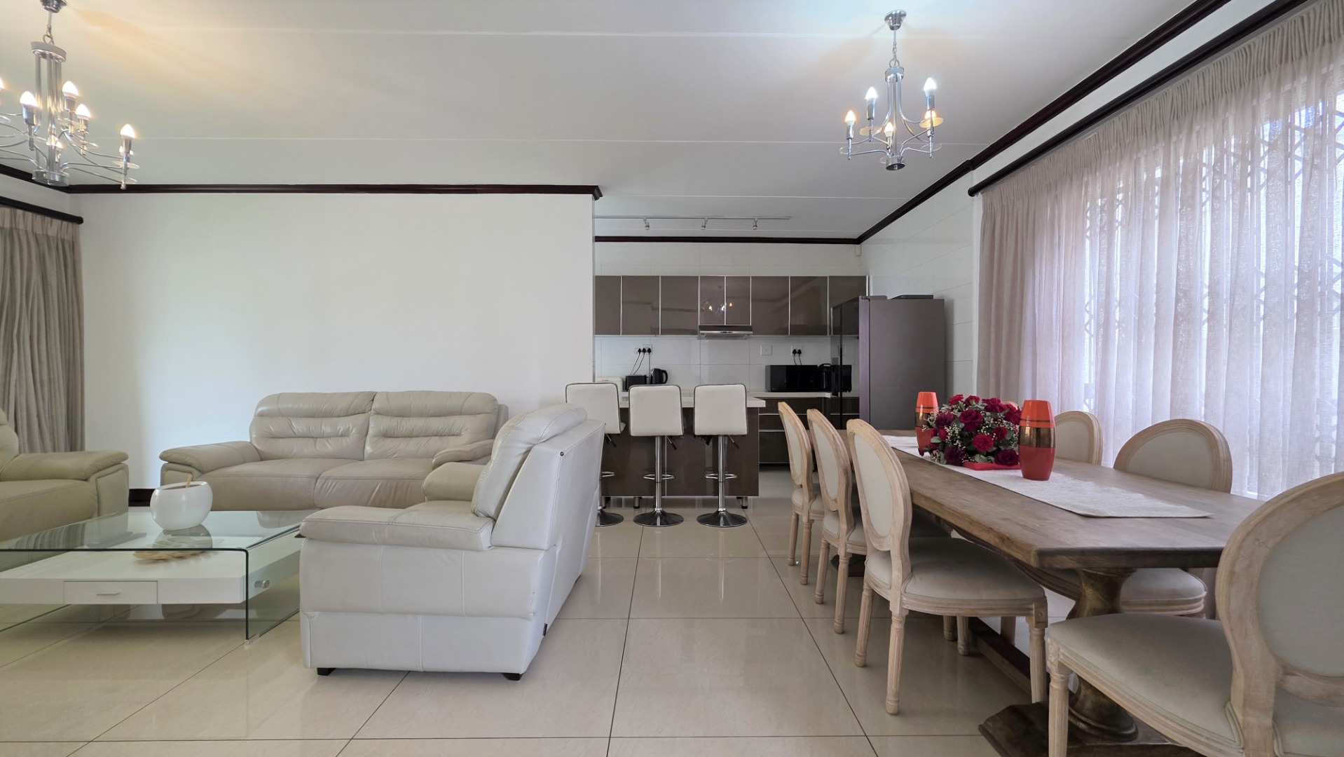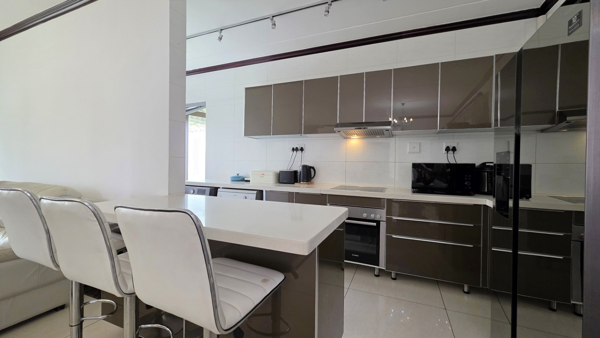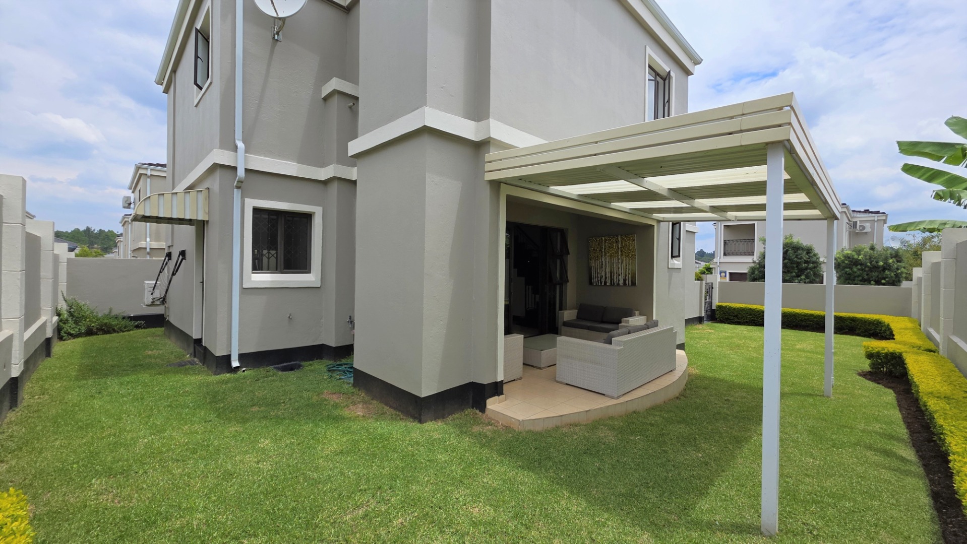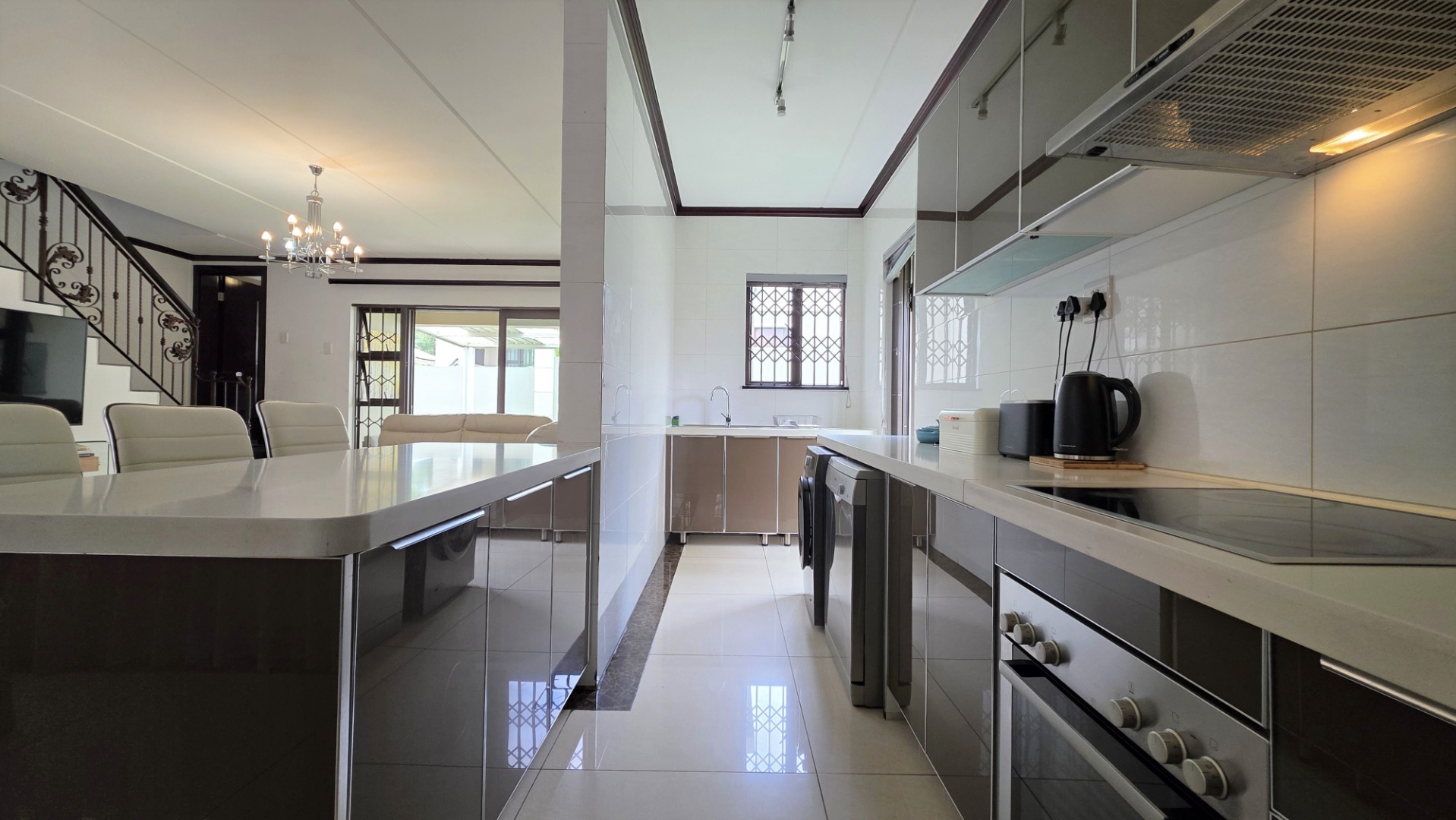 Nestled in a secure and prestigious upmarket estate, this stunning property offers a blend of modern luxury and practicality. Upon entering, you are greeted by a spacious open-plan living area, featuring a stylish lounge and dining room, with sleek white high-gloss floor tiles throughout, creating a bright and welcoming atmosphere. The open-plan modern kitchen is a chef’s dream, boasting high-gloss cabinetry, quartz stone countertops, a hob with extractor fan, and an under-counter oven. It also provides ample space for a double fridge and two under-counter appliances. A convenient sizeable storage room located under the stairs completes the ground level. The living area flows seamlessly out onto a covered patio, with built-in braai, and the beautifully manicured wrap-around garden, ideal for outdoor relaxation or entertaining.