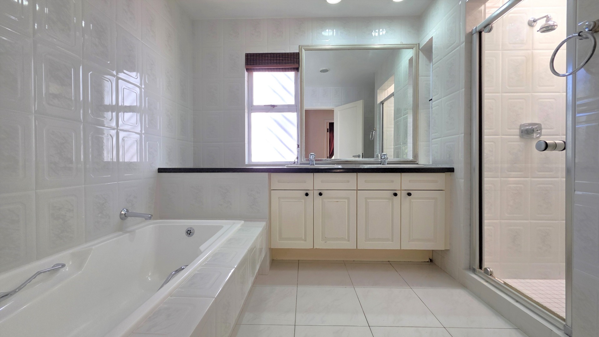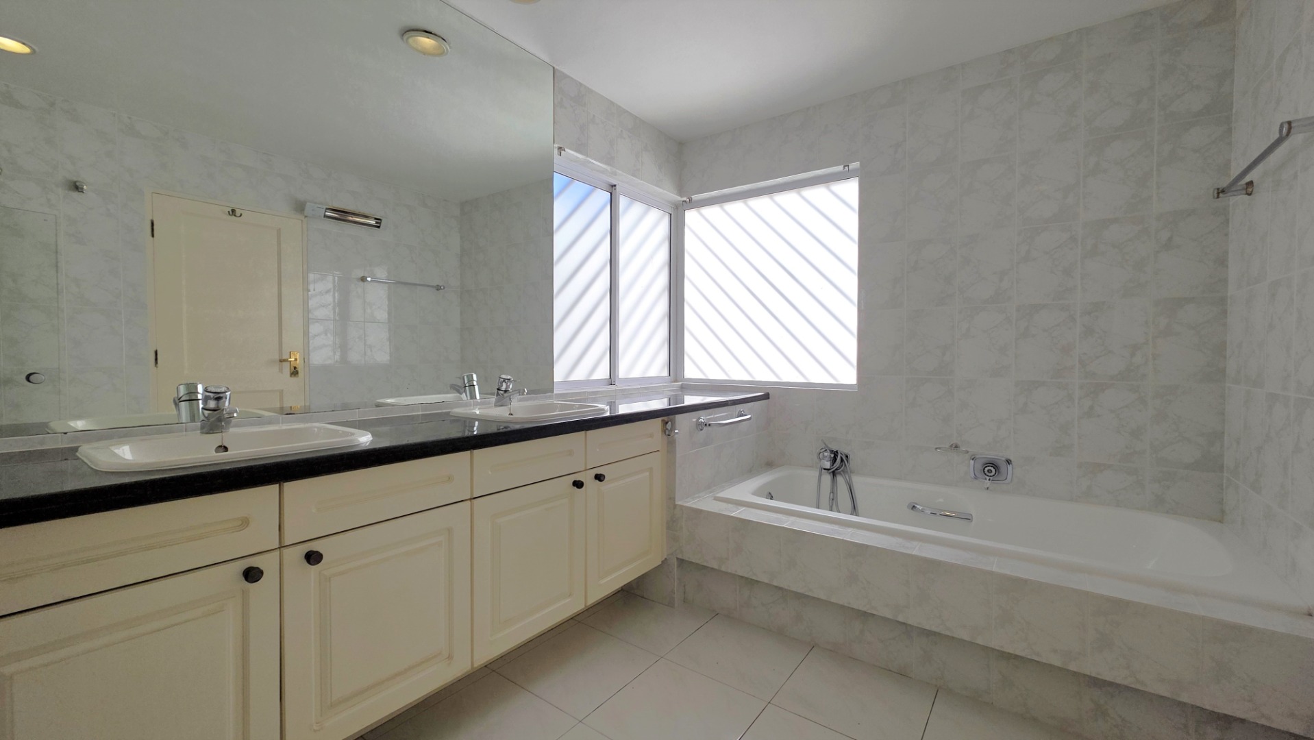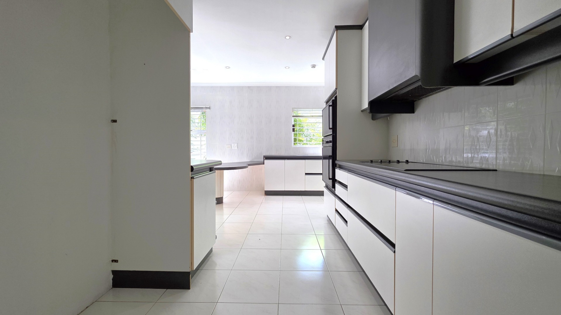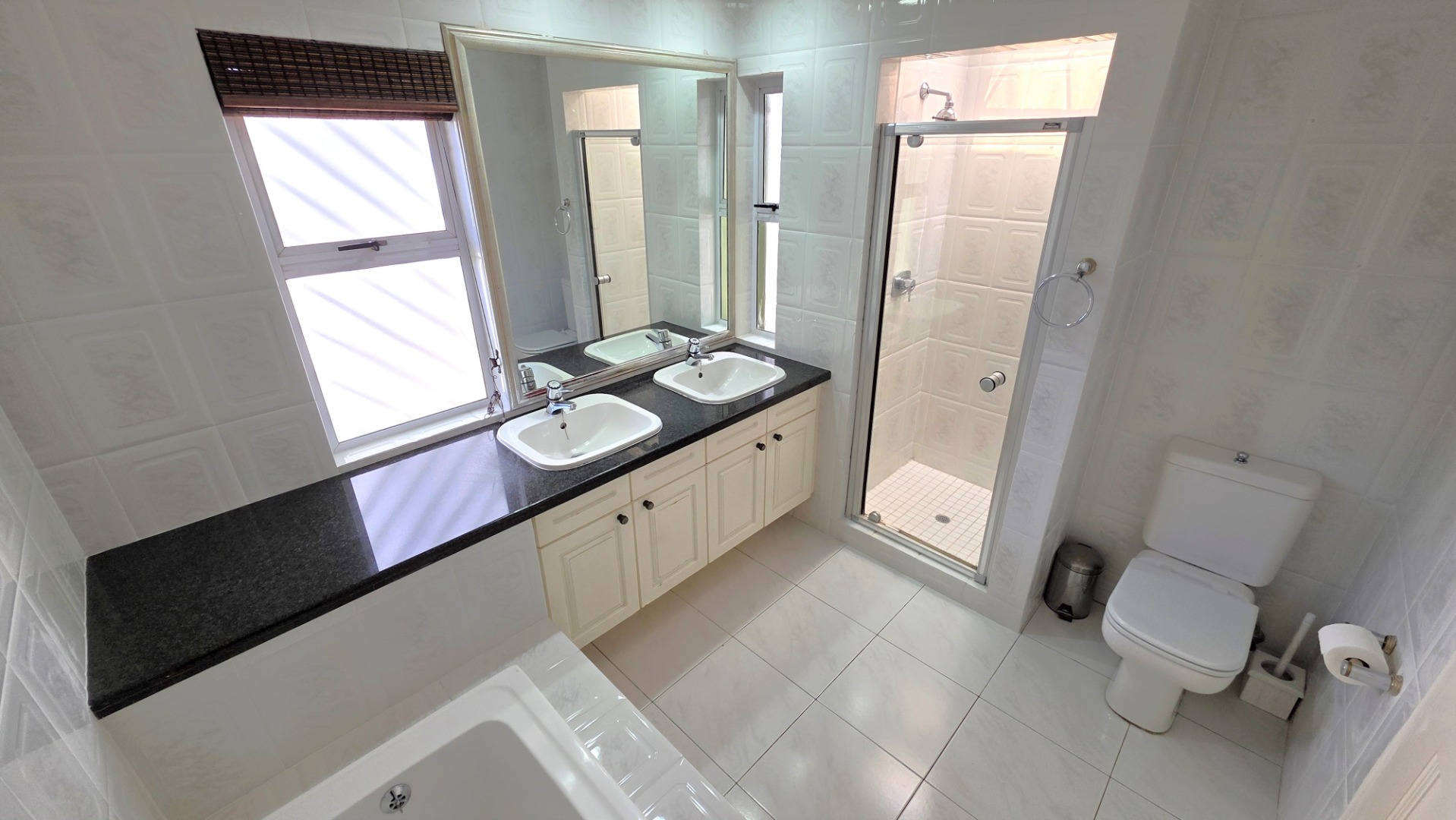 The kitchen is thoughtfully designed with a breakfast nook, ample cabinetry, space for a double-door fridge, and a separate scullery and pantry for added convenience. There is dedicated space for three appliances, namely a dishwasher, washing machine, and tumble dryer, ensuring practicality for modern living. The home comprises four well-sized bedrooms, with the master suite featuring a walk-through closet and a full en-suite bathroom complete with a shower, bath, and toilet. The remaining bedrooms share a well-appointed family bathroom, and a separate guest toilet adds further convenience.