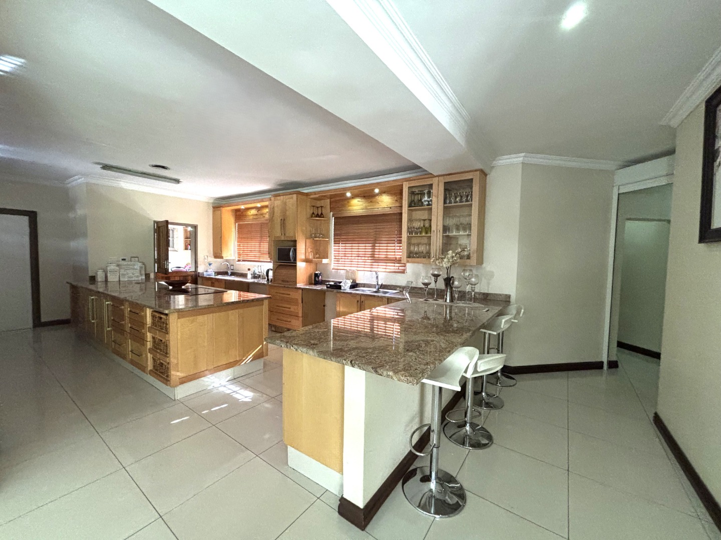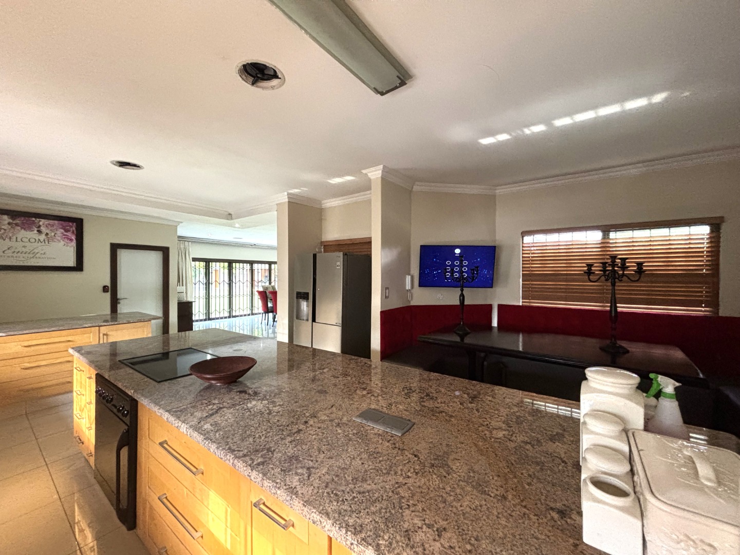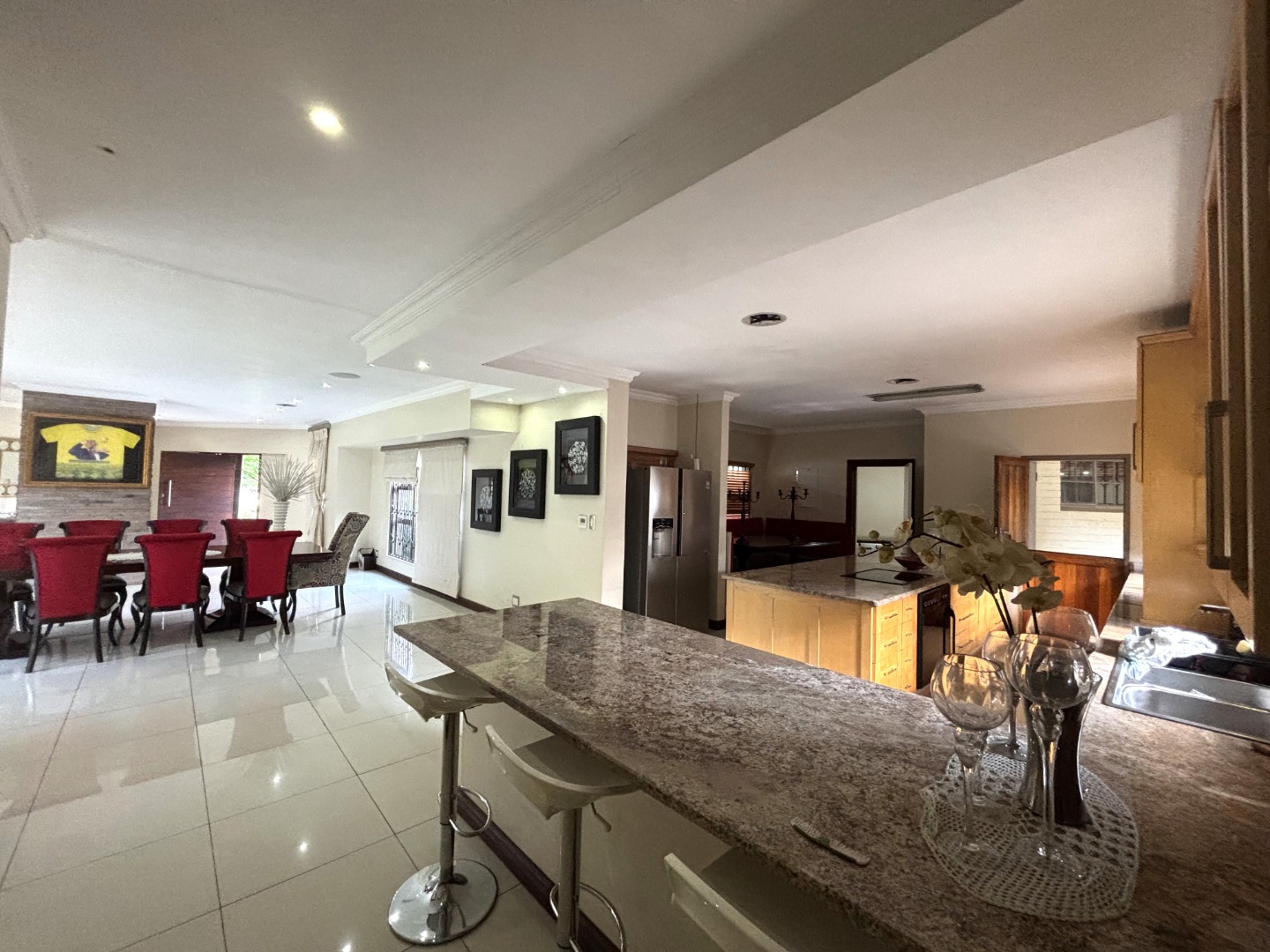 Open-plan dining room and gourmet kitchen with granite countertops and a separate scullery
