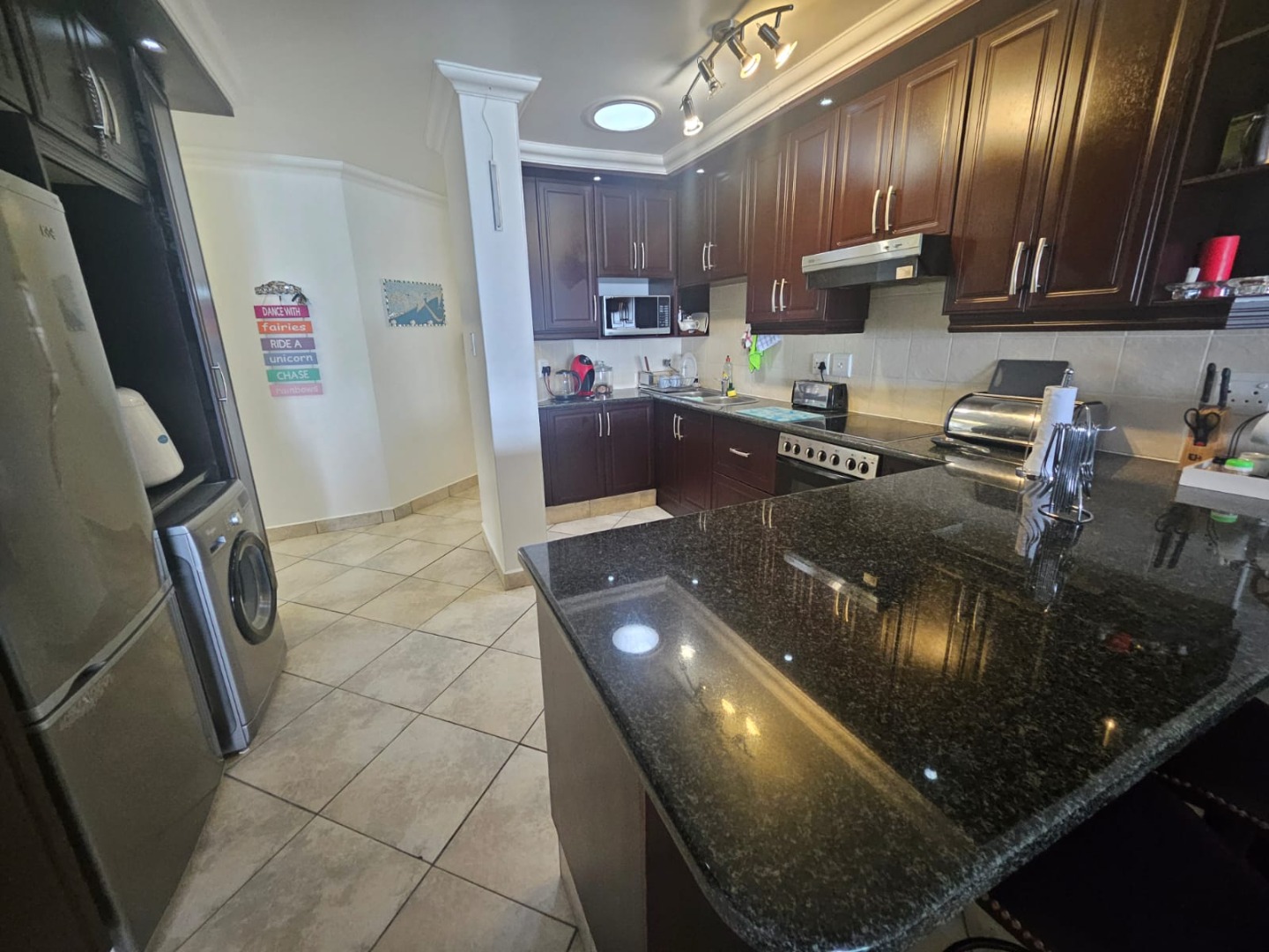 The main bedroom includes an ensuite full bathroom, while a second bathroom serves the other bedrooms with a shower and toilet. The modern kitchen features granite countertops, ample cupboard space and opens to the living and dining areas, delivering a warm, open-plan feel.