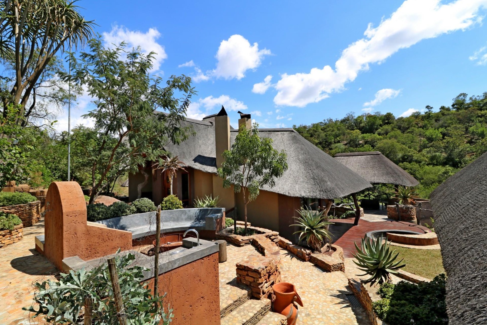 The spacious lounge and dining areas open onto three wooden decks, complemented by two thatched lapas—one with a gas braai and a large entertainment deck. A separate open-air braai area surrounds a raised firepit, perfect for relaxed gatherings. A stone path leads from the house down to a stream in the ravine below, complete with private rock pools.
