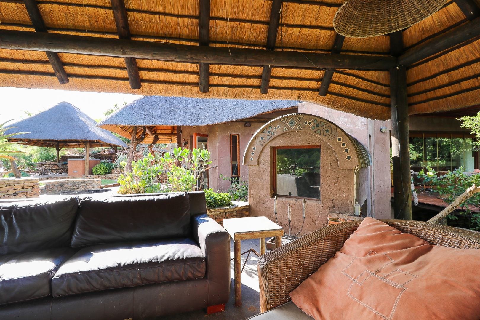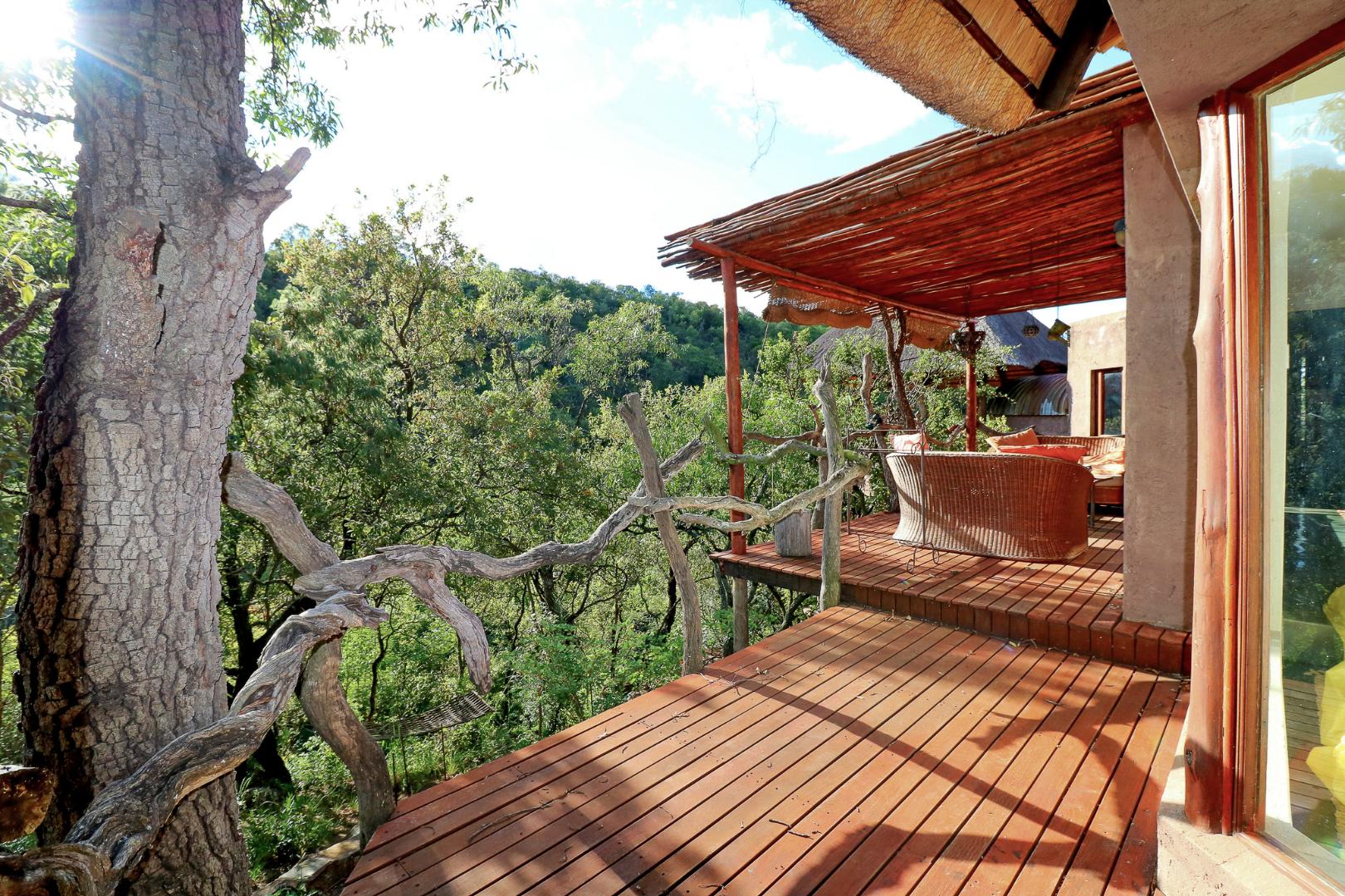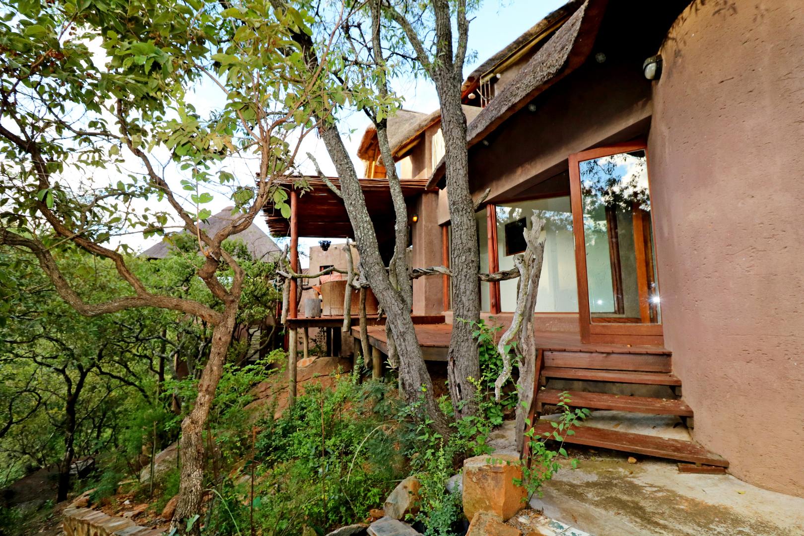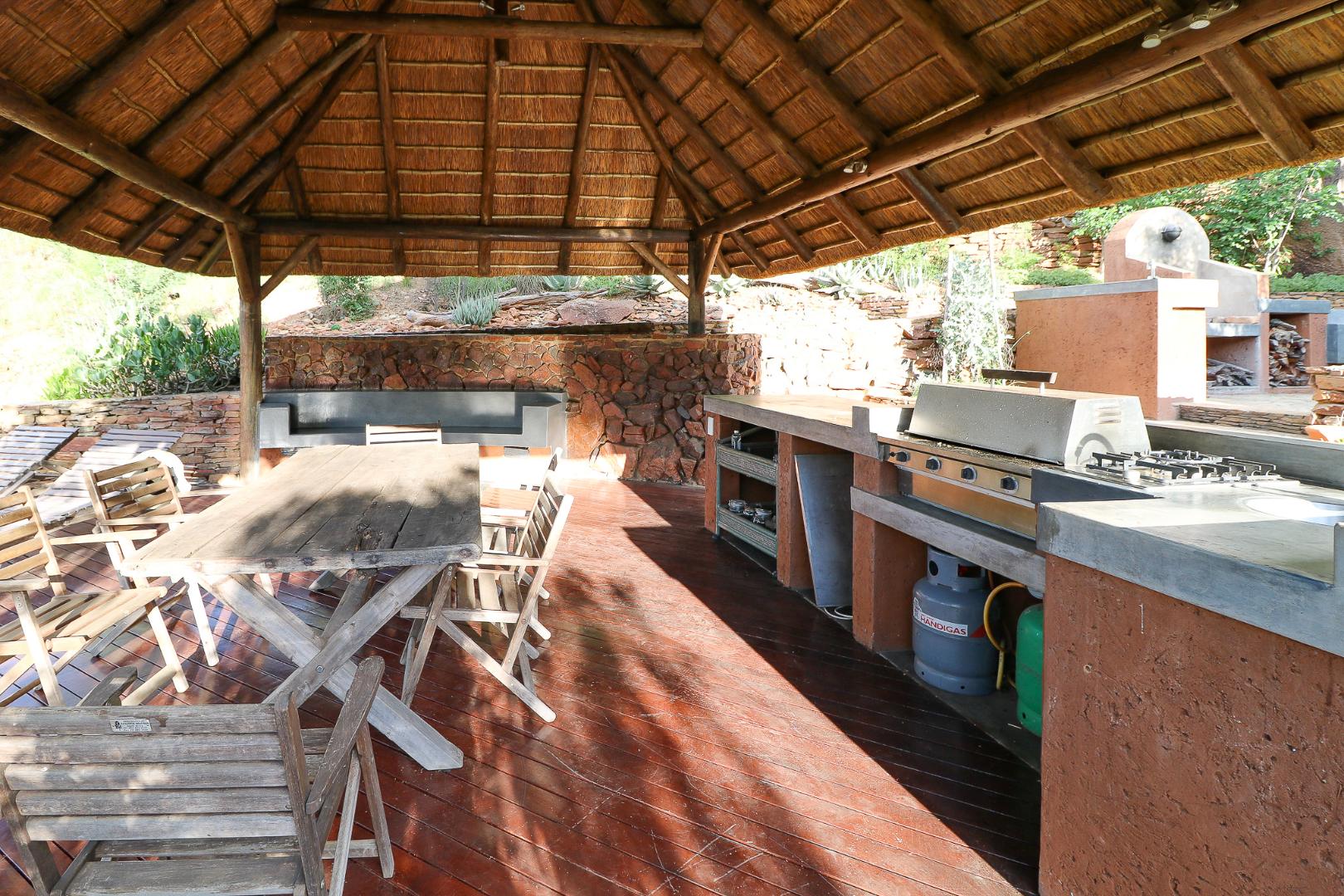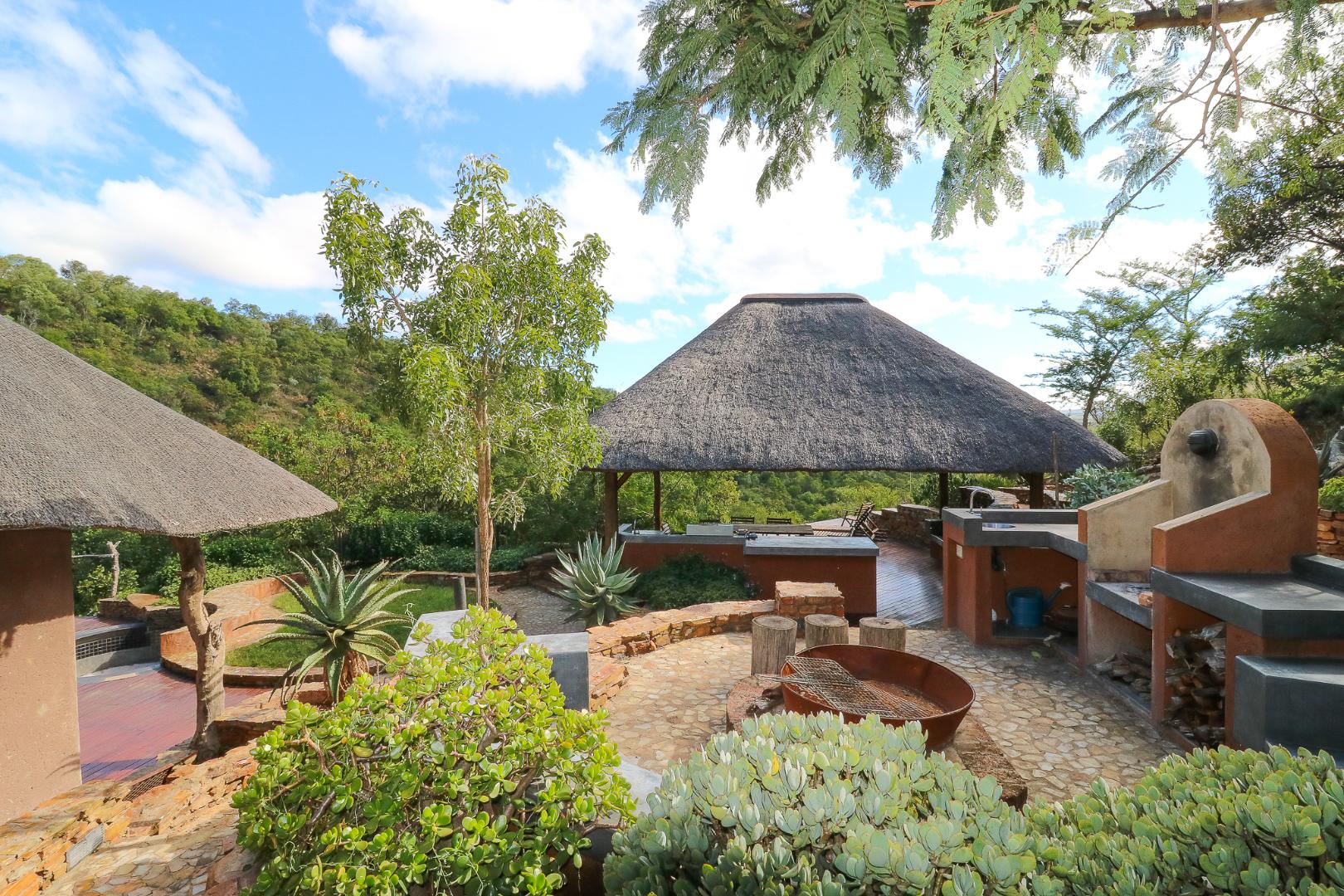 The spacious lounge and dining areas open onto three wooden decks, complemented by two thatched lapas—one with a gas braai and a large entertainment deck. A separate open-air braai area surrounds a raised firepit, perfect for relaxed gatherings. A stone path leads from the house down to a stream in the ravine below, complete with private rock pools.
