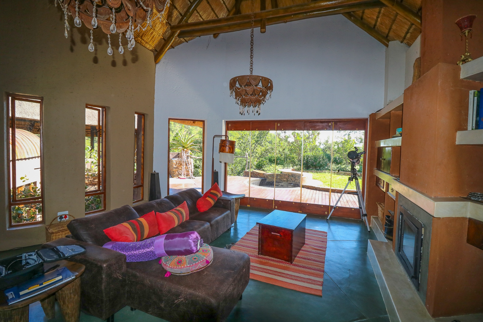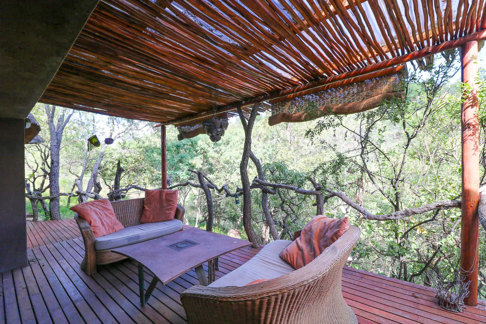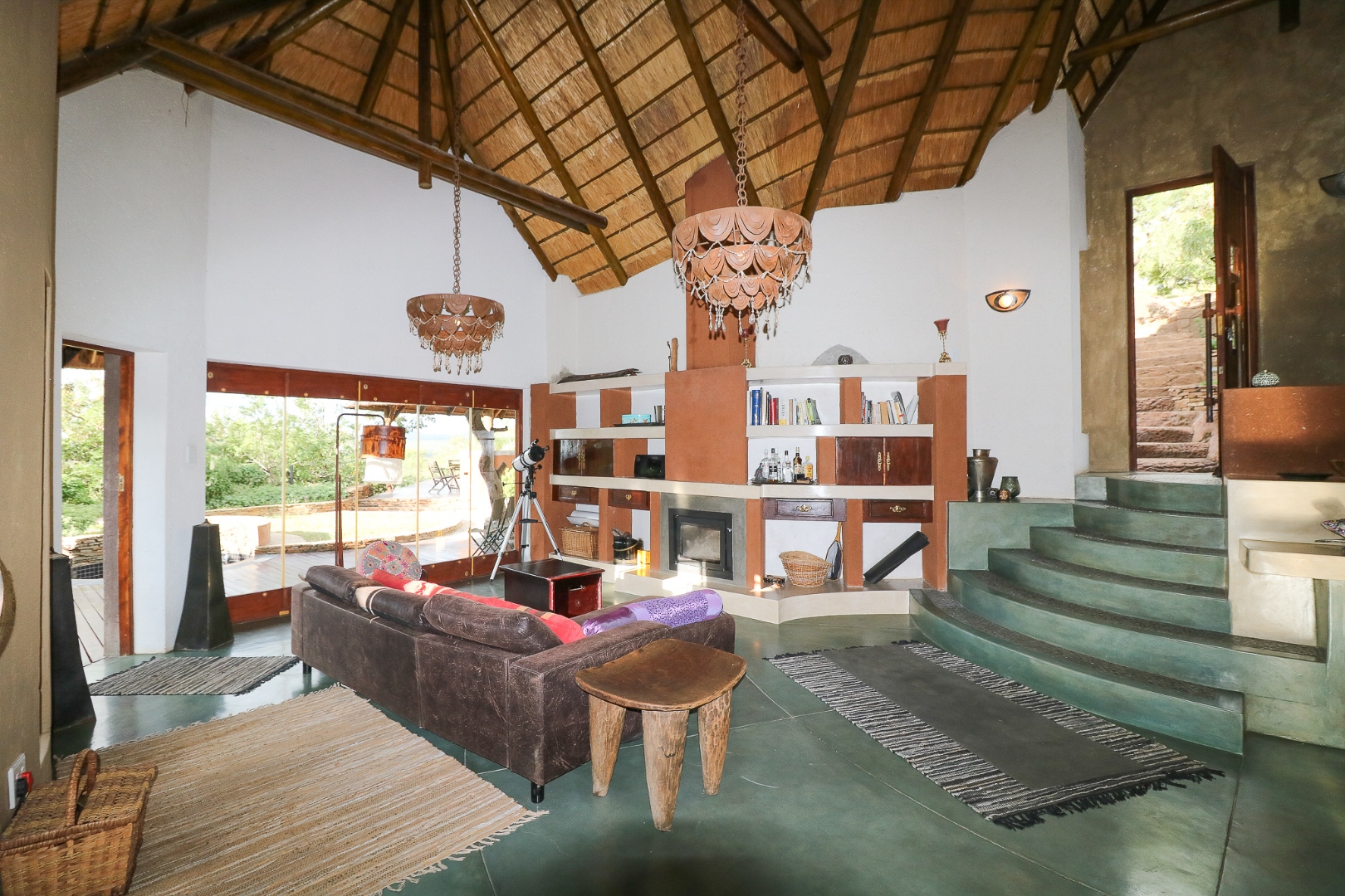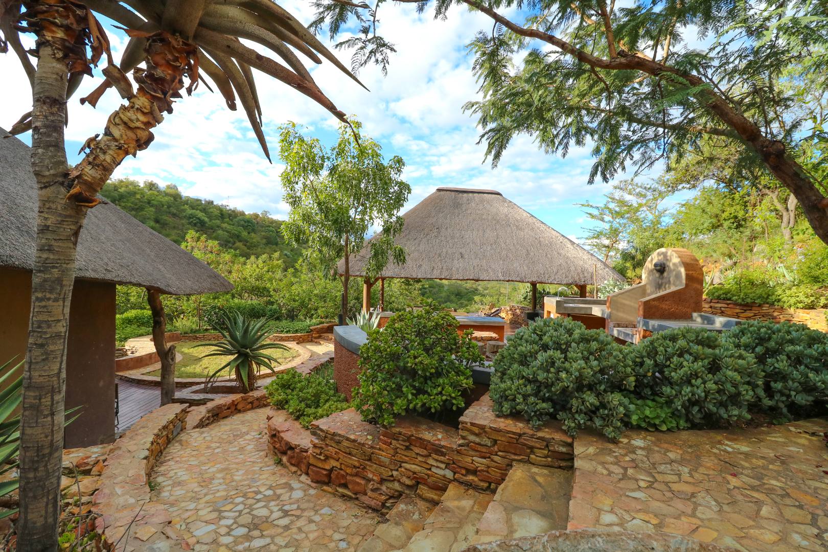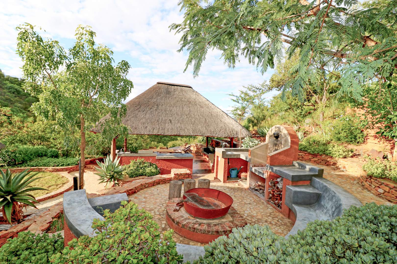 The spacious lounge and dining areas open onto three wooden decks, complemented by two thatched lapas—one with a gas braai and a large entertainment deck. A separate open-air braai area surrounds a raised firepit, perfect for relaxed gatherings. A stone path leads from the house down to a stream in the ravine below, complete with private rock pools.