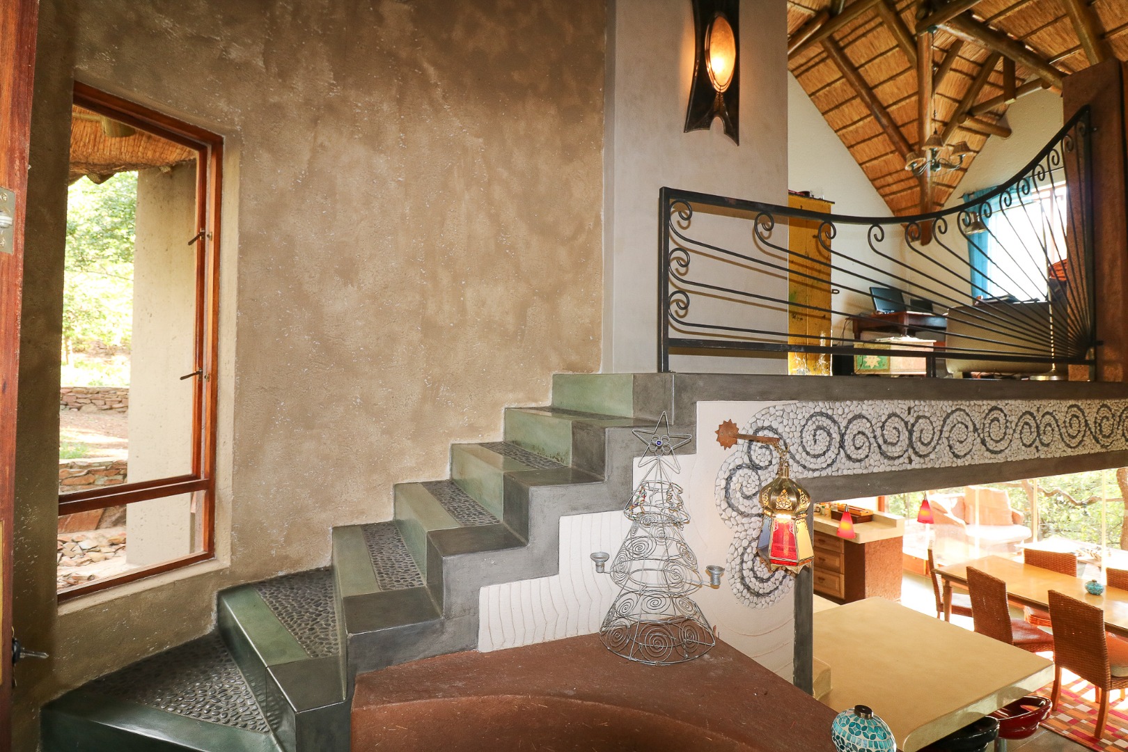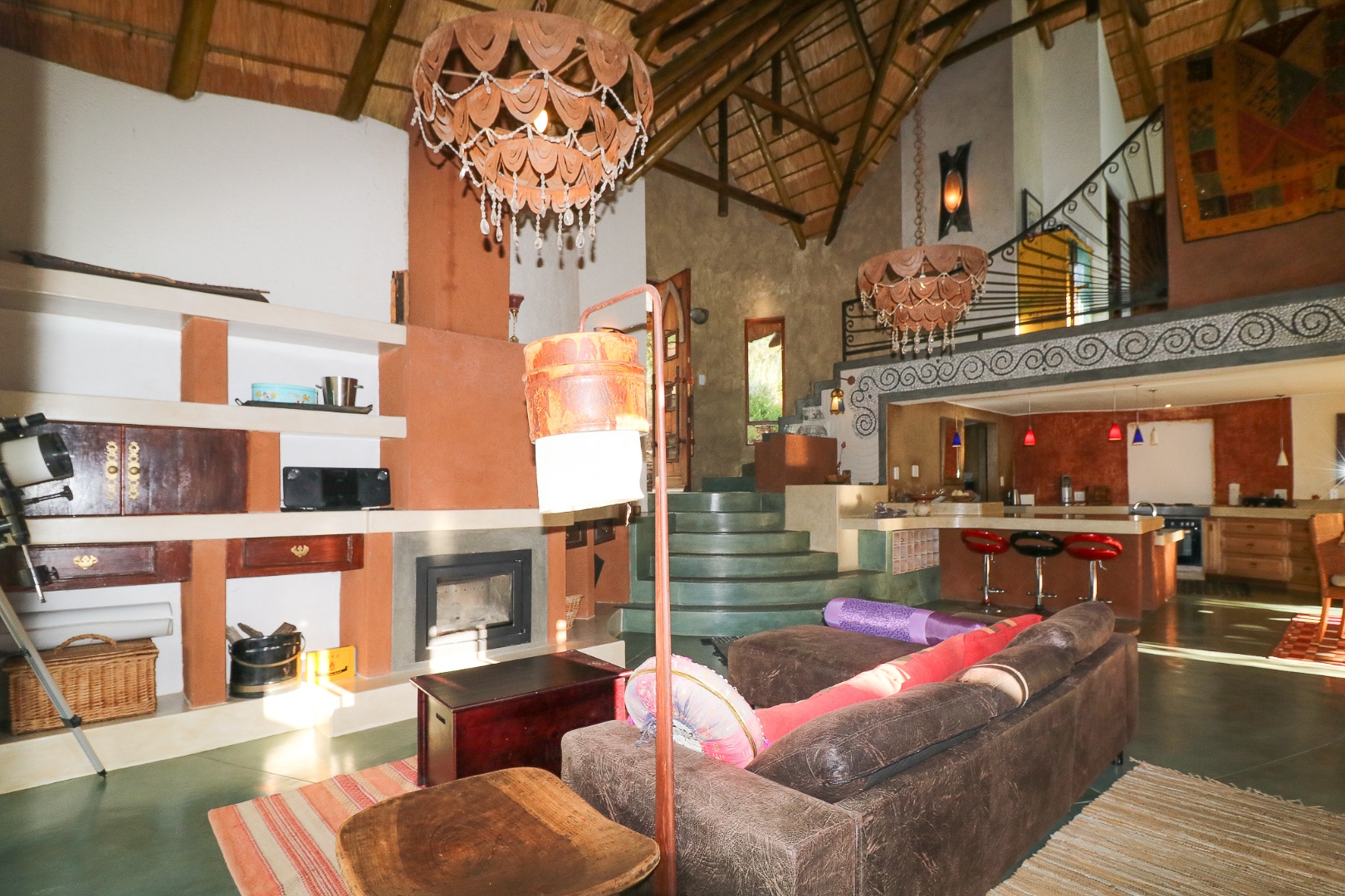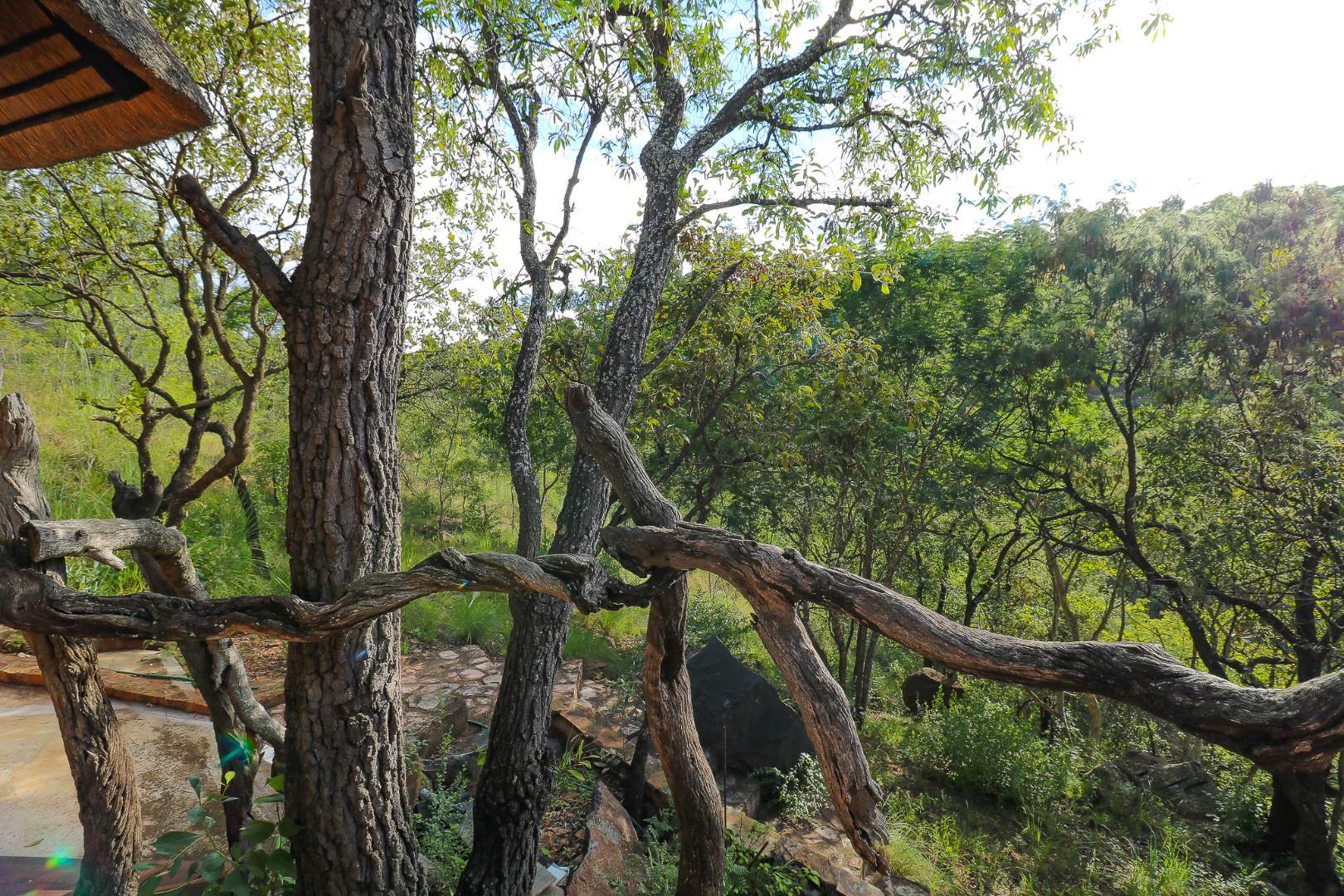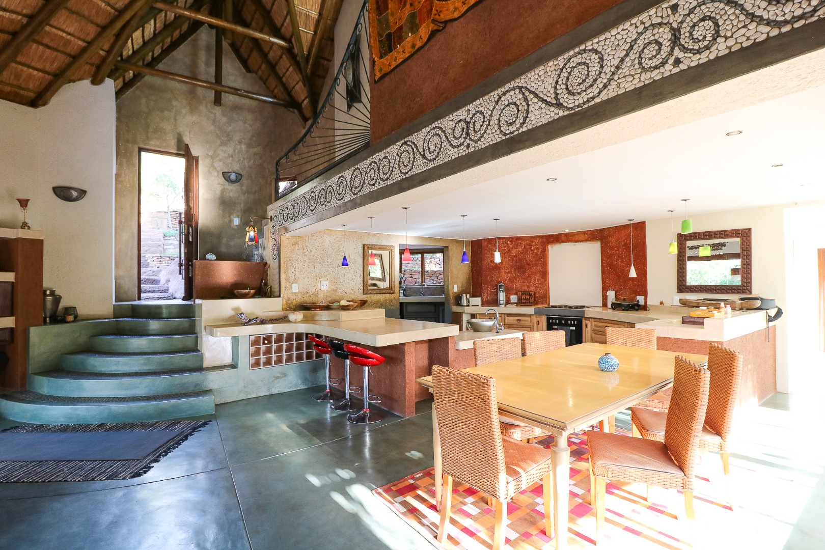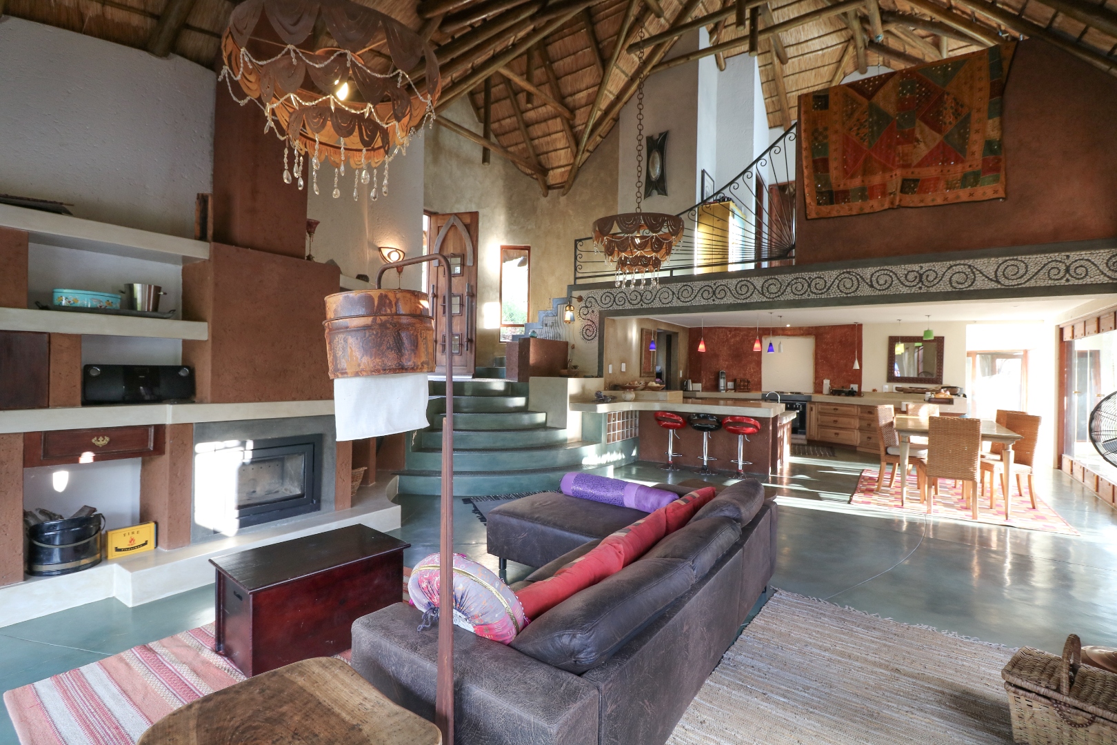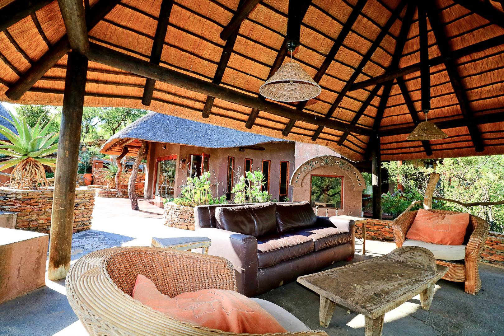 The spacious lounge and dining areas open onto three wooden decks, complemented by two thatched lapas—one with a gas braai and a large entertainment deck. A separate open-air braai area surrounds a raised firepit, perfect for relaxed gatherings. A stone path leads from the house down to a stream in the ravine below, complete with private rock pools.