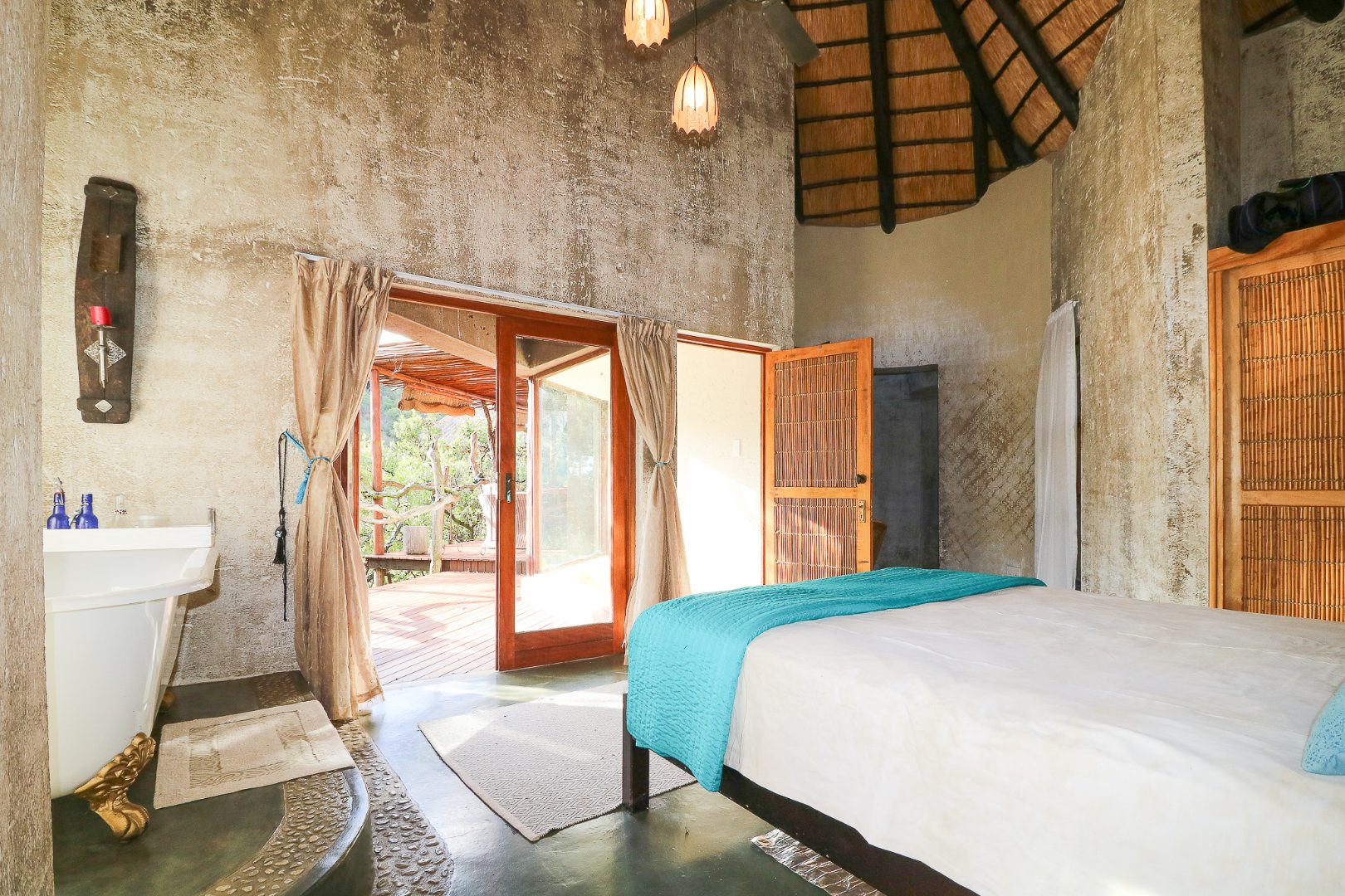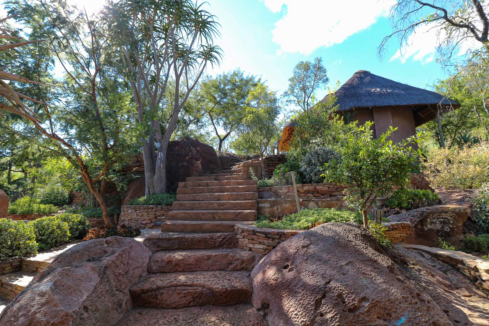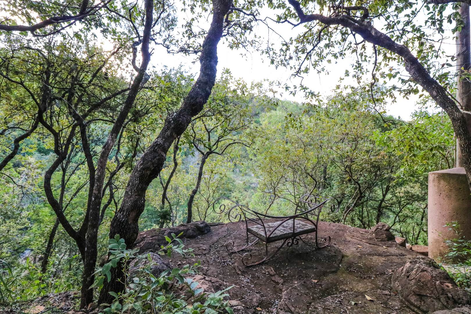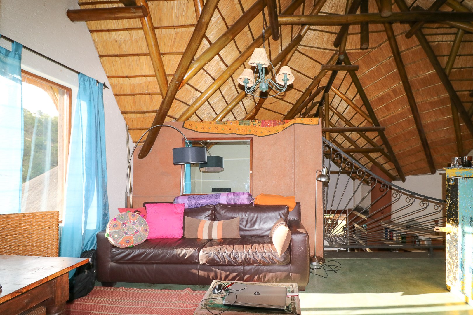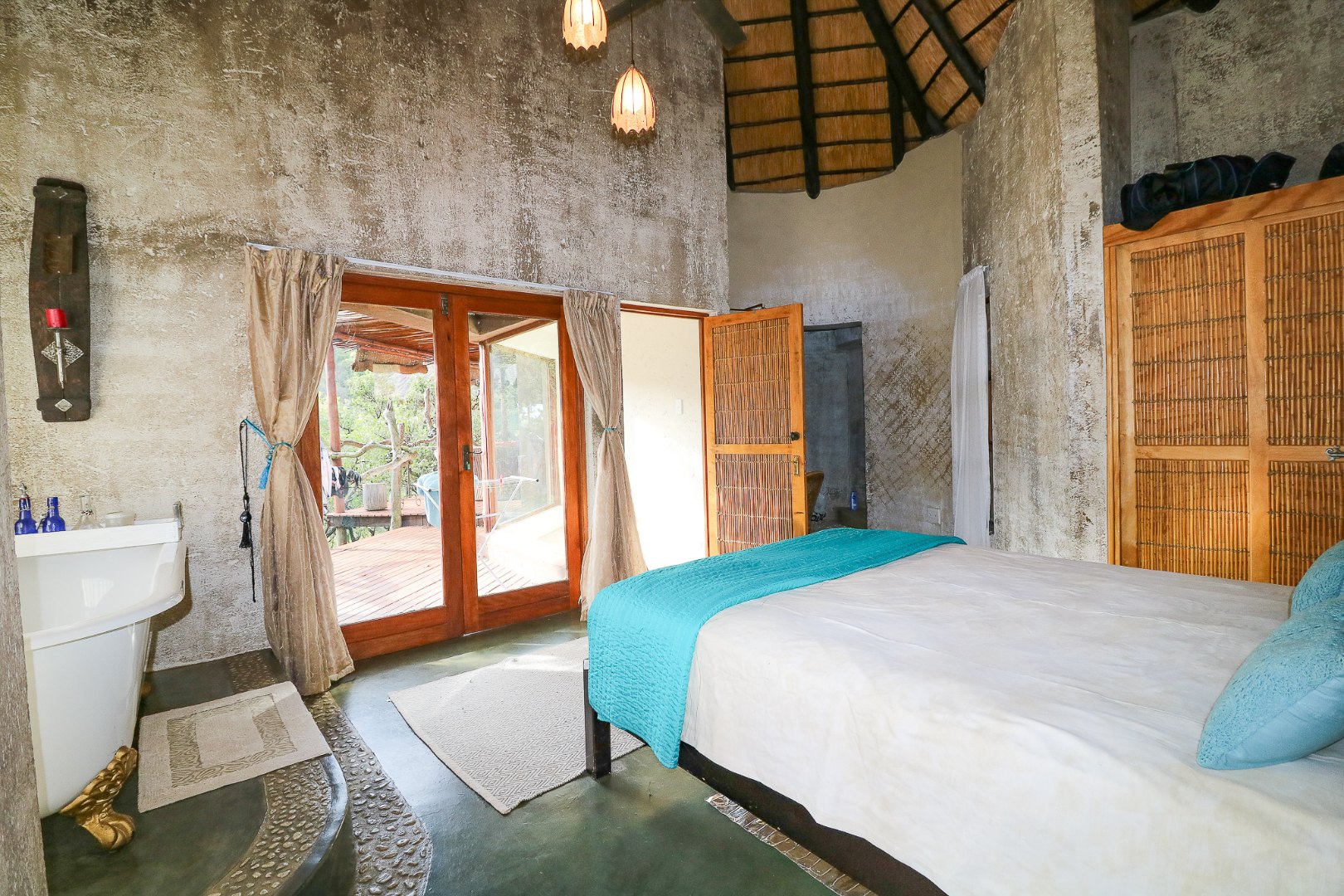 The spacious lounge and dining areas open onto three wooden decks, complemented by two thatched lapas—one with a gas braai and a large entertainment deck. A separate open-air braai area surrounds a raised firepit, perfect for relaxed gatherings. A stone path leads from the house down to a stream in the ravine below, complete with private rock pools.