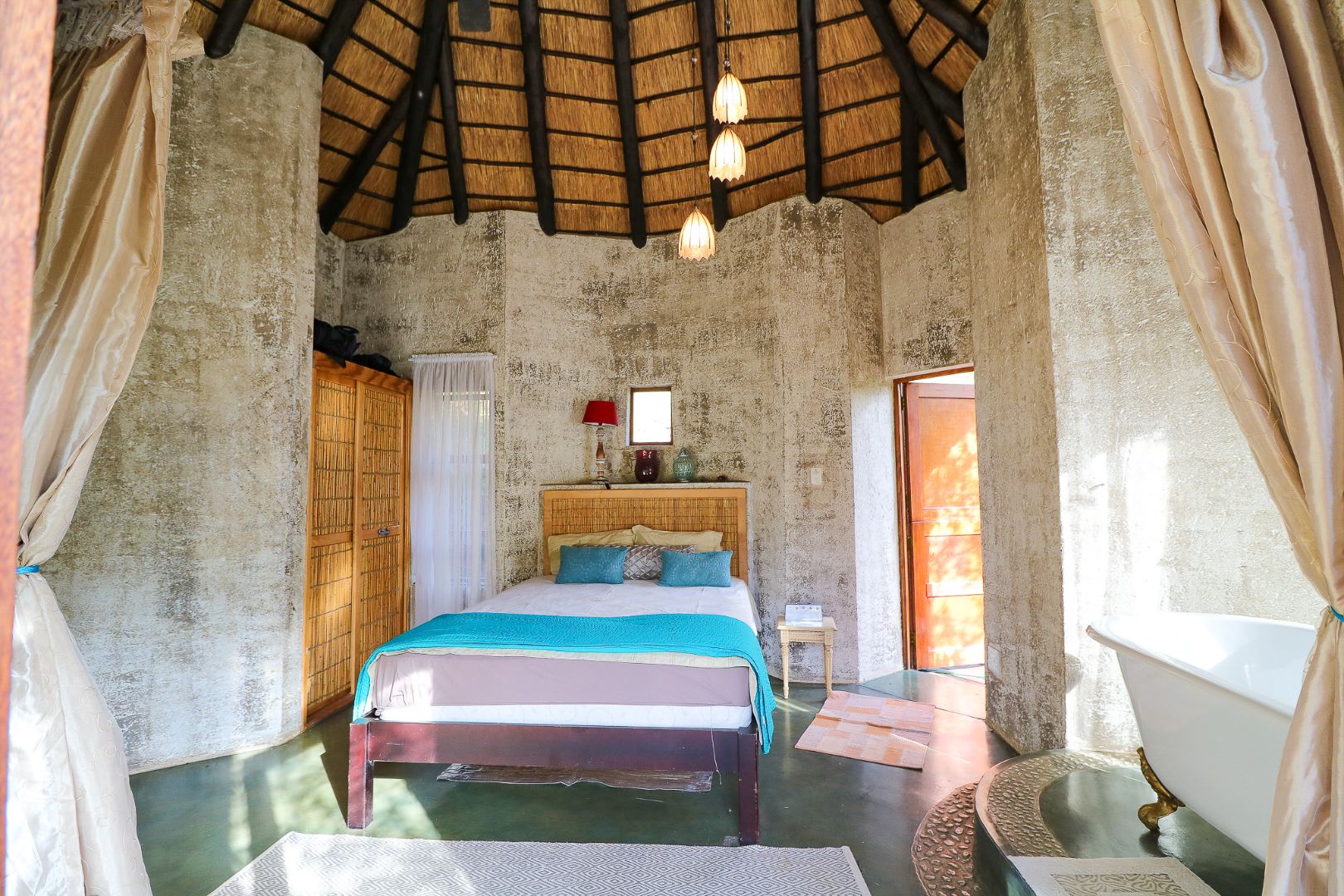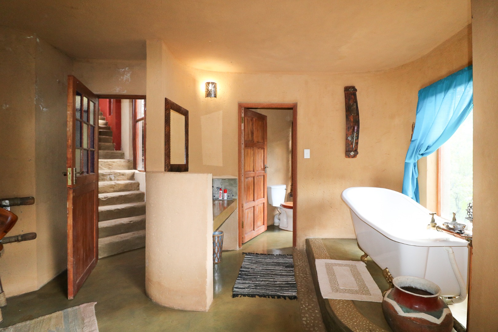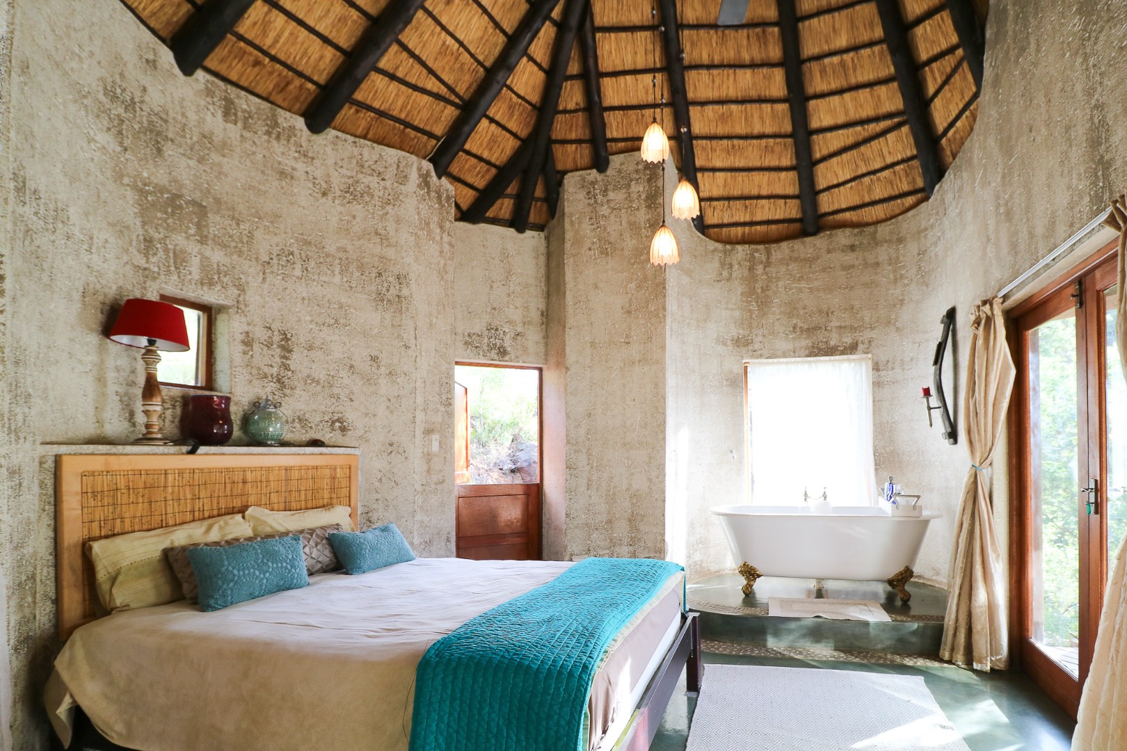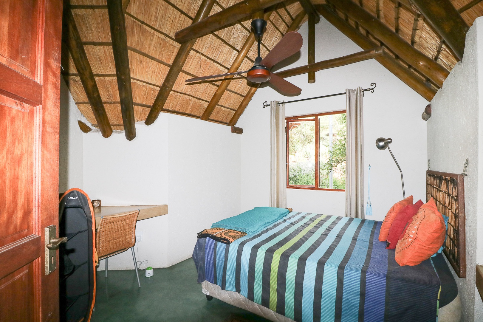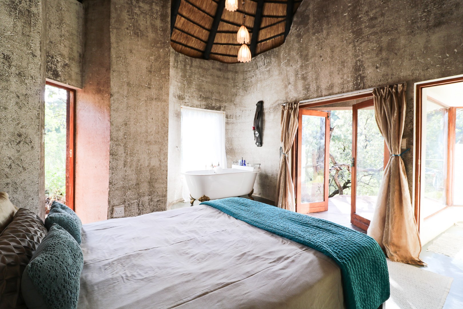 The spacious lounge and dining areas open onto three wooden decks, complemented by two thatched lapas—one with a gas braai and a large entertainment deck. A separate open-air braai area surrounds a raised firepit, perfect for relaxed gatherings. A stone path leads from the house down to a stream in the ravine below, complete with private rock pools.