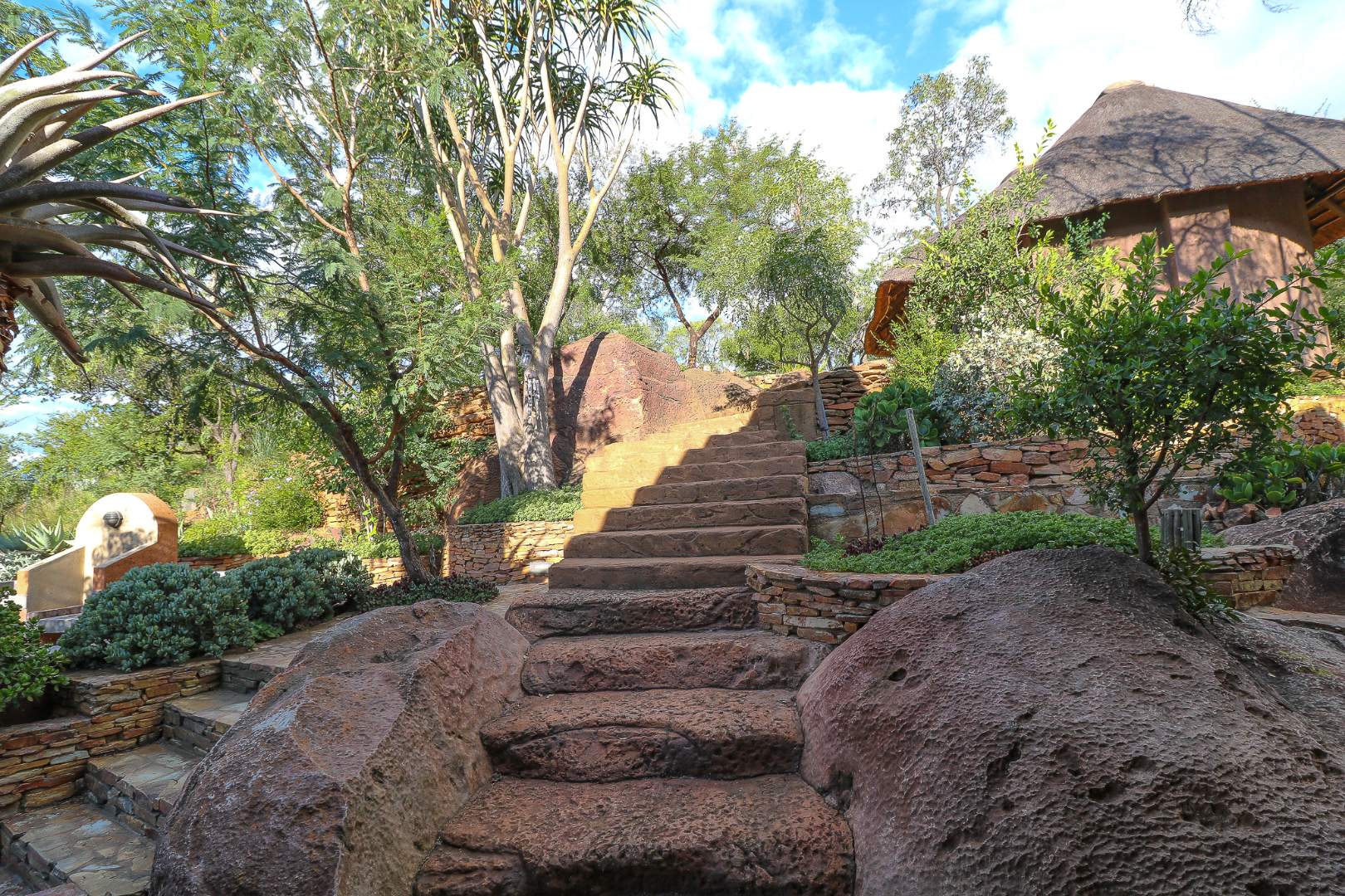Perched on the edge of a ravine, the house spans three levels with open-plan living areas that seamlessly blend indoor and outdoor spaces. The landscaped garden, featuring endemic trees and shrubs, is arranged across unique stone terraces—an exceptional feature in this environment.