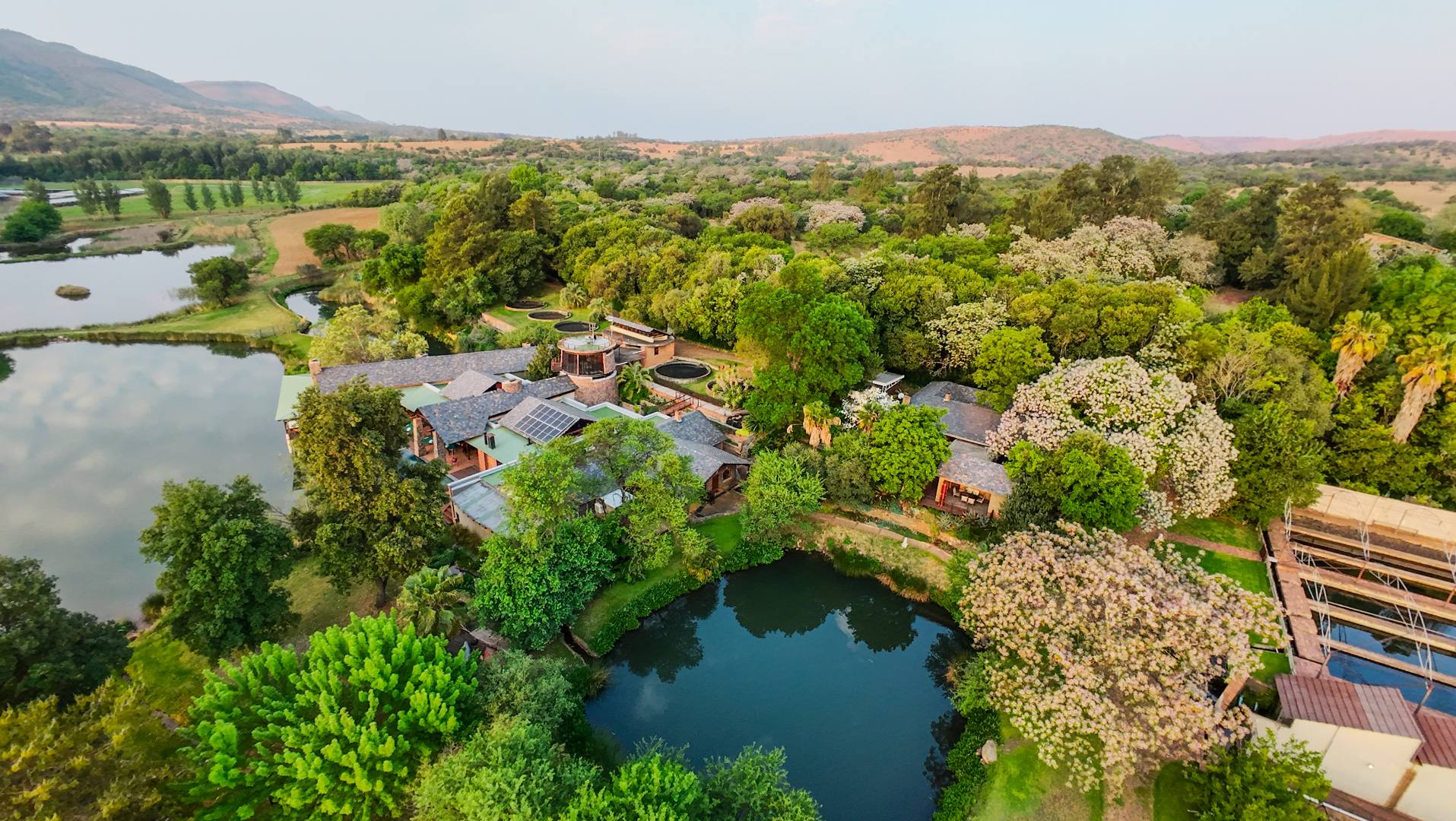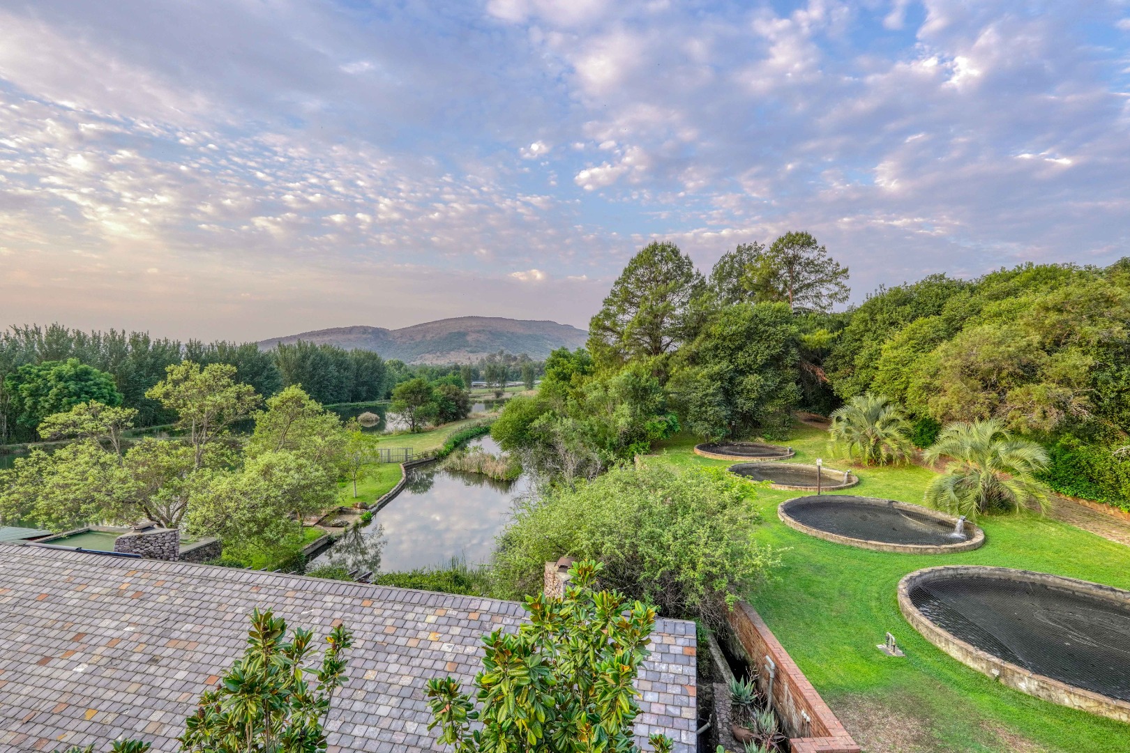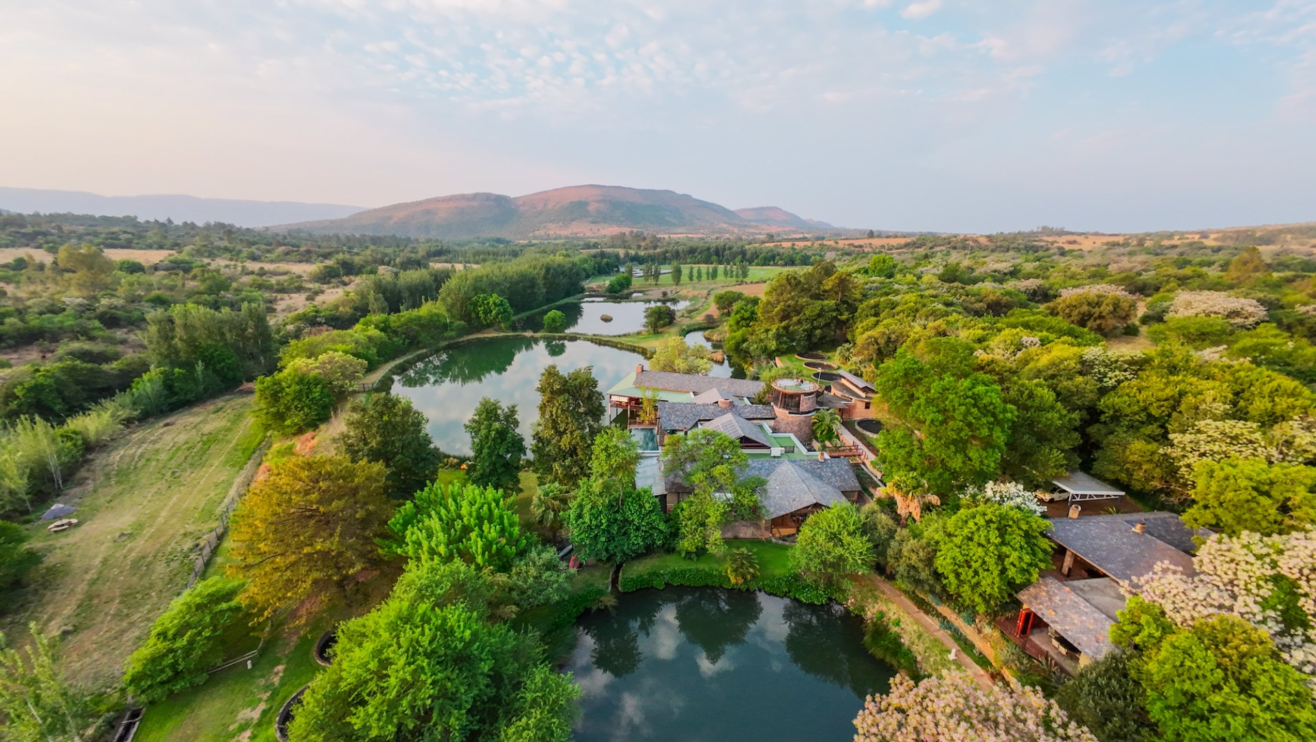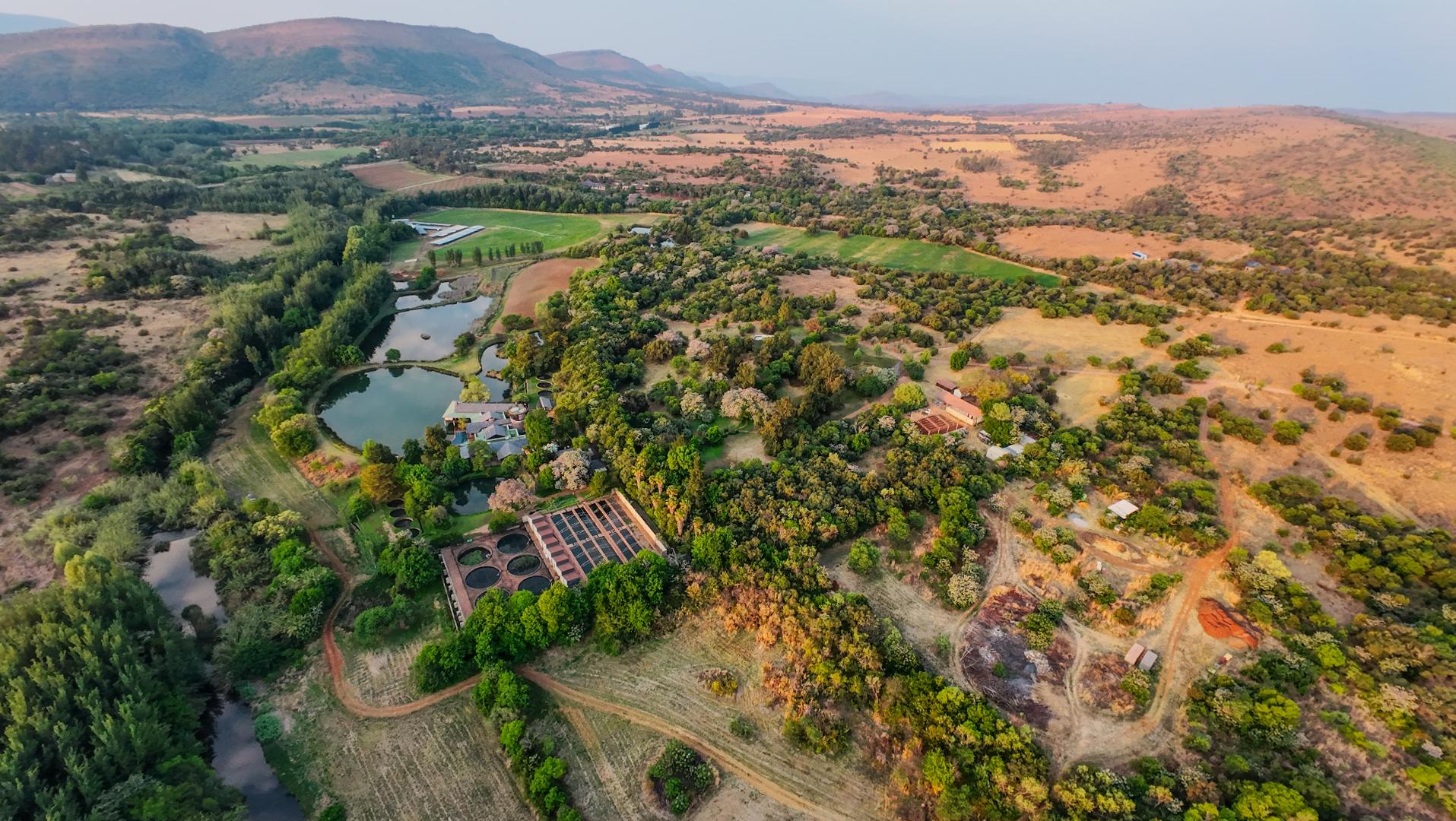 Set among flowing water channels, lush greenery with bountiful bird and animal life, and scenic trout dams, the property features four dwellings—centred around a remarkable mansion designed as a boutique hotel, giving it a refined, luxurious presence. The farm is at the foot of the Witwatersberg with a view of the Magaliesberg, within the internationally renowned Cradle of Humankind, adding historical depth and biodiversity significance to its natural beauty. This estate delivers a once-in-a-lifetime combination of natural beauty, heritage significance, luxury living, and business potential.