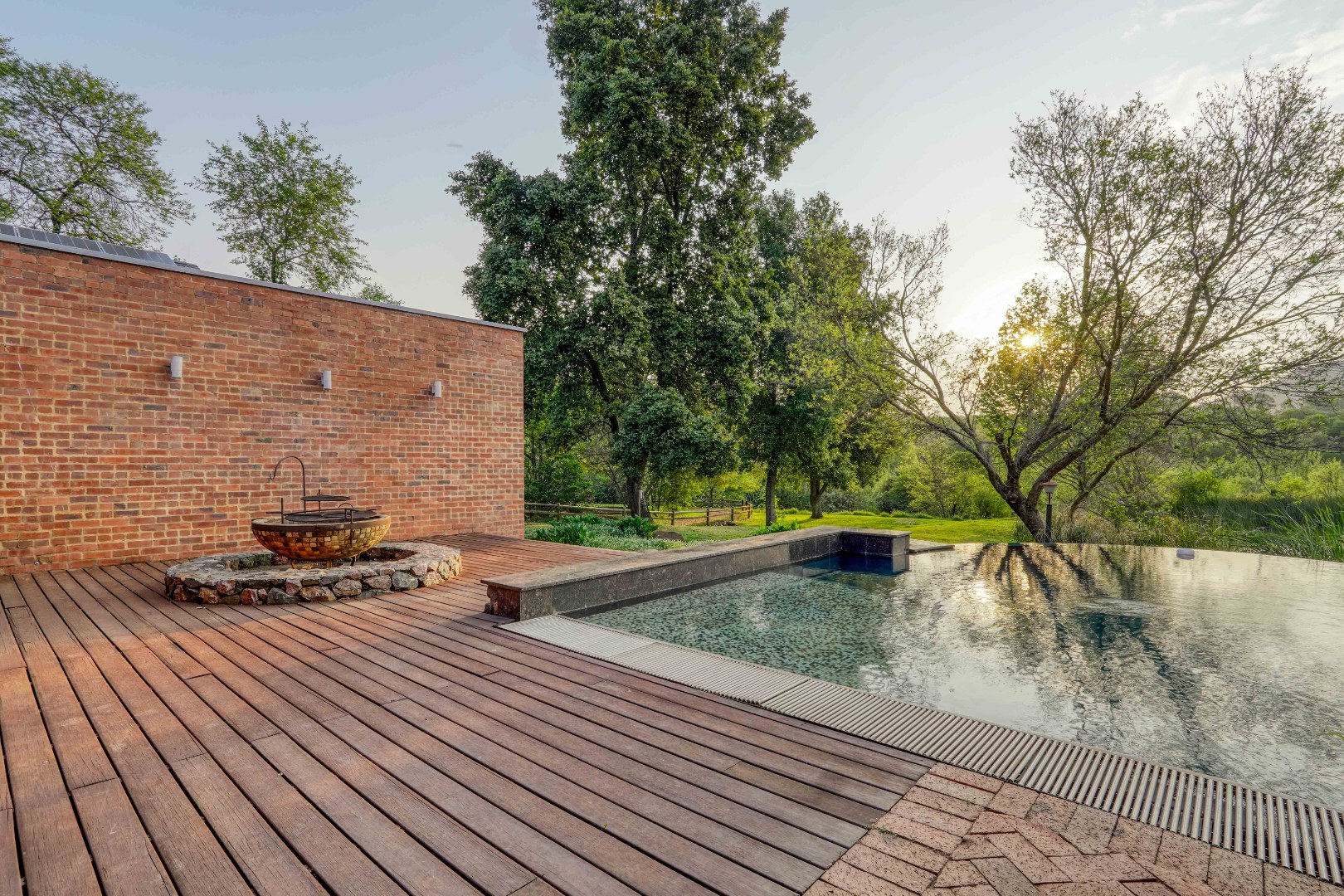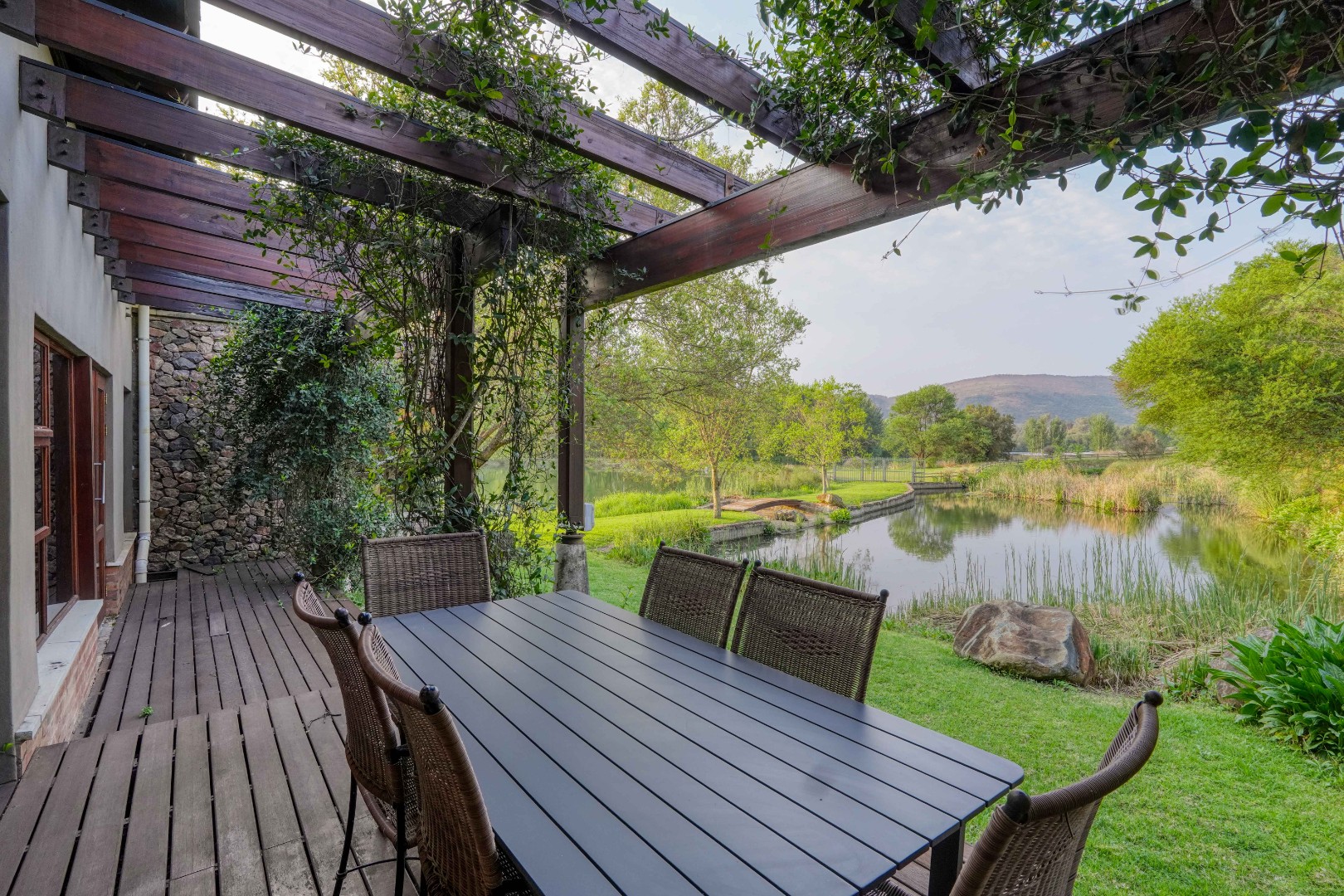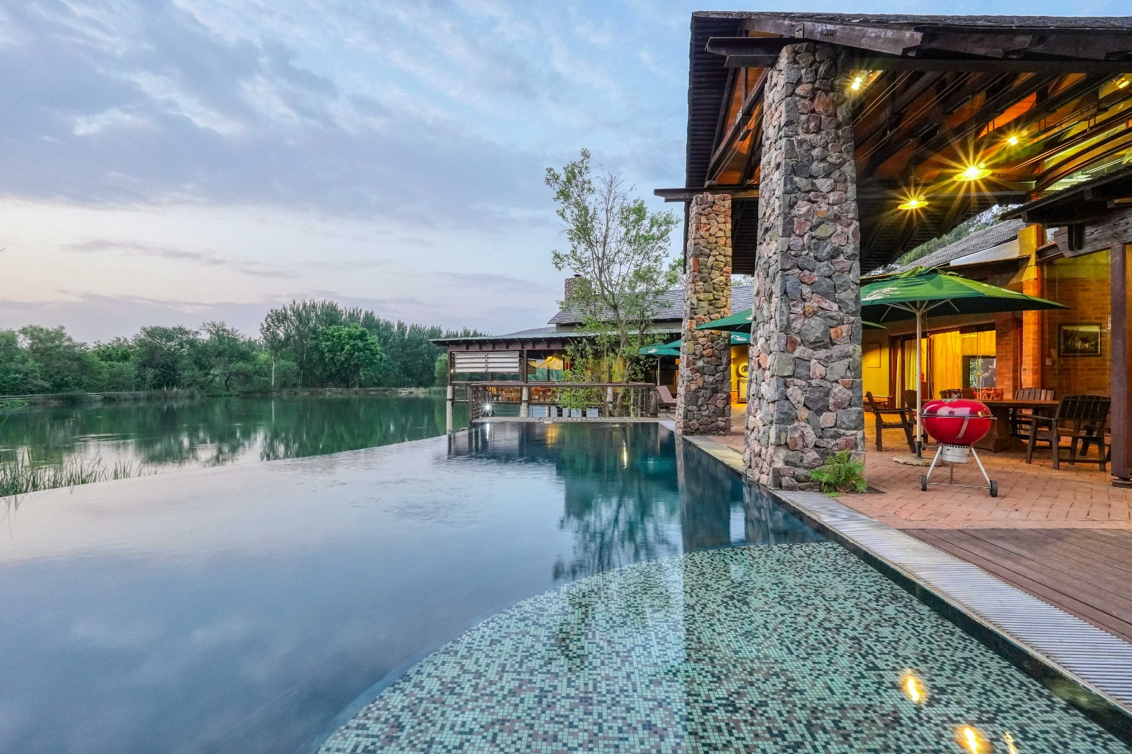 Outside, a large deck leads to a swimming pool and built-in braai area, positioned to capture tranquil water views.