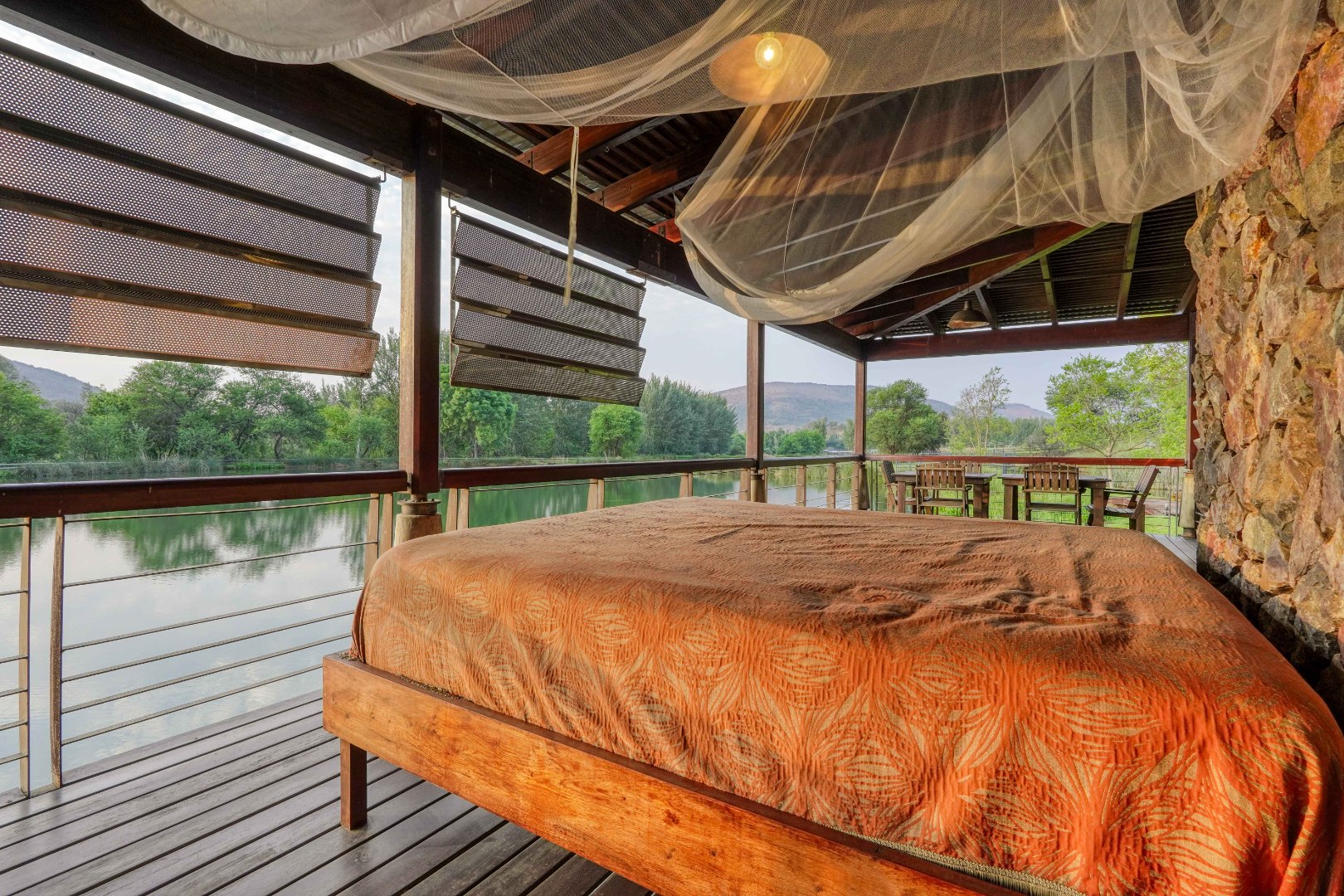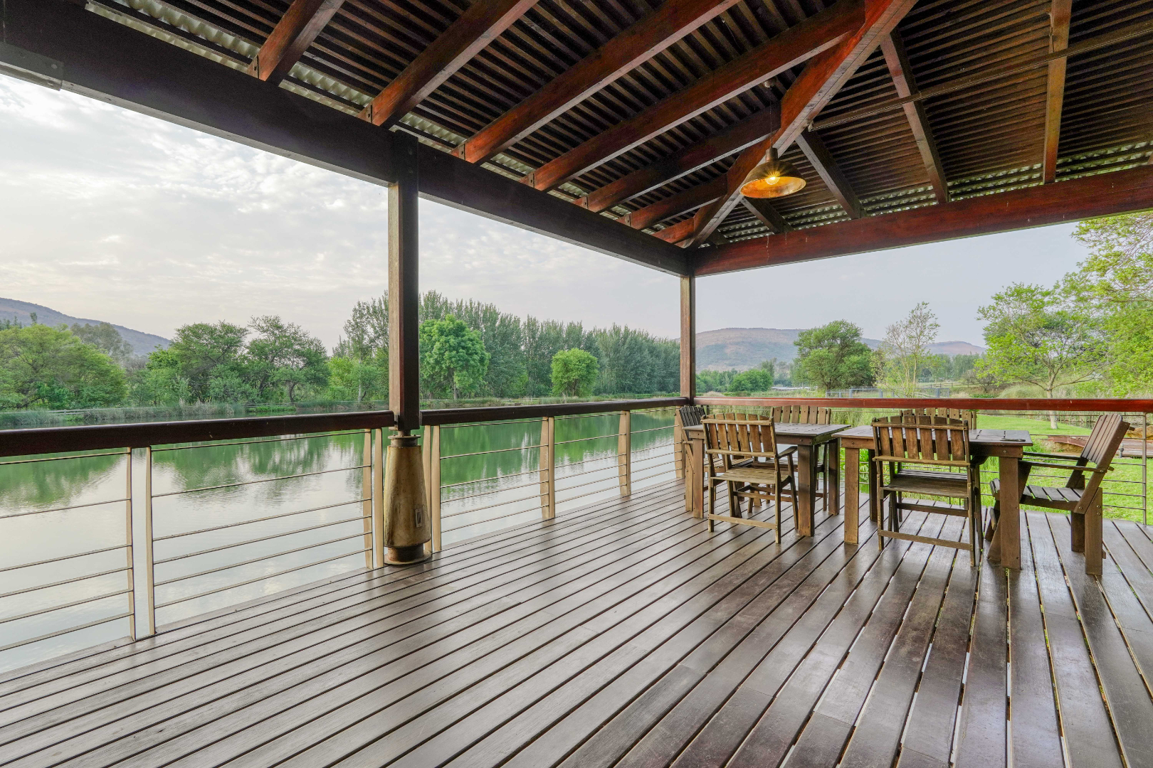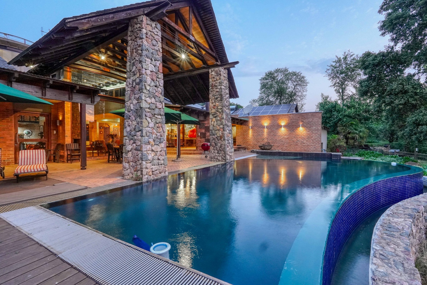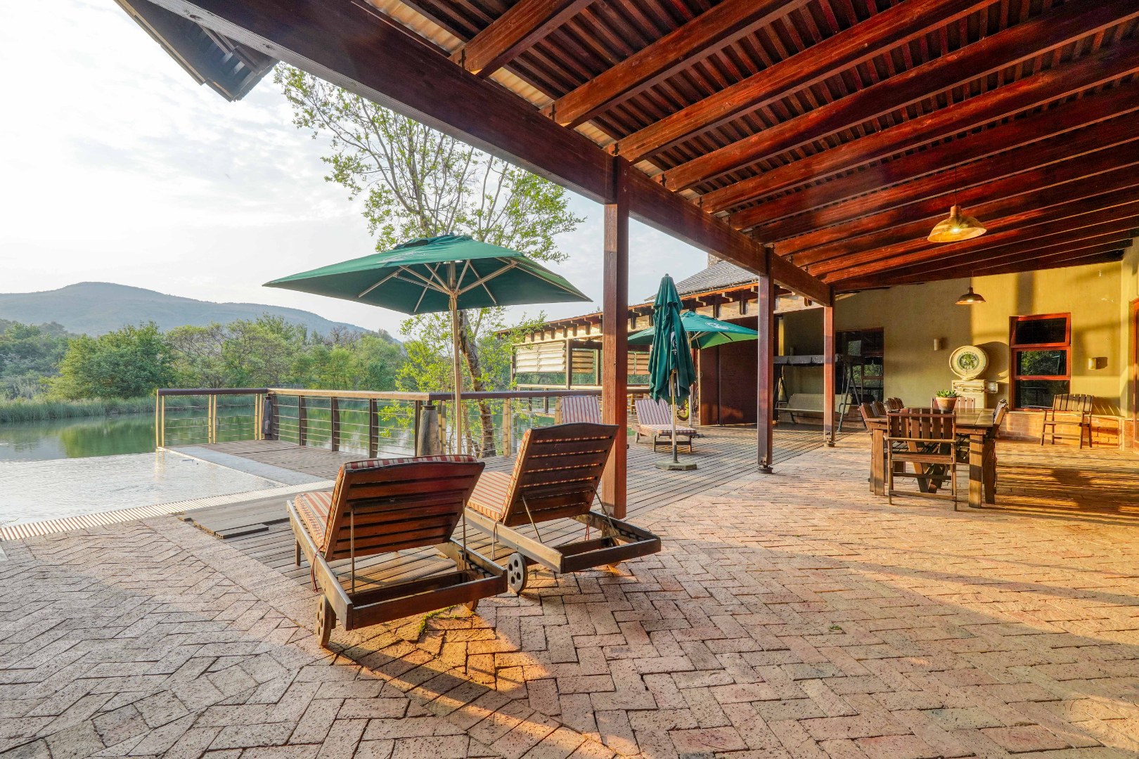 Outside, a large deck leads to a swimming pool and built-in braai area, positioned to capture tranquil water views.