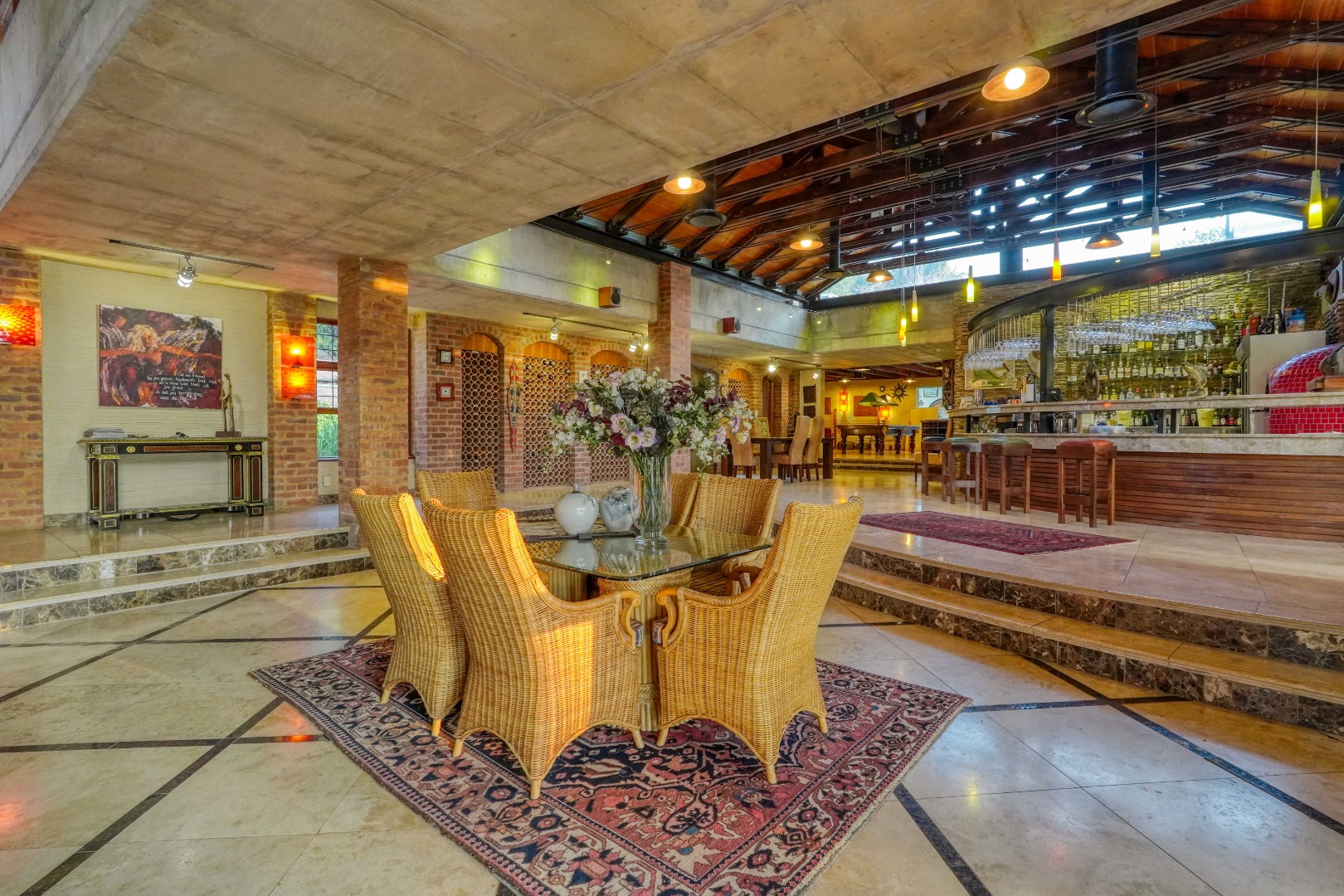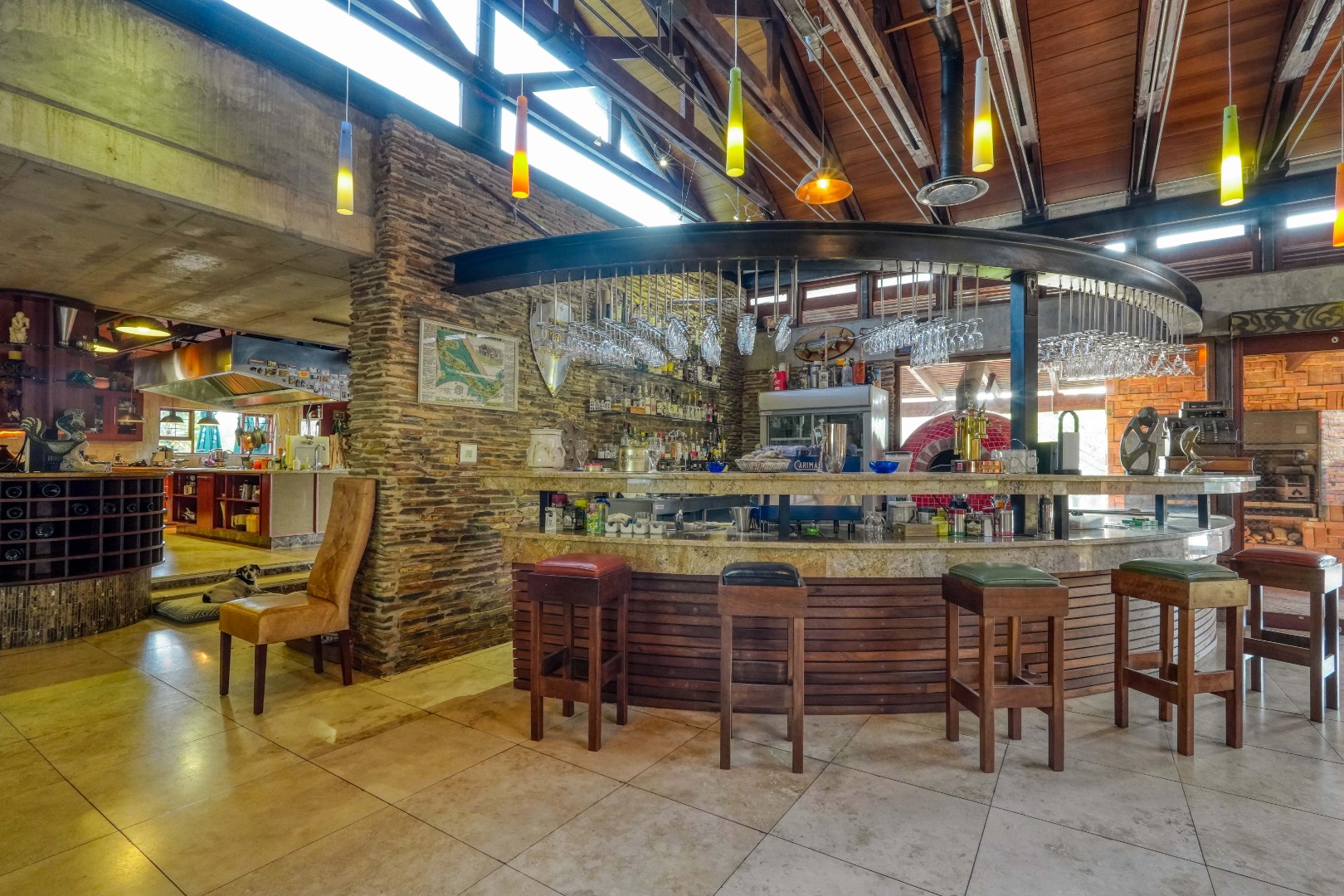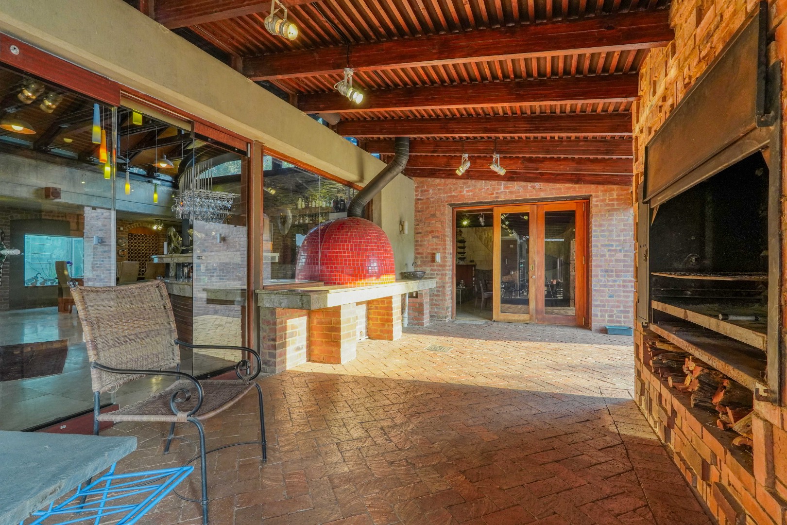The dining area features a built-in bar and pizza oven