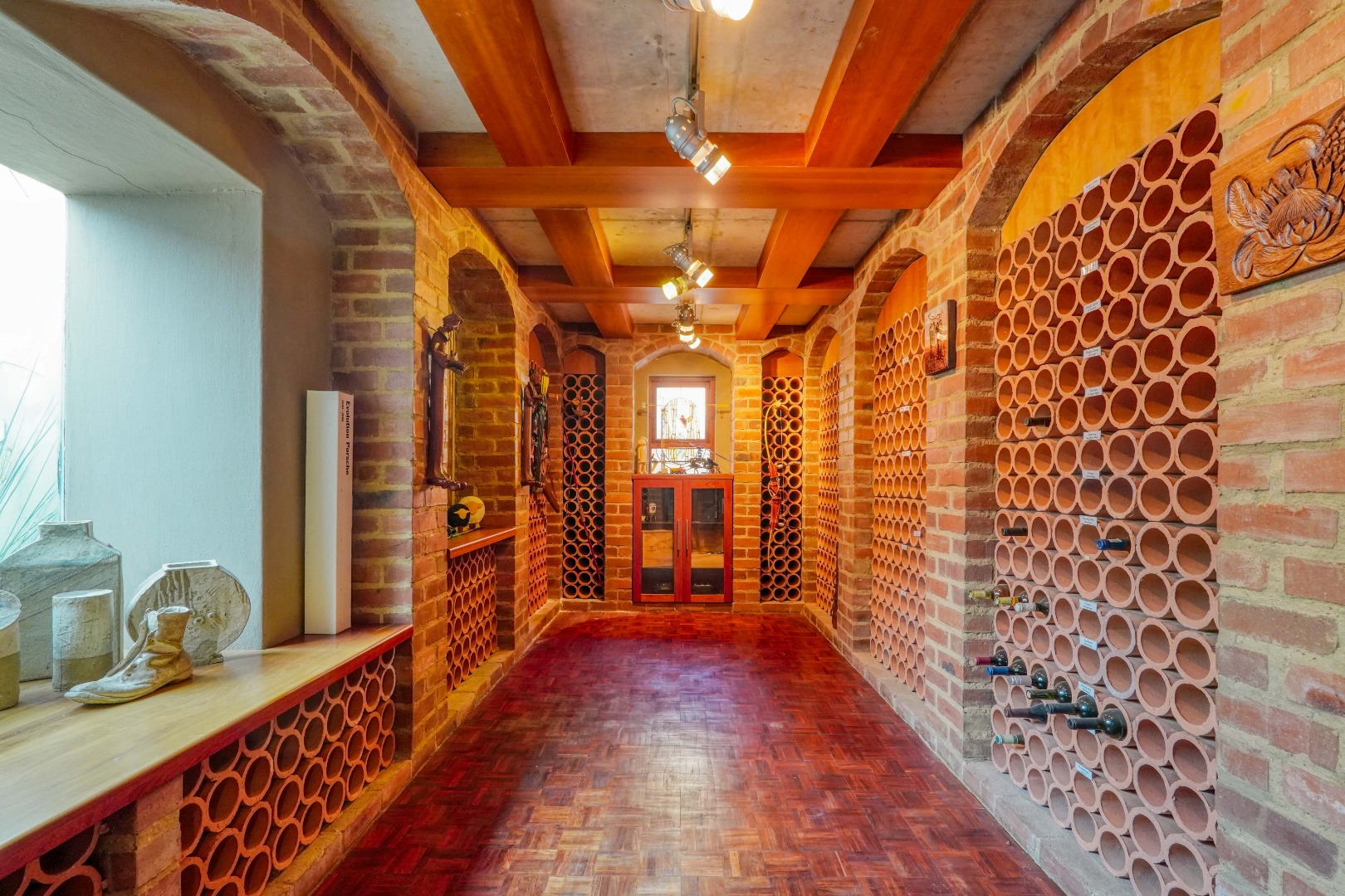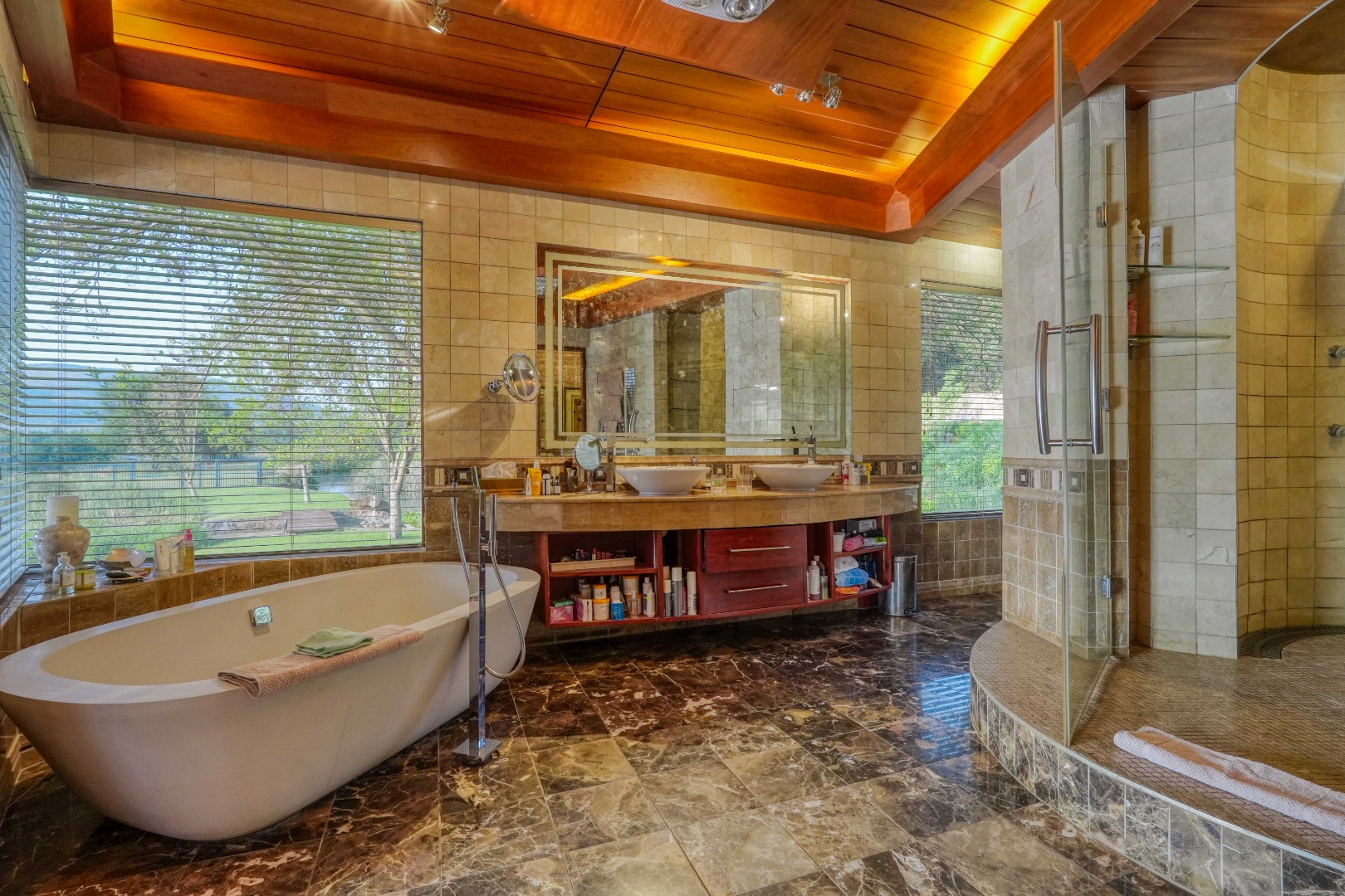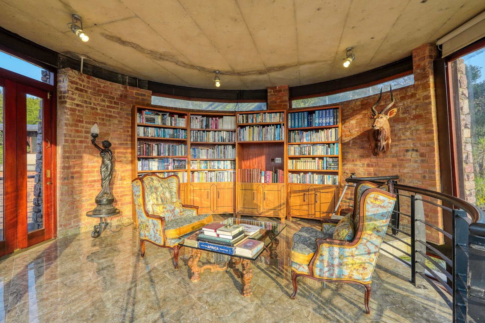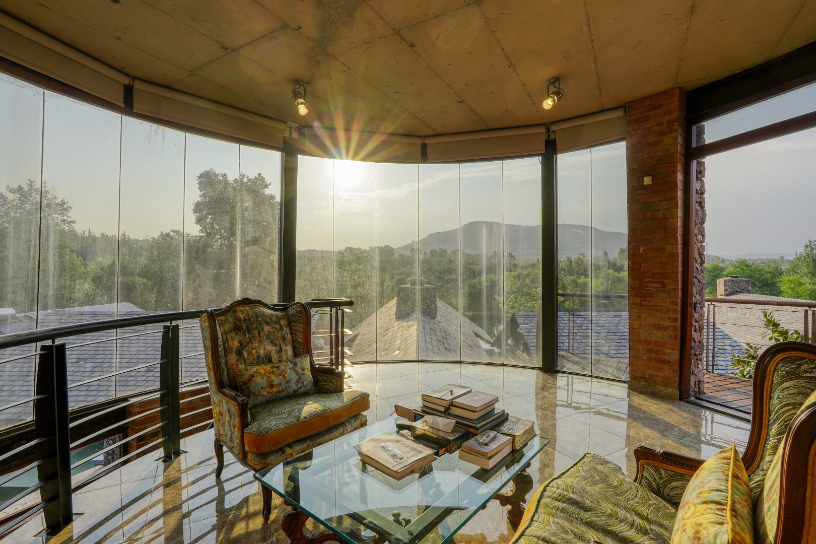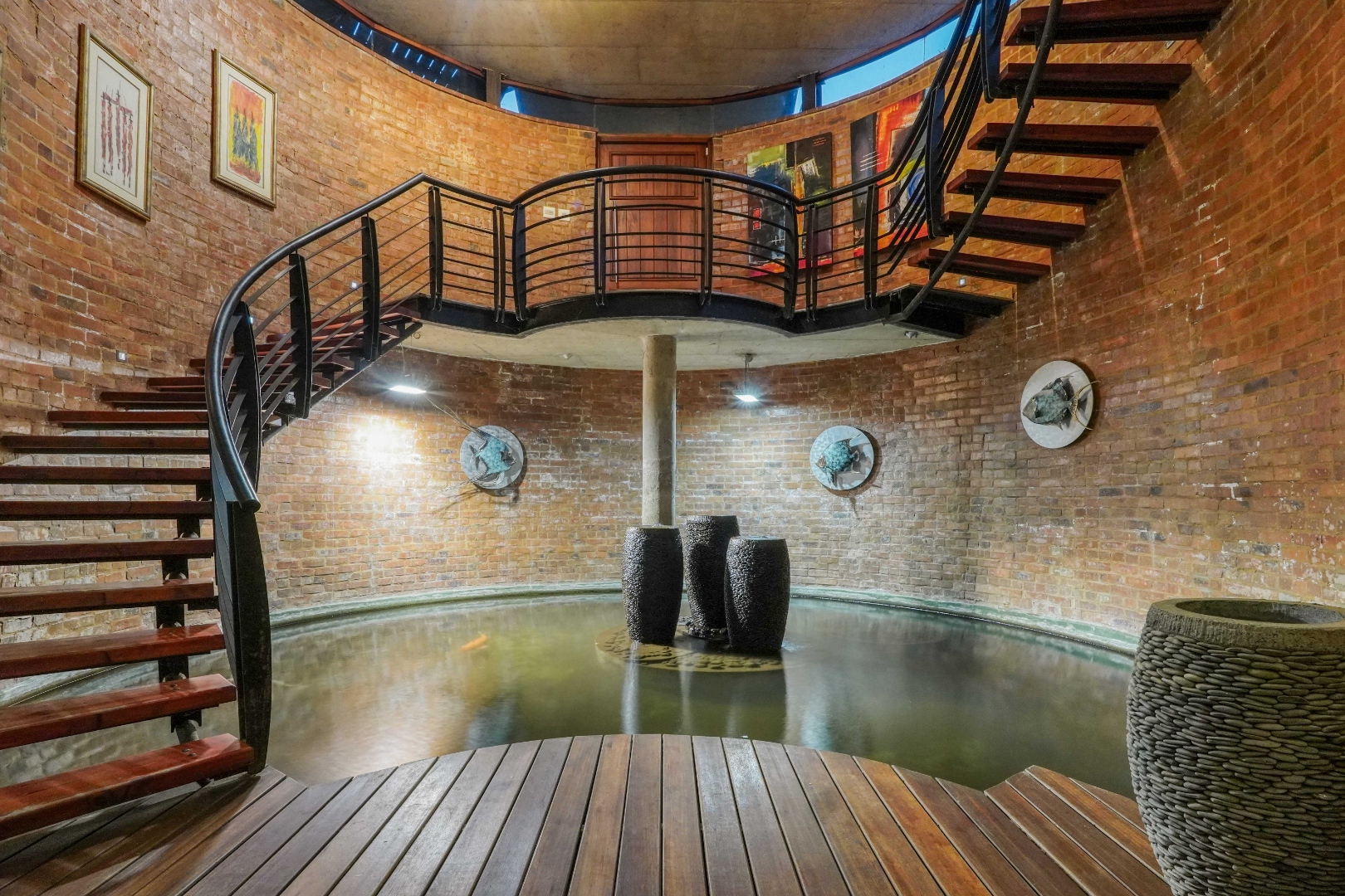 A Mansion designed for Boutique Luxury - The main home is designed as a boutique hotel, reflecting in its generous open spaces, premium finishes, and dramatic architectural features. The mansion’s entrance is uniquely striking: stepping inside places you midway up a sweeping staircase. Descending leads into a grand entrance hall centred around a calming koi pond with a water feature. Ascending takes you to the tower lookout— used as a serene library—with panoramic views of still waters, the surrounding mountain ranges, and the estate itself. The tower roof offers an elevated 360° vantage point.