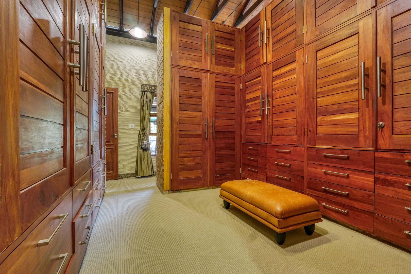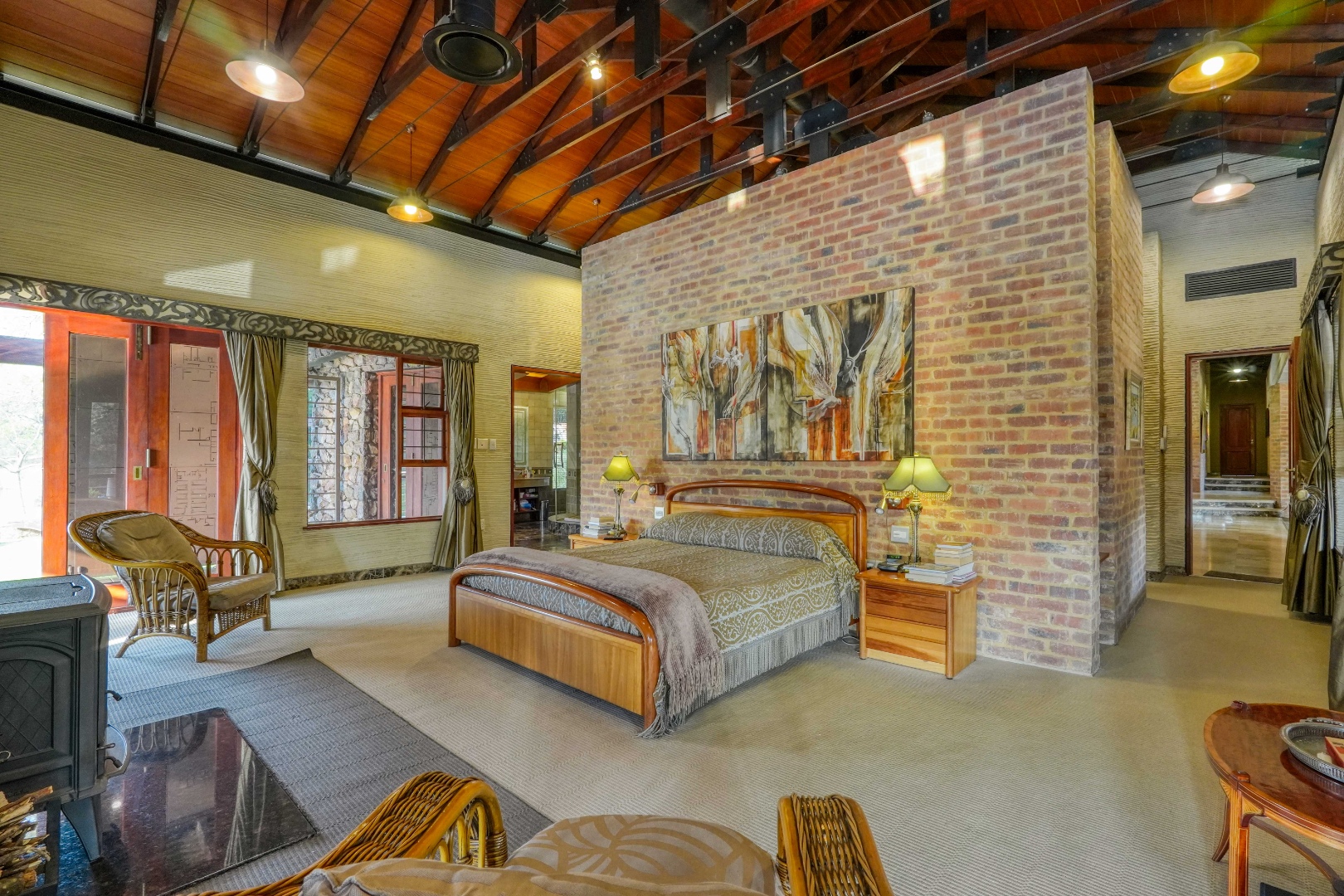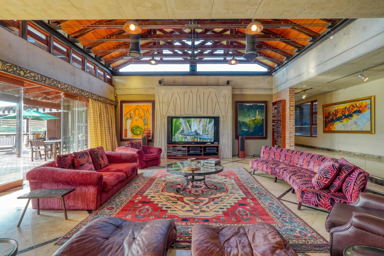 Inside, the main living area exudes warmth and grandeur: