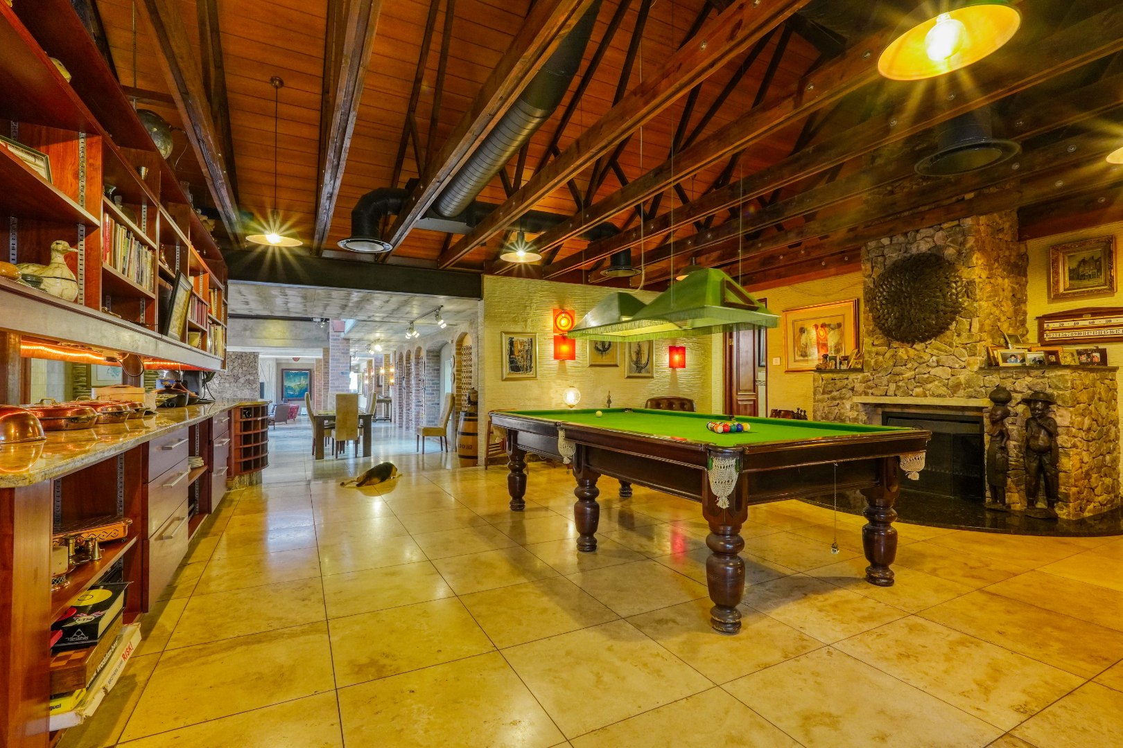 A massive central fireplace anchors the lounge and dining room