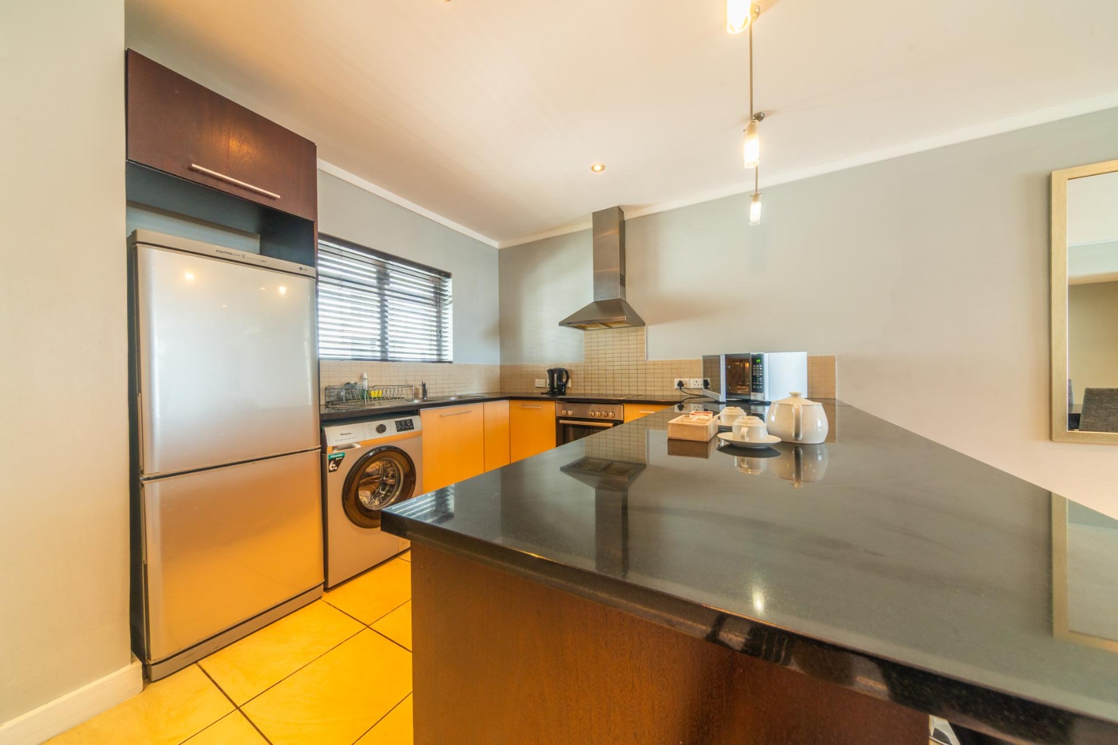 The contemporary kitchen is a culinary delight, featuring sleek dark countertops, ample cabinetry, and a suite of integrated appliances, complemented by a convenient breakfast bar for casual dining.