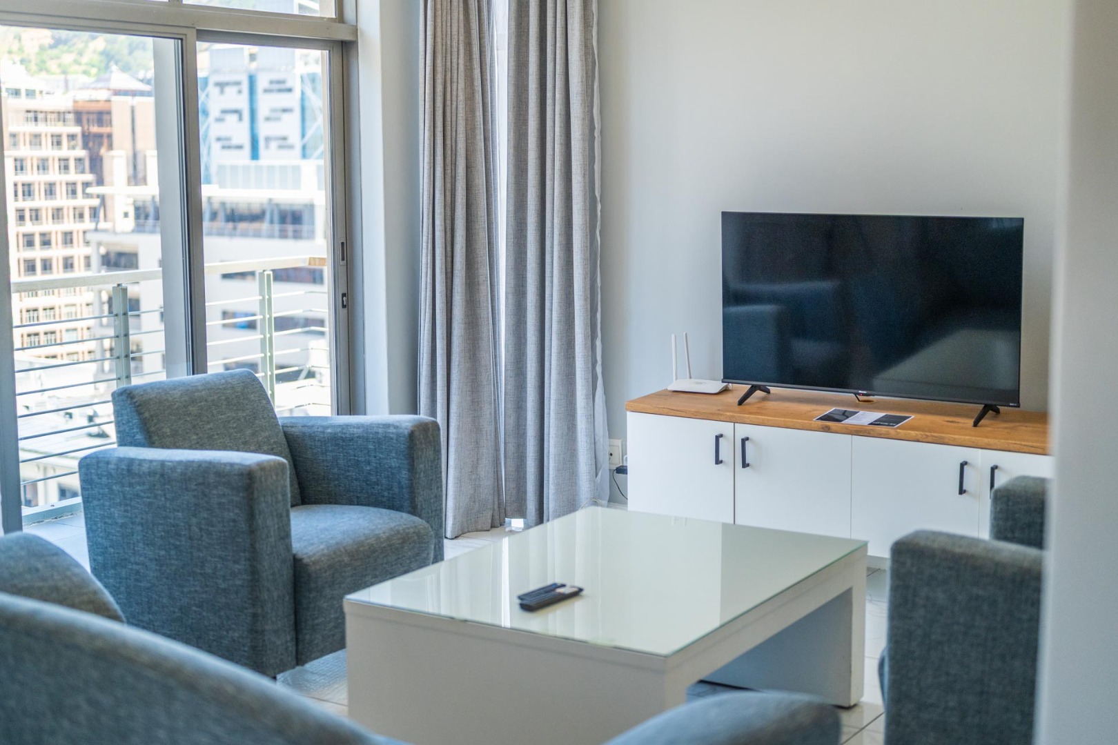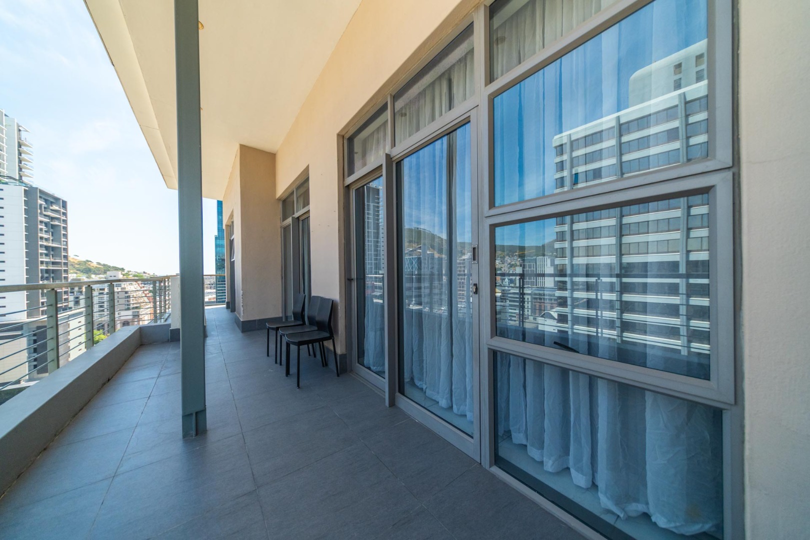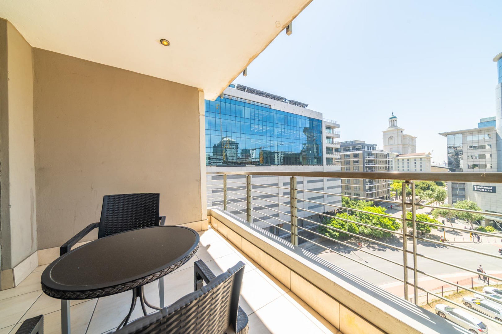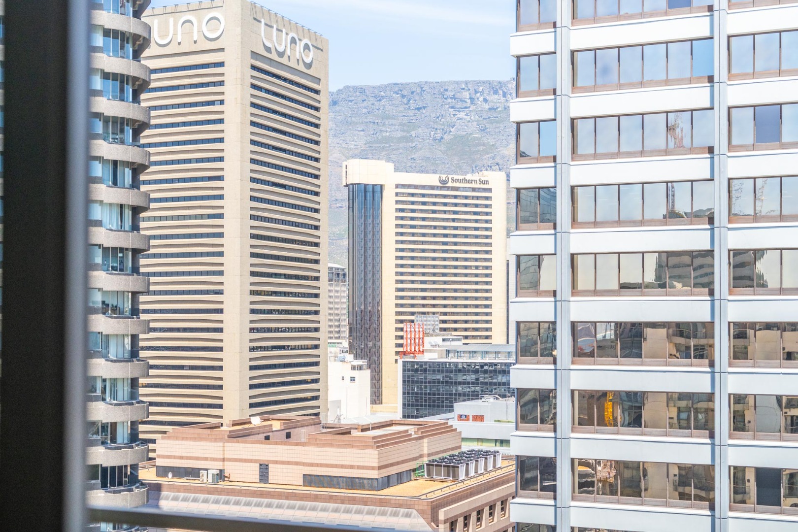 A private balcony extends the living space outdoors, framing panoramic city views with Table Mountain as a dramatic backdrop — perfect for morning coffees or evening sundowners.