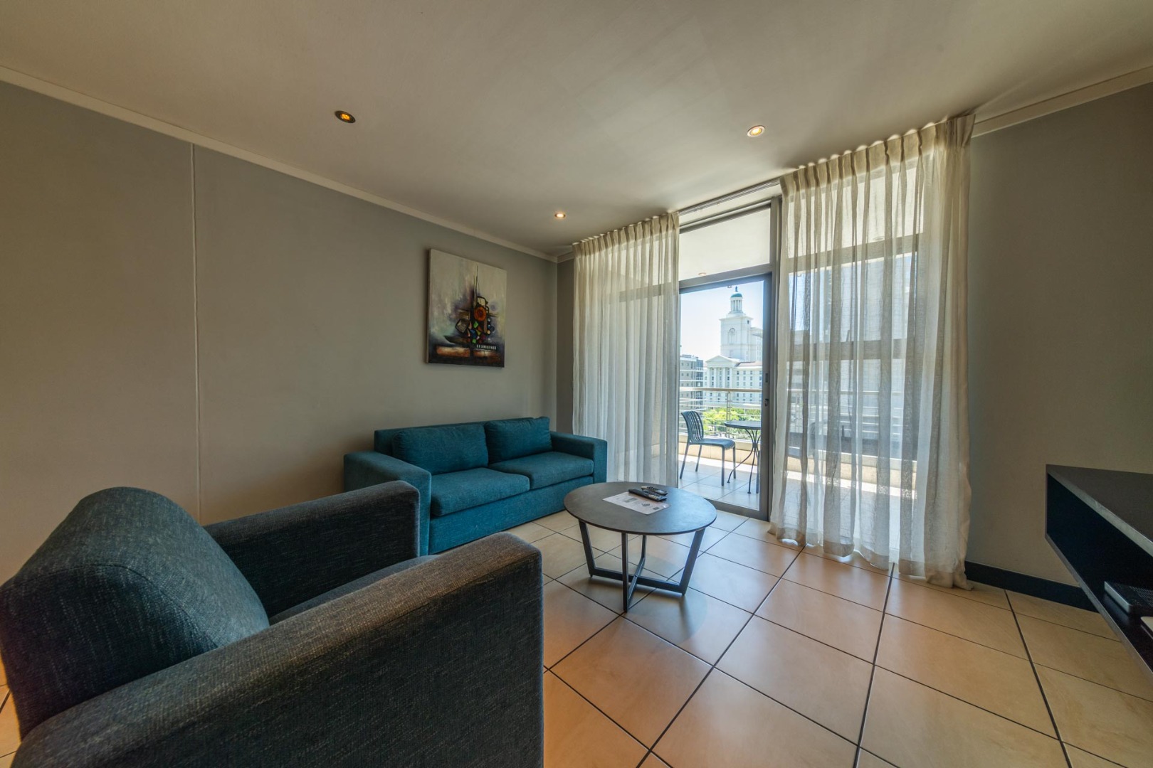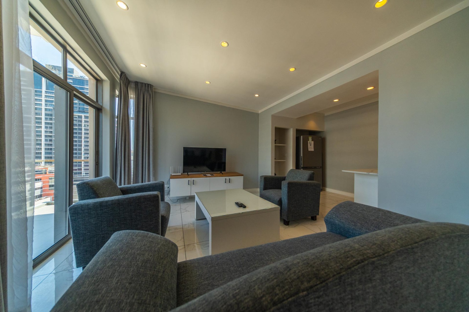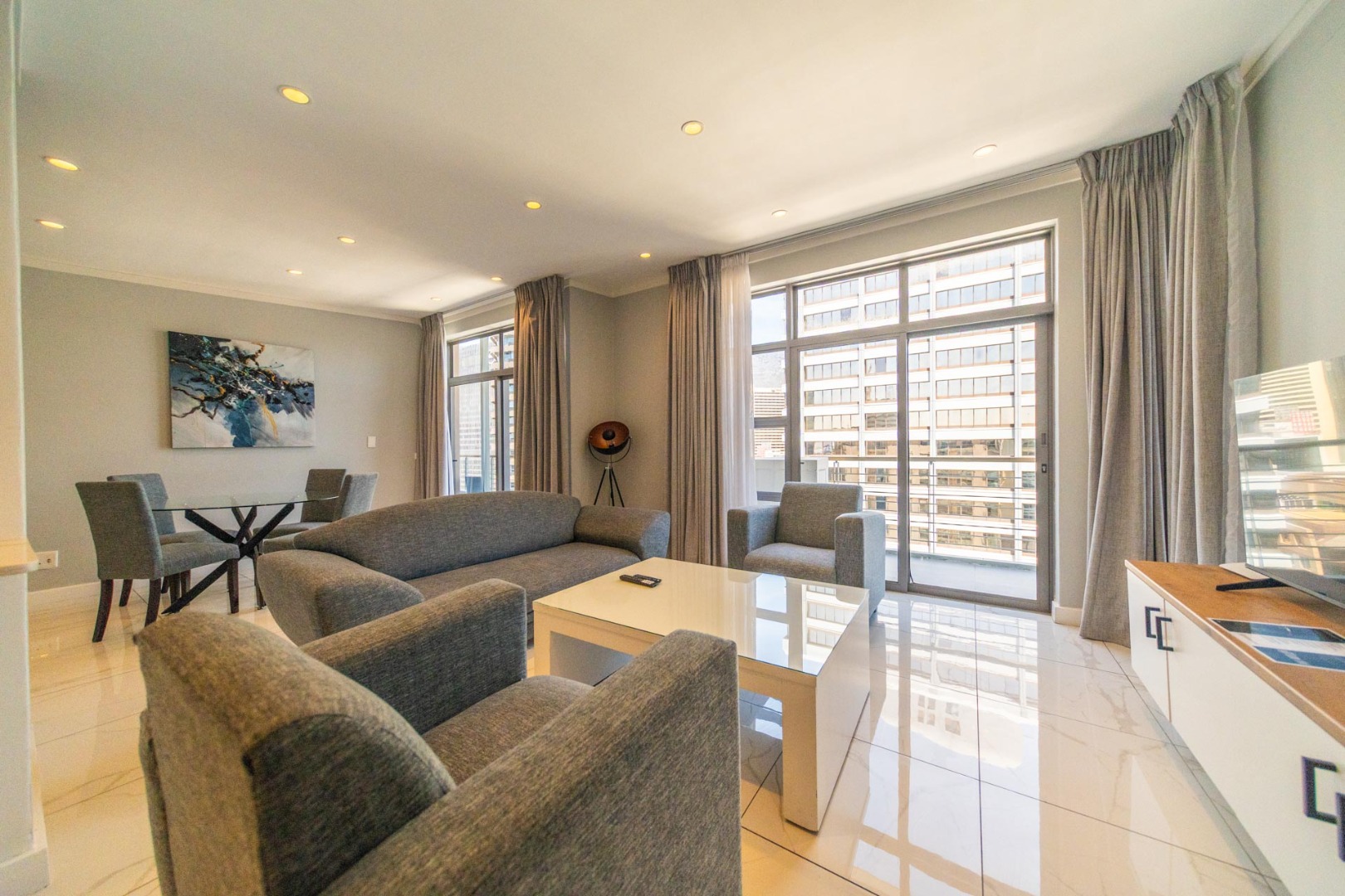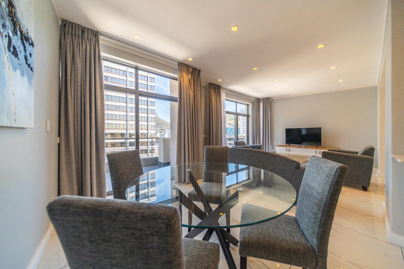 A private balcony extends the living space outdoors, framing panoramic city views with Table Mountain as a dramatic backdrop — perfect for morning coffees or evening sundowners.