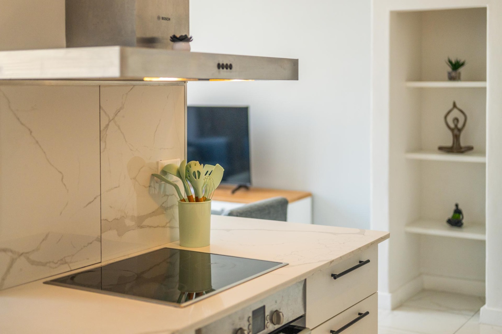 Inside, a seamless open-plan layout connects the refined lounge, stylish dining area, and state-of-the-art kitchen. Flooded with natural light, the interiors boast premium finishes, integrated air-conditioning, and a sophisticated neutral palette that enhances space and comfort. The contemporary kitchen is a chef’s delight — fitted with sleek dark countertops, integrated appliances, and a functional breakfast bar ideal for relaxed dining.
