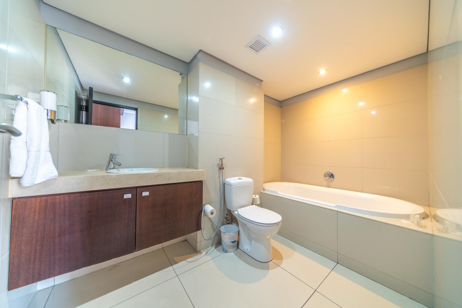 Both bedrooms are generously sized with ample built-in cupboards. The master suite opens directly onto the balcony and includes a full ensuite bathroom with bathtub and walk-in shower. The second bedroom is equally well-appointed, paired with a modern second bathroom featuring quality finishes.