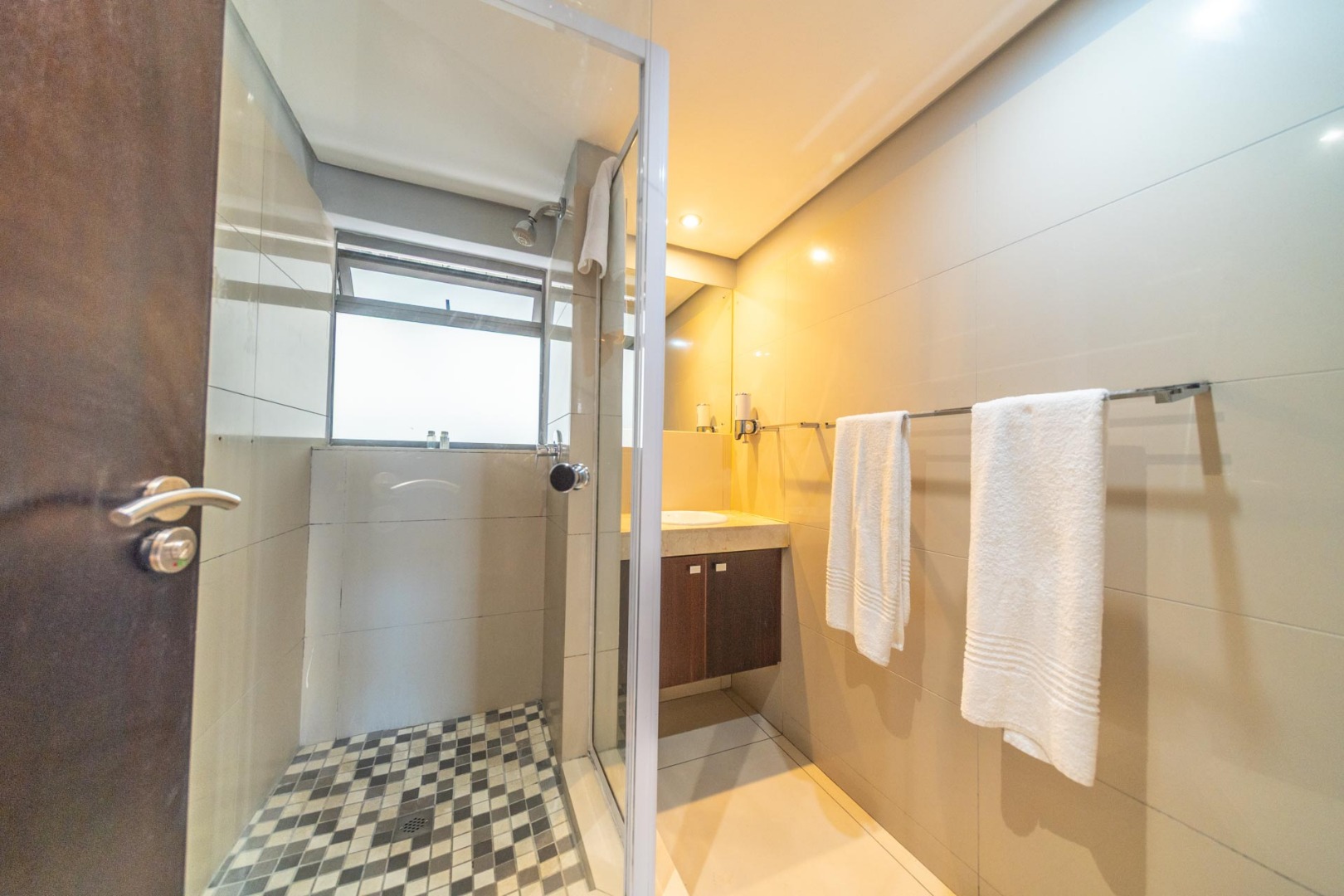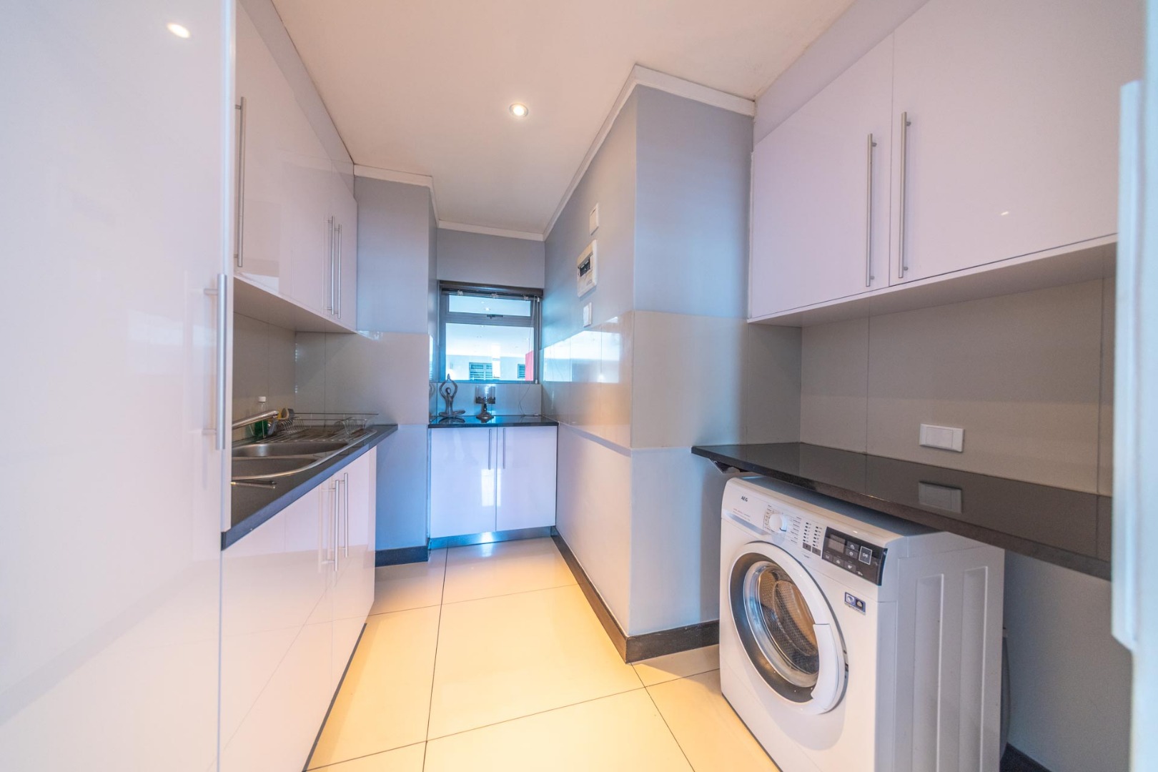 A sleek kitchen anchors the living space, complemented by a large separate scullery/laundry room — a rare luxury in city apartments. Stylish tiling, contemporary lighting, and tasteful decor complete the home’s inviting atmosphere.
