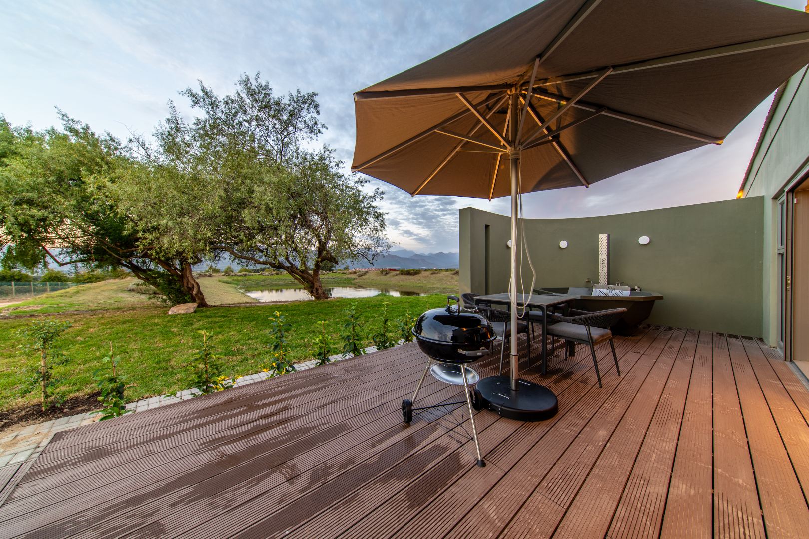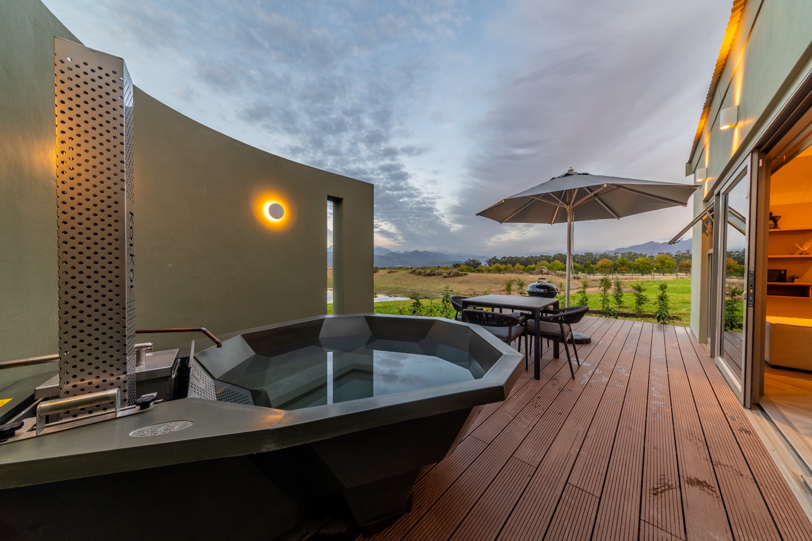 • Outdoor living: Private wooden deck with Kol Kol wood-fired hot tub overlooking a tranquil lake.