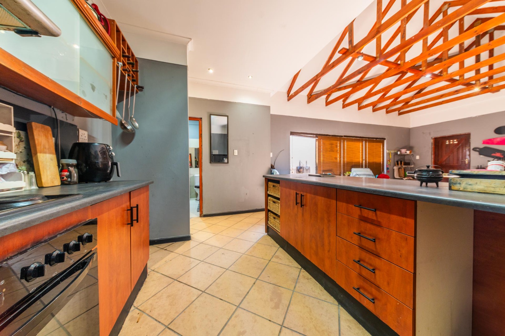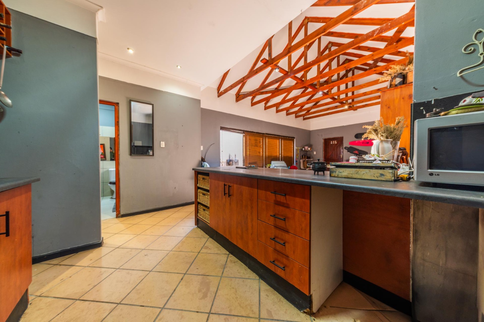 Step inside to an open-plan living and kitchen area, characterized by striking exposed wooden ceiling beams that add architectural character and a sense of spaciousness. Durable tiled flooring extends throughout the main living areas, ensuring practicality and easy maintenance. The kitchen is well-appointed with a central island, extensive cabinetry, and a U-shaped layout, offering generous counter space and storage solutions.