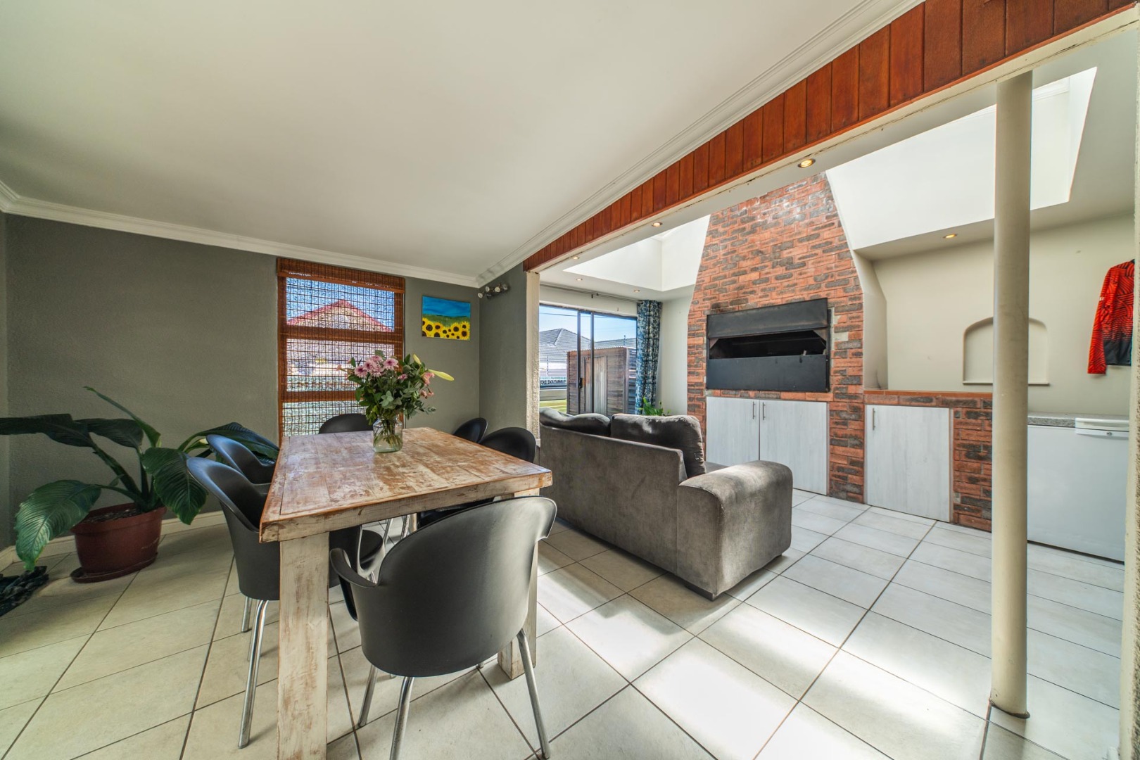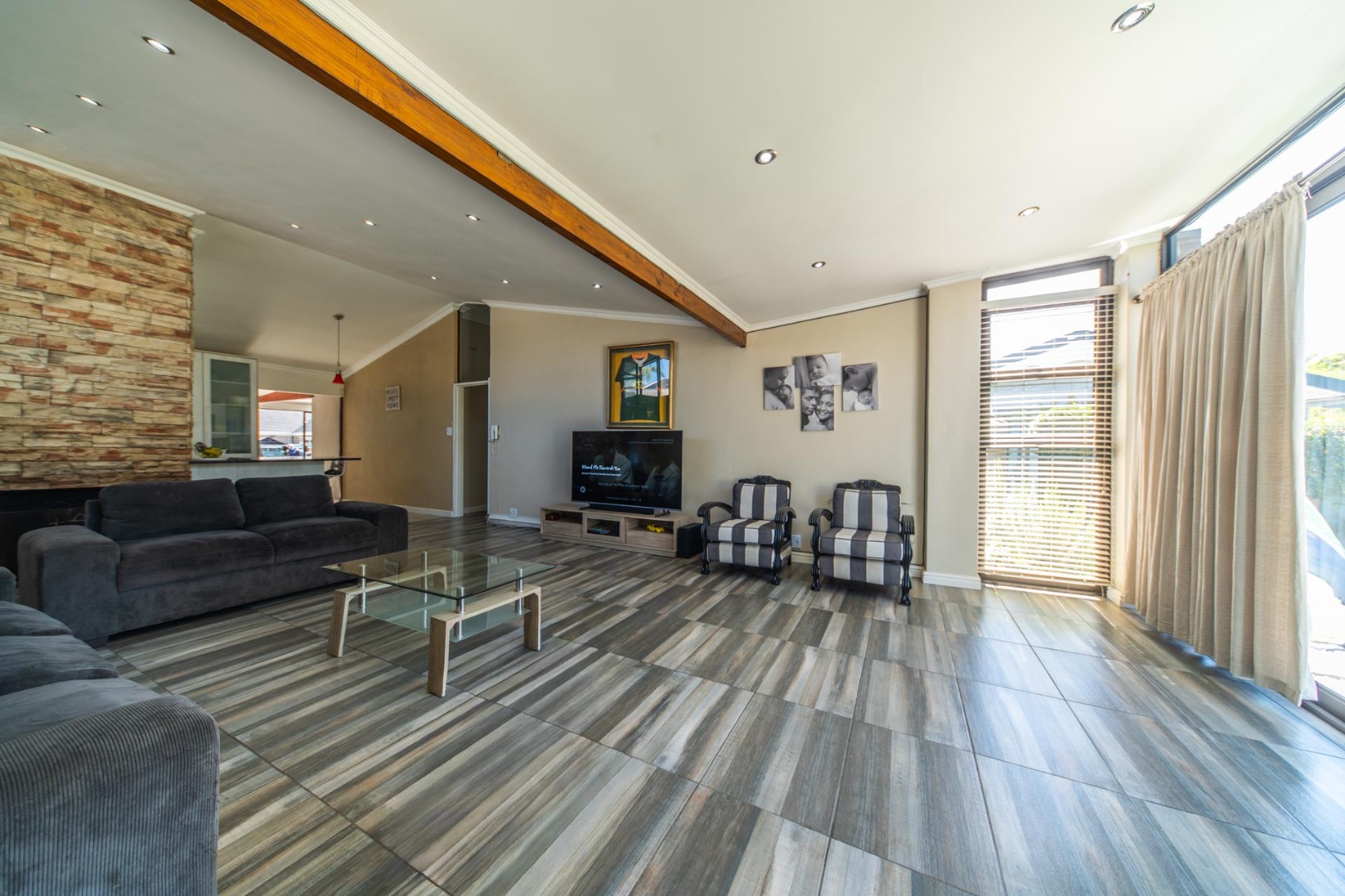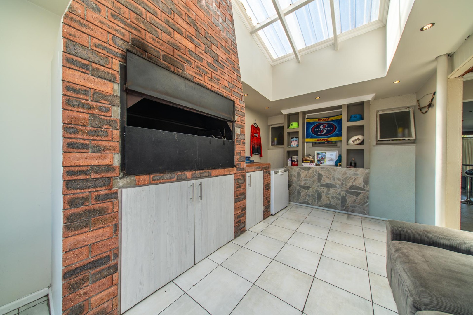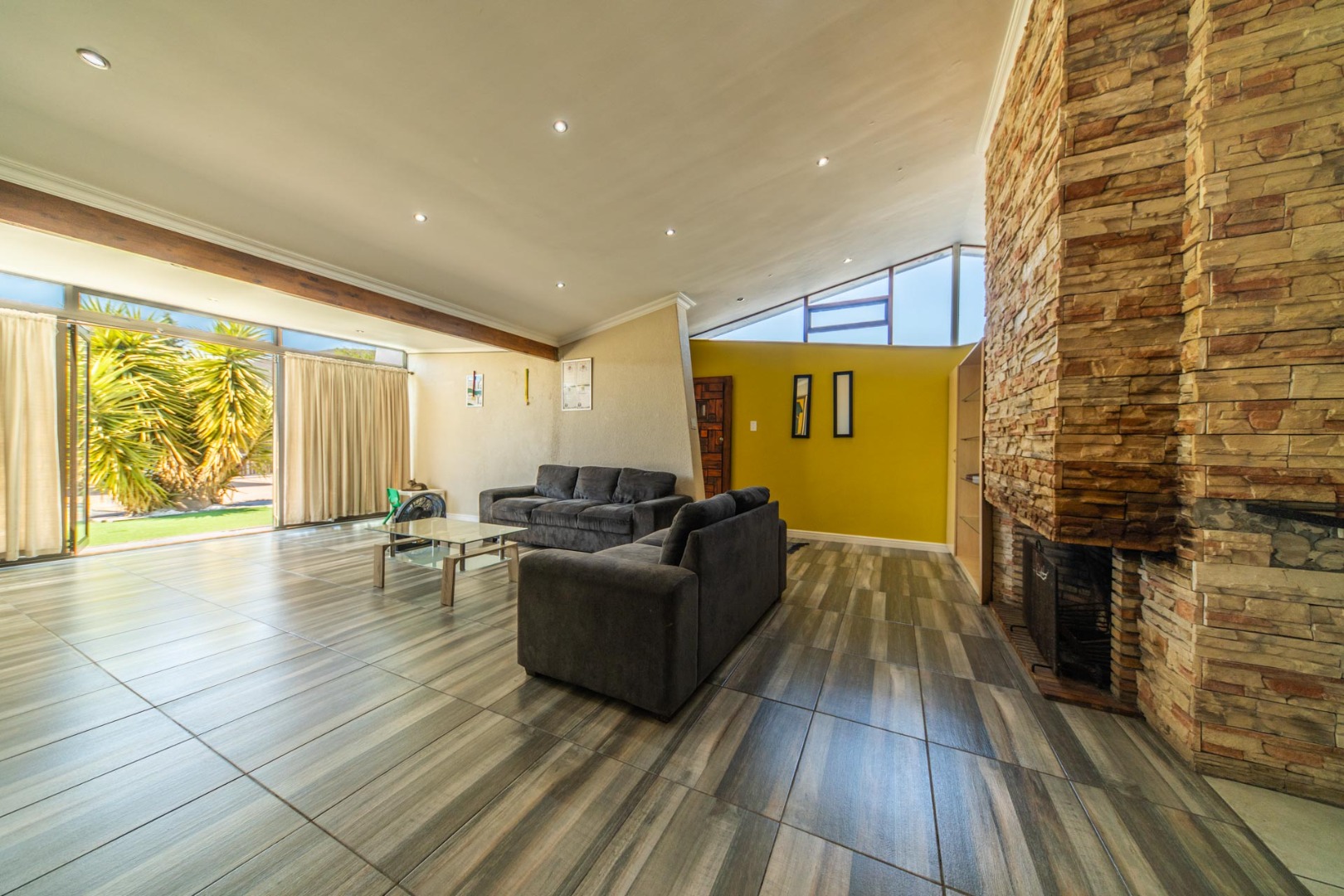 The main house features a large open-plan TV and living area with fireplace, opening via sliding doors to a sparkling swimming pool and garden. The open-plan kitchen flows into the living spaces, with a separate dining and braai room leading to the backyard.