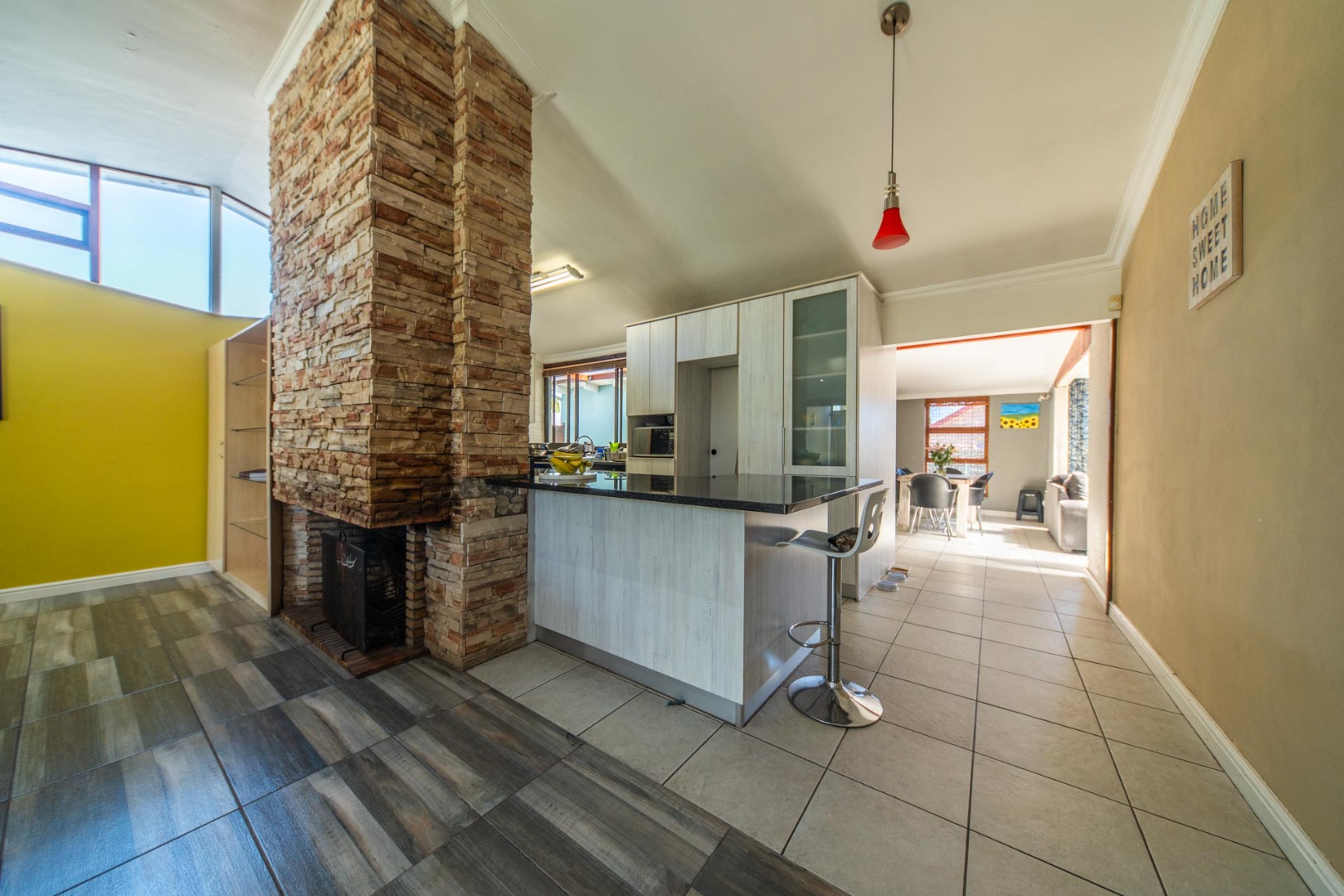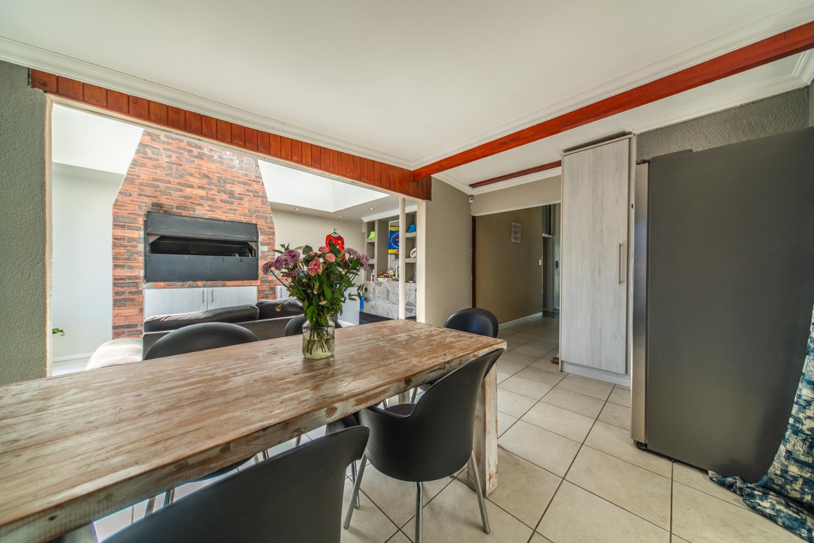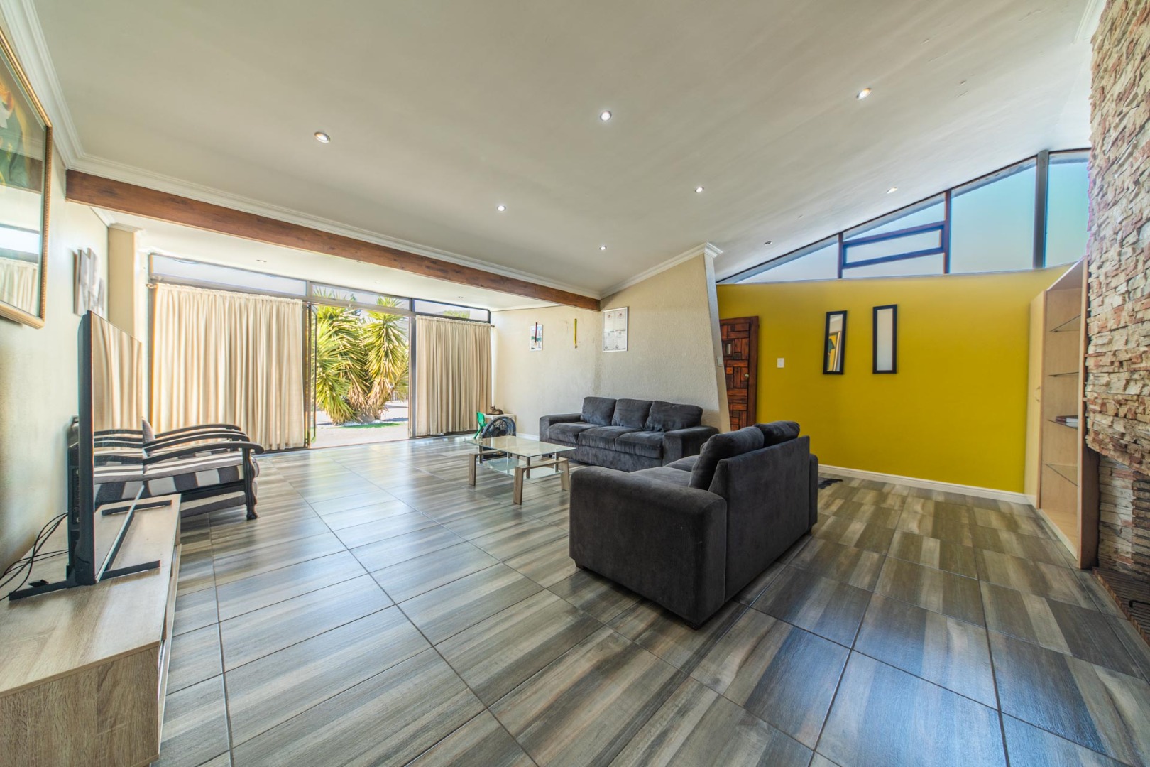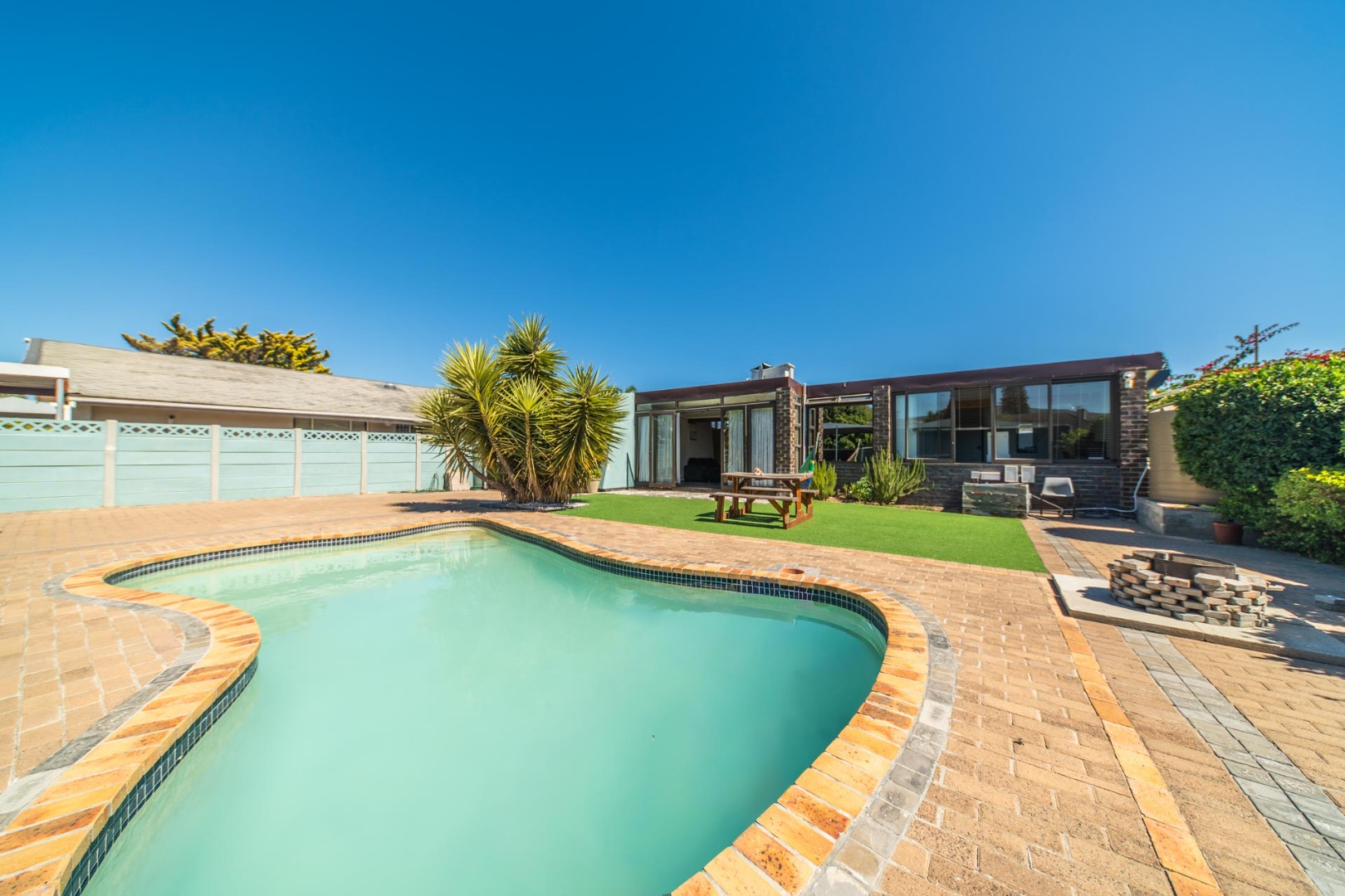 The main house features a large open-plan TV and living area with fireplace, opening via sliding doors to a sparkling swimming pool and garden. The open-plan kitchen flows into the living spaces, with a separate dining and braai room leading to the backyard.